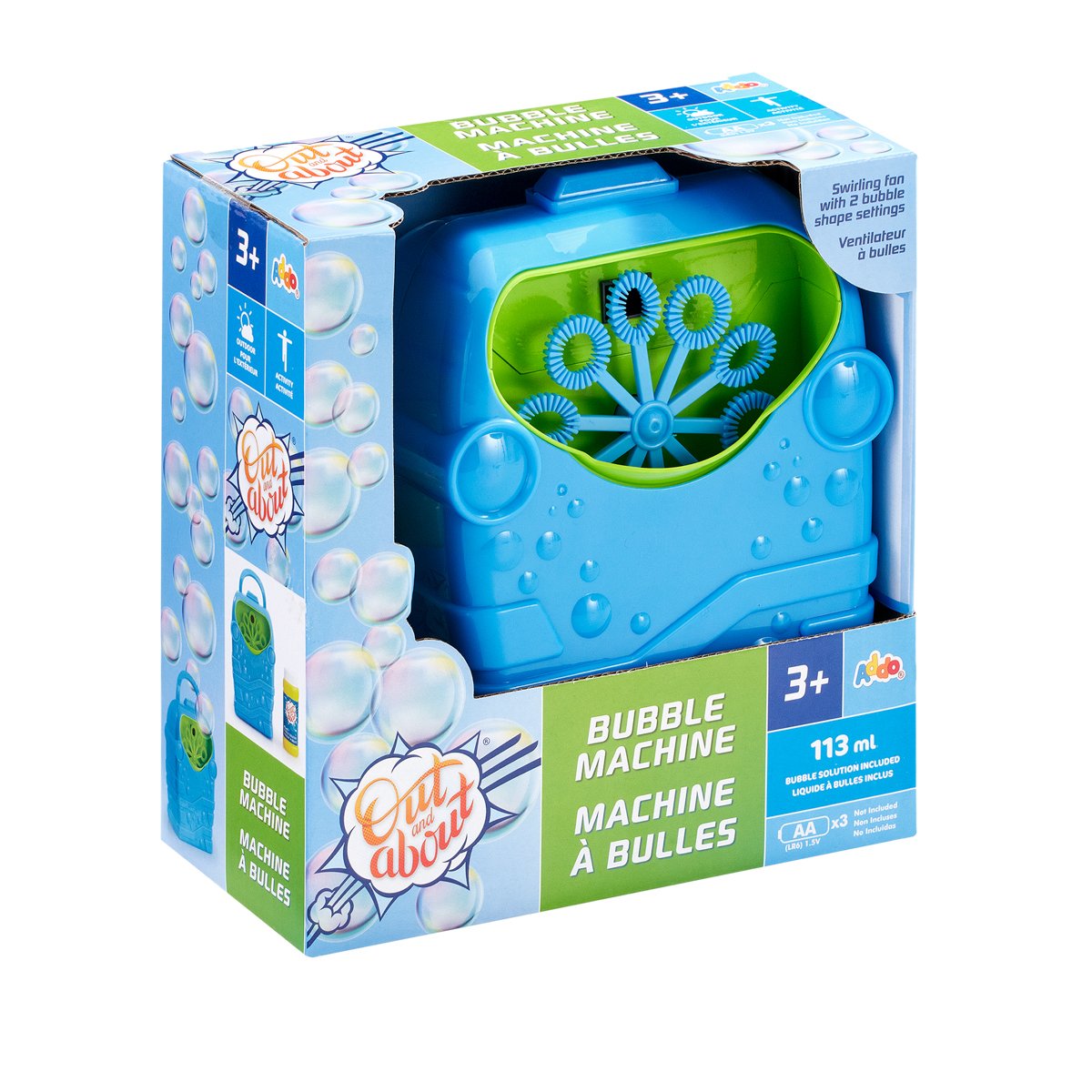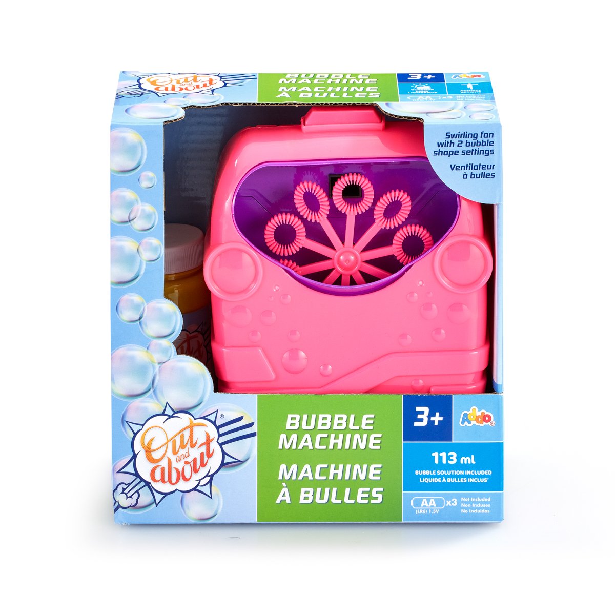 S tímto automatickým výrobníkem bublin ADDO si užijete spoustu zábavy po celé léto. Jednoduše nalijte přiložený bublinkový roztok do strojku a stiskněte tlačítko. Deset kruhových a oválných bublinkových hůlek se začne otáčet a vy si budete moci užívat nekonečný proud kouzelných bublin! Funguje na baterie: 3xAA (nejsou součástí balení). Obsahuje náplň do bublifuku – 113 ml. V kolekci 2 barevné varianty. Assort je náhodný mix druhů. Výběr nelze ovlivnit. Rozměry balení: 18,8 x 18,5 x 9,2 cm. Věk: 3+