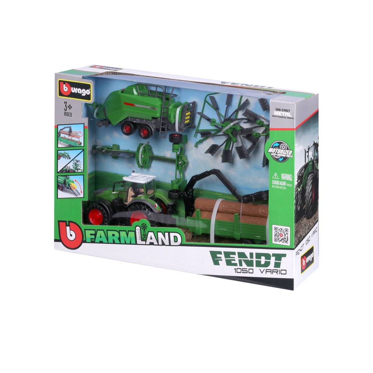 Modely traktorů se setrvačníkem v dárkové sadě s třemi přívěsy z kolekce Farmland jsou sbírkou modelů s vysokým důrazem na přesnost detailů. Modely o velikosti 10 cm jsou vyrobeny z litého kovu s plastovými detaily. Set FENDT 1050 VARIO obsahuje model traktoru, přívěs pro přepravu dřeva s nakladačem, přívěs s rotačními hráběmi a přívěs s balíkovačkou sena. Baleno v krabičce. Nevhodné pro děti do 3 let. Rozměry balení: 21,6 x 31,8 x 9,1 cm. Věk: 3+