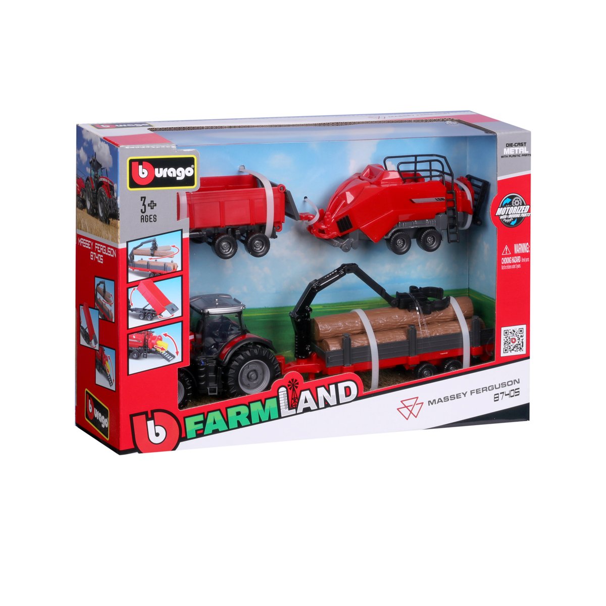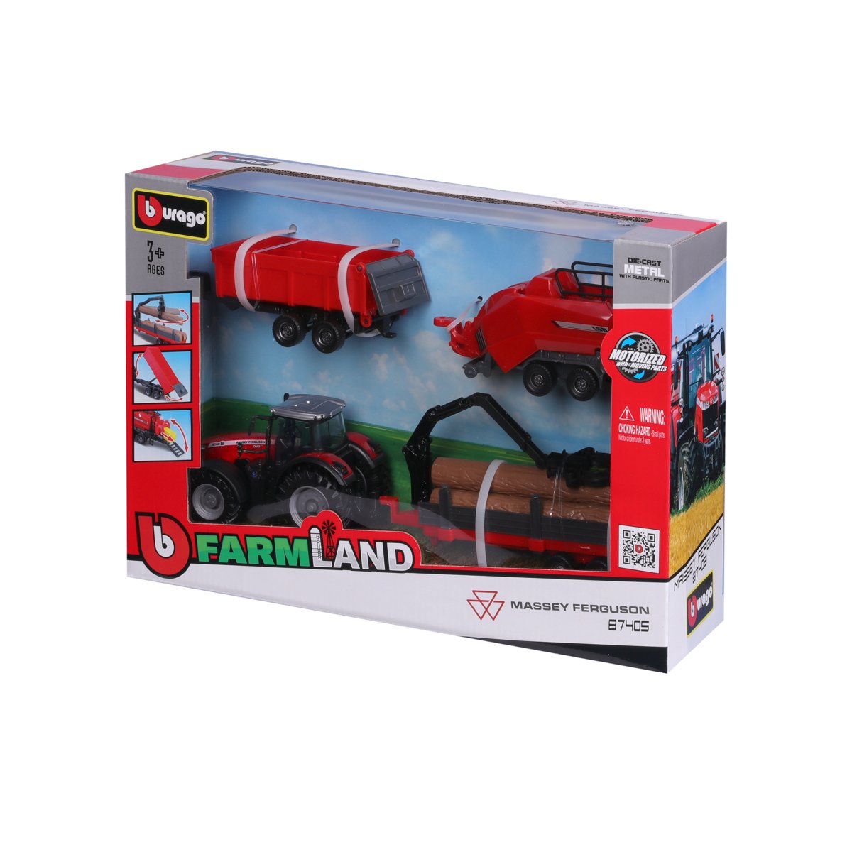 Modely traktorů se setrvačníkem v dárkové sadě se třemi přívěsy z kolekce Farmland jsou sbírkou modelů s vysokým důrazem na přesnost detailů. Modely o velikosti 10 cm jsou vyrobeny z litého kovu s plastovými detaily. Set Massey Ferguson 8740S obsahuje model traktoru, vyklápěcí přívěs, přívěs pro přepravu dřeva s nakladačem a přívěs s balíkovačkou sena. Baleno v krabičce. Nevhodné pro děti do 3 let. Rozměry balení: 21,6 x 31,8 x 9,1 cm. Věk: 3+