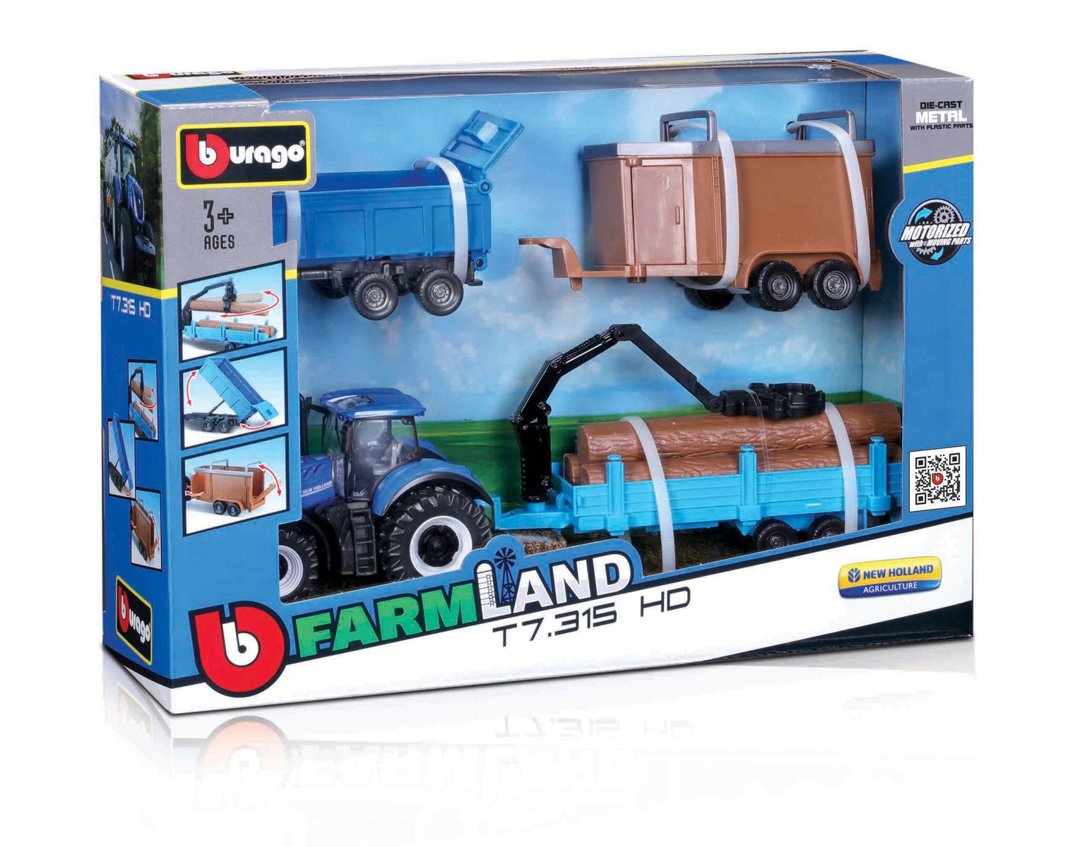 Modely traktorů se setrvačníkem v dárkové sadě se třemi přívěsy z kolekce Farmland jsou sbírkou modelů s vysokým důrazem na přesnost detailů. Modely o velikosti 10 cm jsou vyrobeny z litého kovu s plastovými detaily. Set New Holland T7.315 HD obsahuje model traktoru, vyklápěcí přívěs, přívěs pro přepravu dřeva s nakladačem a přívěs pro přepravu zvířat. Baleno v krabičce. Nevhodné pro děti do 3 let. Rozměry balení: 21,6 x 31,8 x 9,1 cm. Věk: 3+