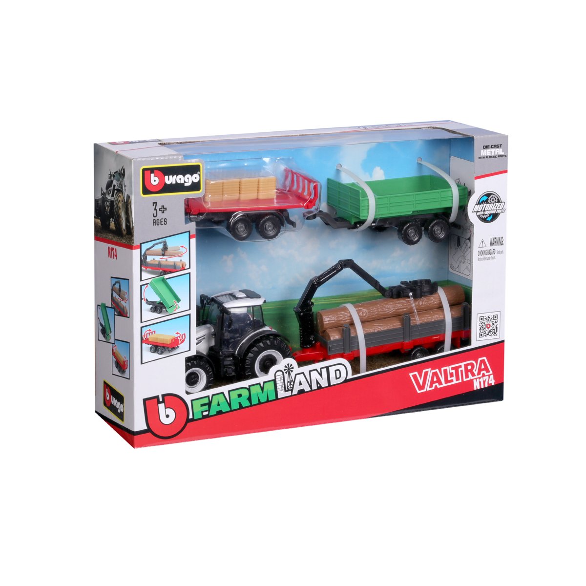 Modely traktorů se setrvačníkem v dárkové sadě se třemi přívěsy z kolekce Farmland jsou sbírkou modelů s vysokým důrazem na přesnost detailů. Modely o velikosti 10 cm jsou vyrobeny z litého kovu s plastovými detaily. Set Valtra N174 obsahuje model traktoru, vyklápěcí přívěs, přívěs pro přepravu dřeva s nakladačem a přívěs pro přepravu balíků sena. Baleno v krabičce. Nevhodné pro děti do 3 let. Rozměry balení: 21,6 x 31,8 x 9,1 cm. Věk: 3+