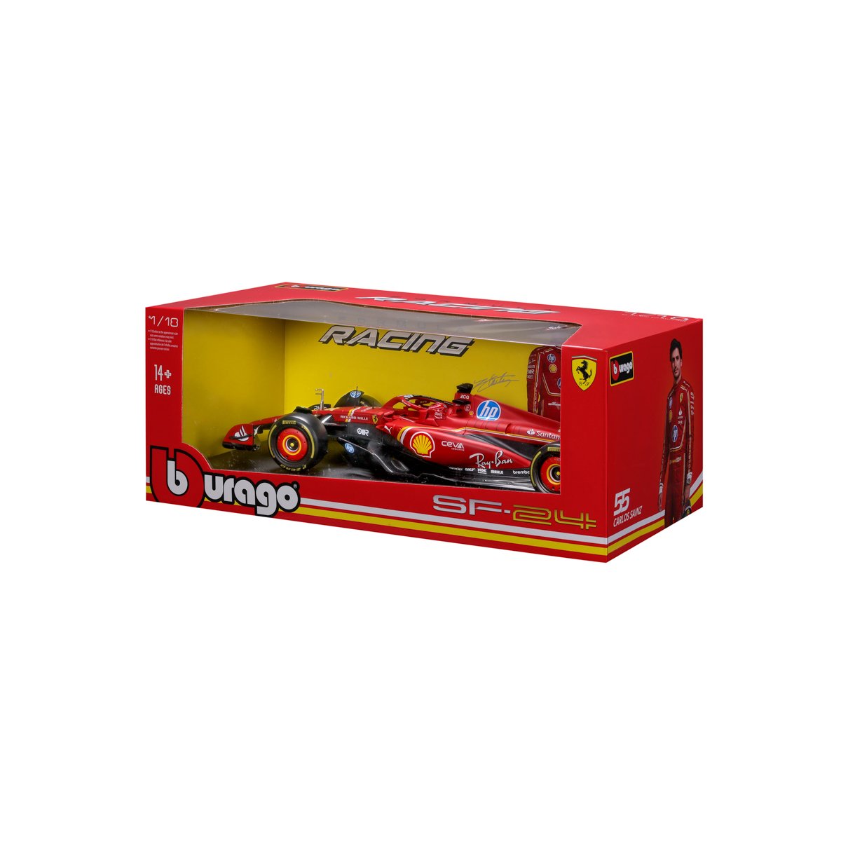 Bburago modely závodních vozů Formule 1 v měřítku 1:18 z kolekce FORMULA RACING jsou sbírkou krásného designu s vysokým důrazem na přesnost detailů včetně helmy jezdce. Modely F1 ze stáje Ferrari SF-24 (2024) jsou vyrobeny z litého kovu s plastovými detaily. Každý z modelů je v klasickém závodním designu a se závodním číslem. Baleno v krabičce. Nevhodné pro děti do 3 let. Rozměry balení: 13,8 x 35 x 18,5 cm. Věk: 14+