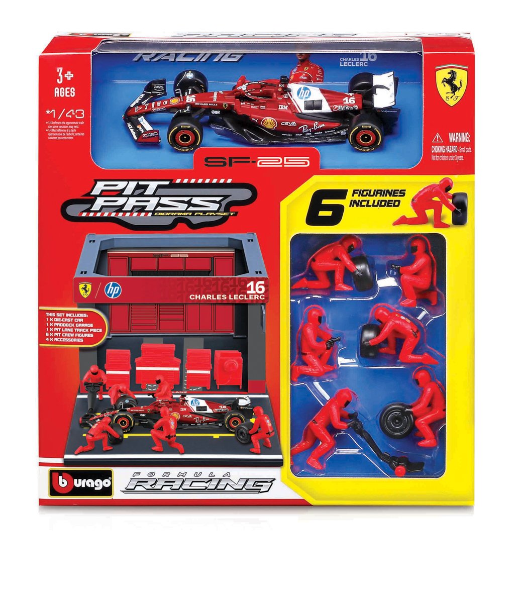 Bburago Pit Pass Diorama Playset v měřítku 1:43 z kolekce Formula Racing přináší fanouškům F1 autentický zážitek ze zákulisí závodů. Model formule Ferrari SF-25 (2025) v ikonickém červeném designu je doplněn kompletním zázemím boxů se šestičlennou pit crew, která je připravena na bleskovou zastávku v boxech. Model je vyroben z litého kovu s plastovými detaily. Plastová paddock garáž s pit lane dotváří realistickou atmosféru závodního dne a umožňuje vytvořit dynamickou scénu přímo z prostředí F1. Obsah setu: 1x model vozu F1 v měřítku 1:43, 6x figurka pit crew, 1x paddock garáž s pit lane, 4x doplněk. Set je skvělým sběratelským kouskem a dárkem pro každou příležitost. Nevhodné pro děti do 3 let. Baleno v krabičce. Rozměry balení:. Věk: 3+