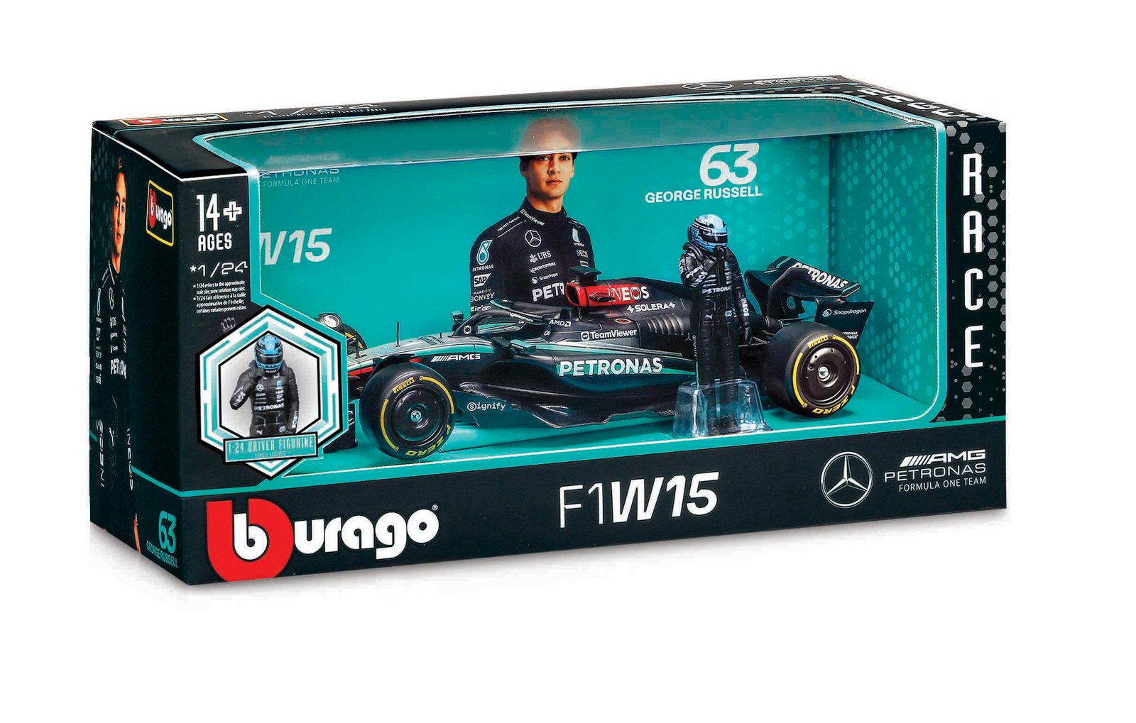 Bburago - RACE F1 s figurkou jezdce, Mercedes-AMG Petronas W15 (2024), #63 George Russell, 1:24