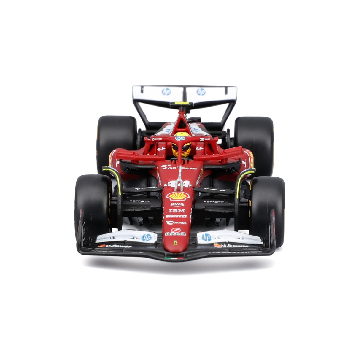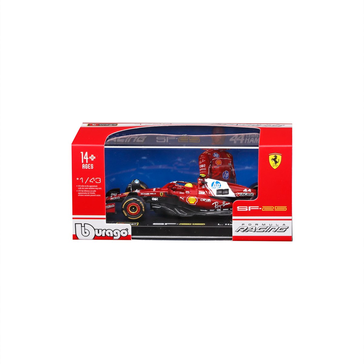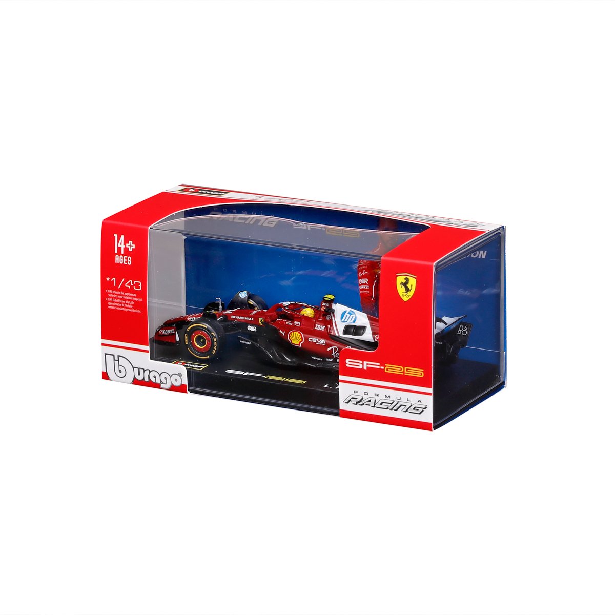 Bburago modely závodních vozů Formule 1 v měřítku 1:43 z kolekce FORMULA RACING jsou sbírkou krásného designu s vysokým důrazem na přesnost detailů. Formule ze stáje Ferrari SF-25 (2025) s autentickými detaily závodního vozu a helmy jezdce. Modely jsou vyrobeny z litého kovu s plastovými detaily. Každý z modelů v klasickém závodním designu je umístěn v dekorativním akrylovém boxu. Díky dekorativnímu boxu je tento model skvělým sběratelským kouskem a dárkem pro každou příležitost. Nevhodné pro děti do 3 let. Rozměry balení: 6,7 x 14,7 x 7,5 cm. Věk: 14+