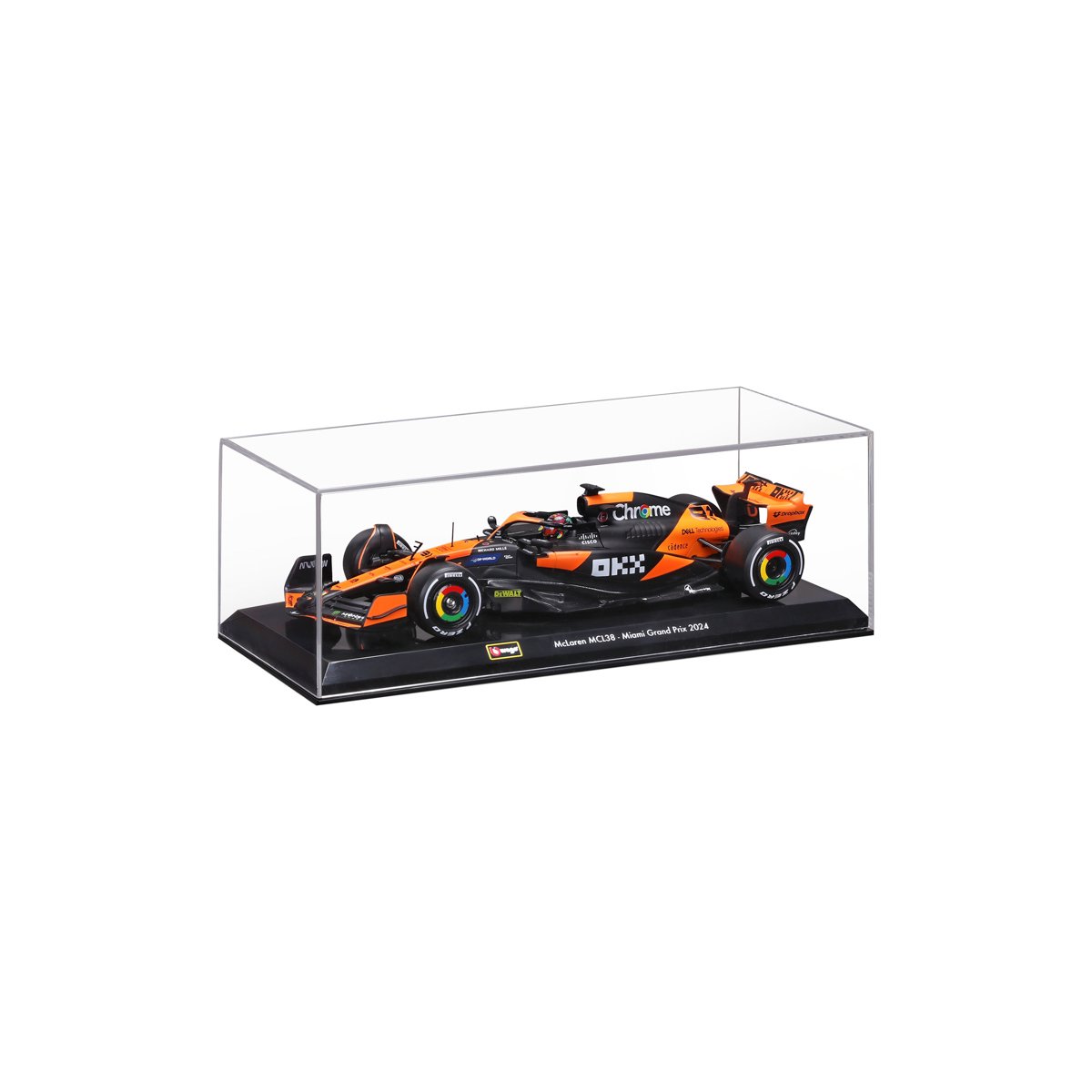 Bburago modely závodních vozů Formule 1 v měřítku1:24 z kolekce RACE jsou sbírkou krásného designu s vysokým důrazem na přesnost detailů. Formule ze stáje McLaren MCL38 (2024) s autentickými detaily závodního vozu a helmy jezdce. Modely jsou vyrobeny z litého kovu s plastovými detaily. Každý z modelů v klasickém závodním designu je umístěn v dekorativním akrylovém boxu. Díky dekorativnímu boxu je tento model skvělým sběratelským kouskem a dárkem pro každou příležitost. Nevhodné pro děti do 3 let. Rozměry balení: 11,8 x 26,1 x 8,7 cm. Věk: 14+