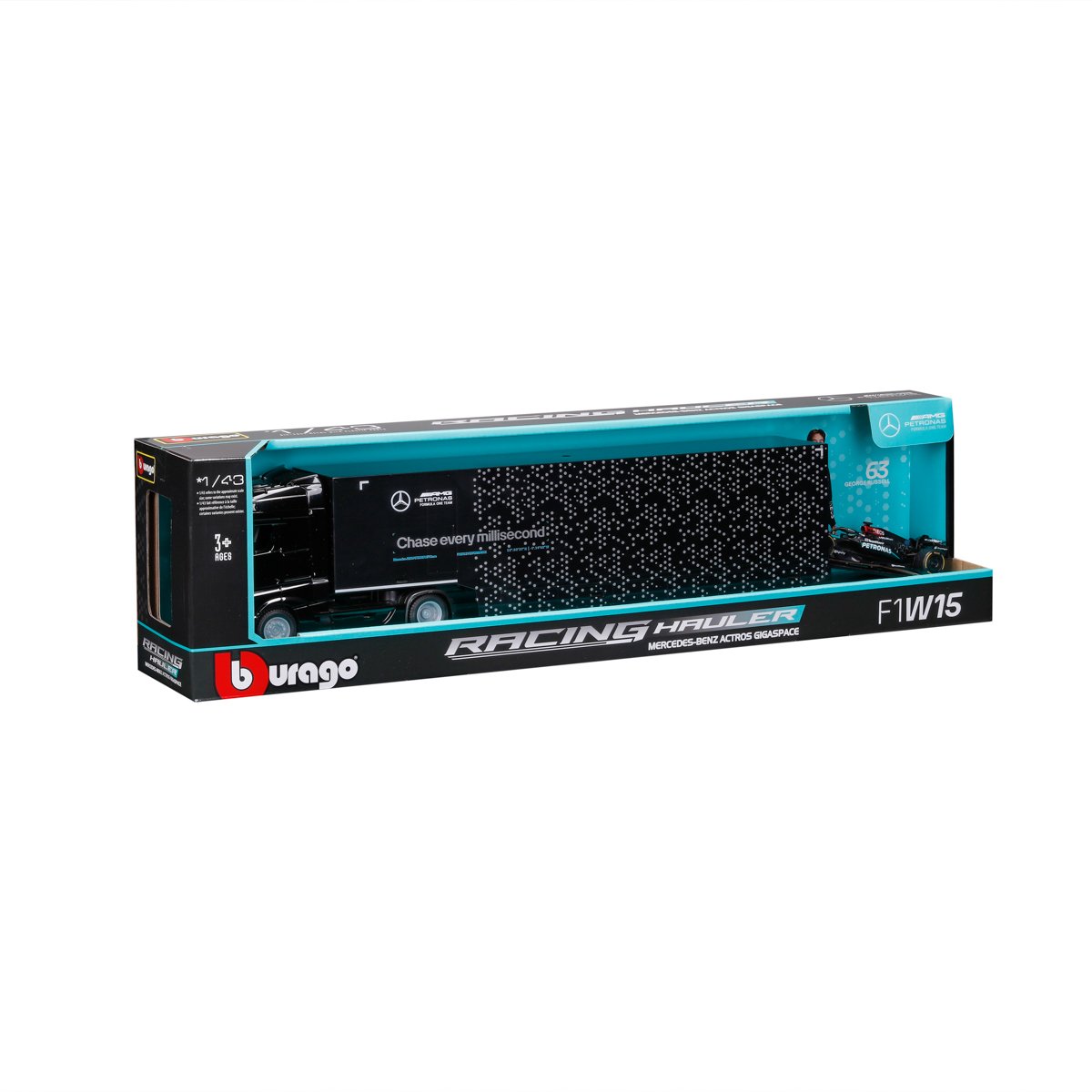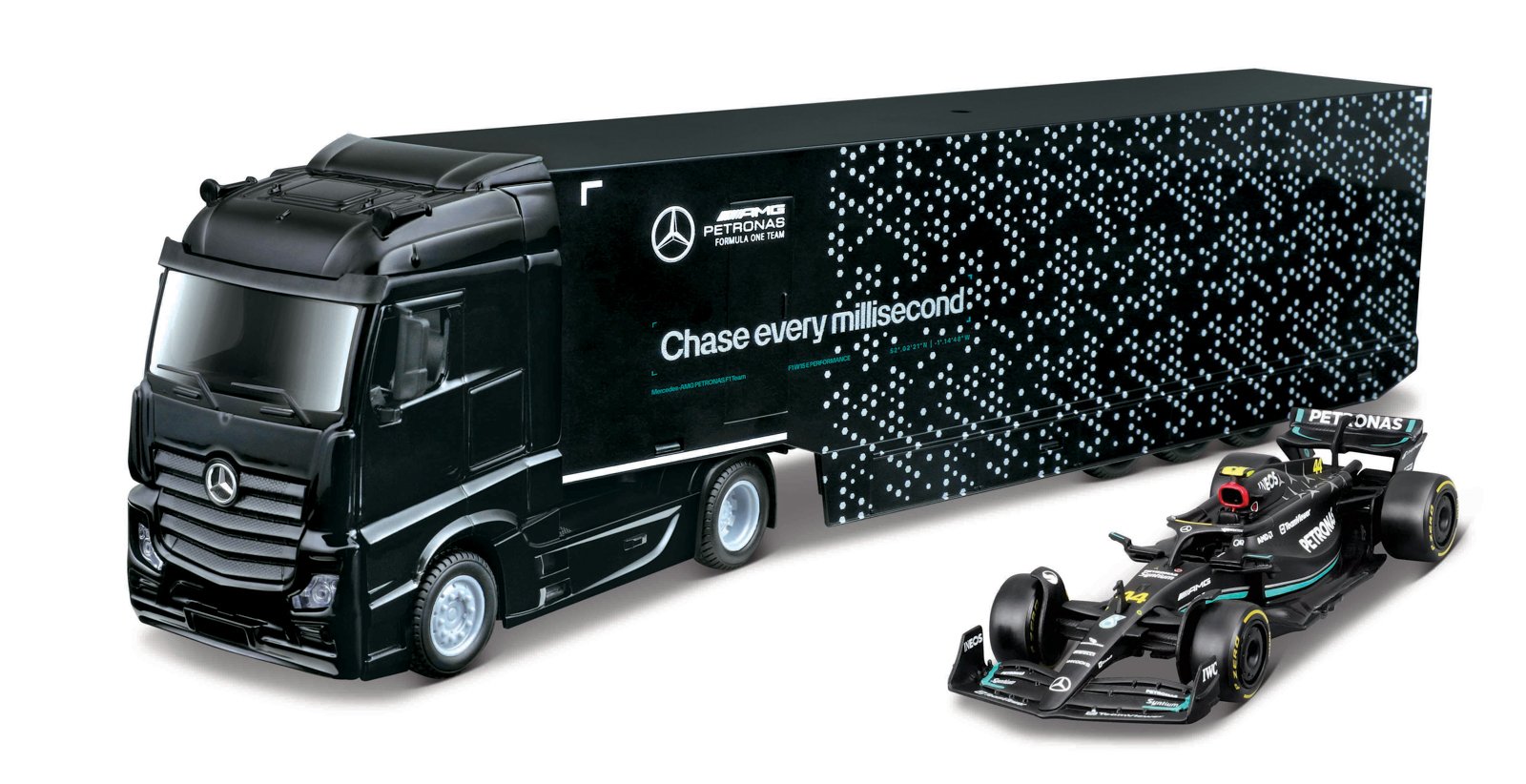 Bburago – RACE M-B Tahač s návěsem + F1 Mercedes-AMG Petronas W15 (2024), #63 George Russell, 1:43