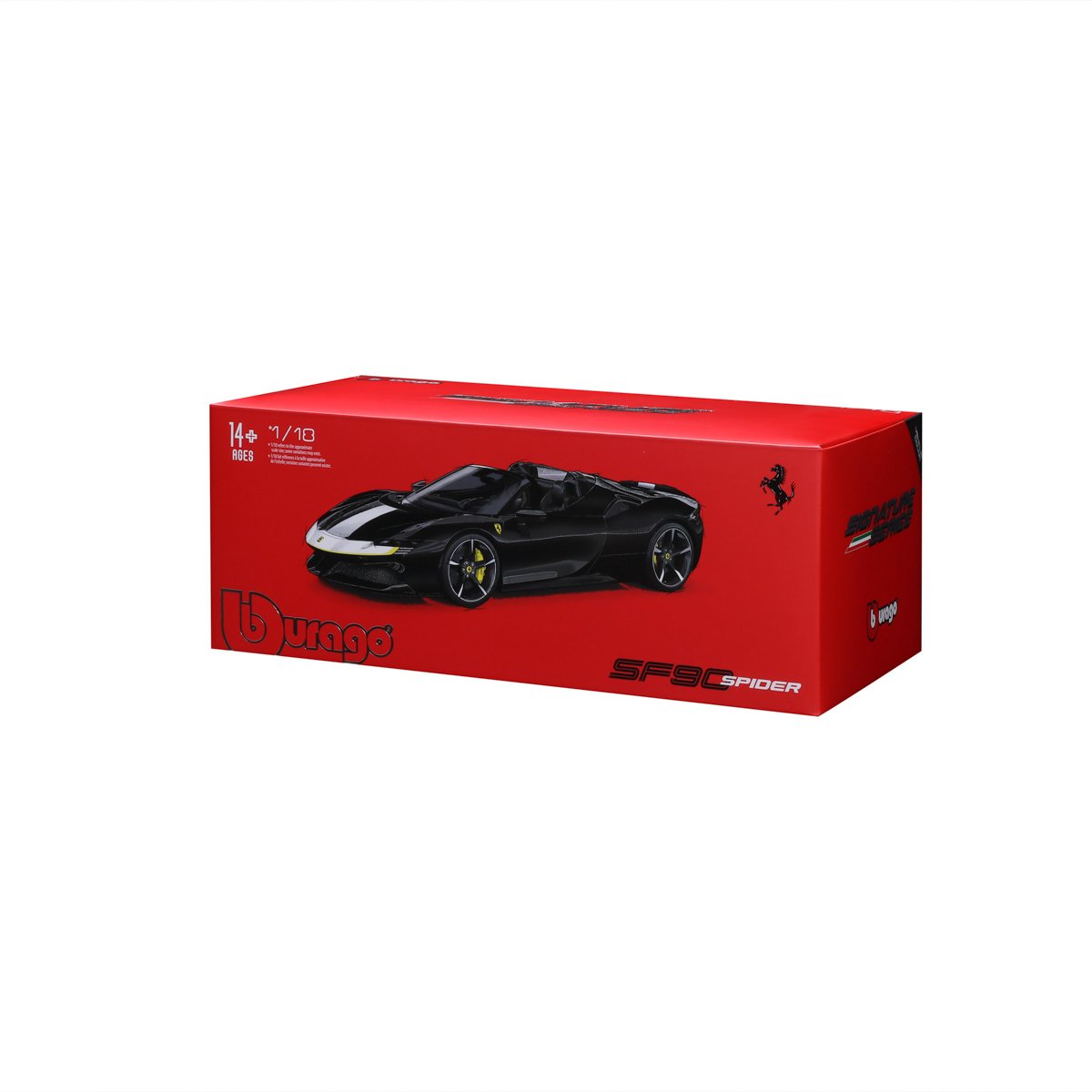 Modely automobilů Ferrari v měřítku 1:18 z kolekce SIGNATURE SERIES jsou sbírkou krásného designu s vysokým důrazem na přesnost detailů. Modely jsou vyrobeny z litého kovu s plastovými detaily. Vysoce detailní provedení motorových prostor, interiéru, kol a odznaků. Většina modelů z kolekce má otevírací dveře, kufr nebo kapotu. Všechny modely v kolekci mají plně funkční řízení a odpružení všech kol. Detailní podvozek se samostatným výfukovým systémem. Modely se vyznačují vynikající kvalitou laku. Baleno v unikátní sběratelské krabičce. Nevhodné pro děti do 3 let. Rozměry balení: 12,7 x 33,4 x 16,5 cm. Věk: 14+