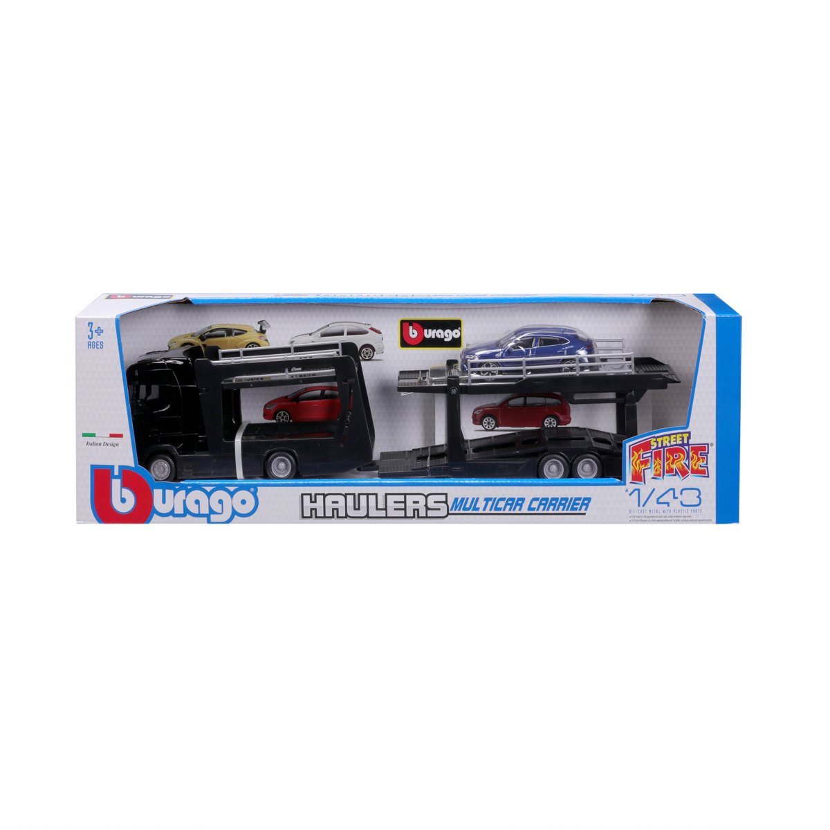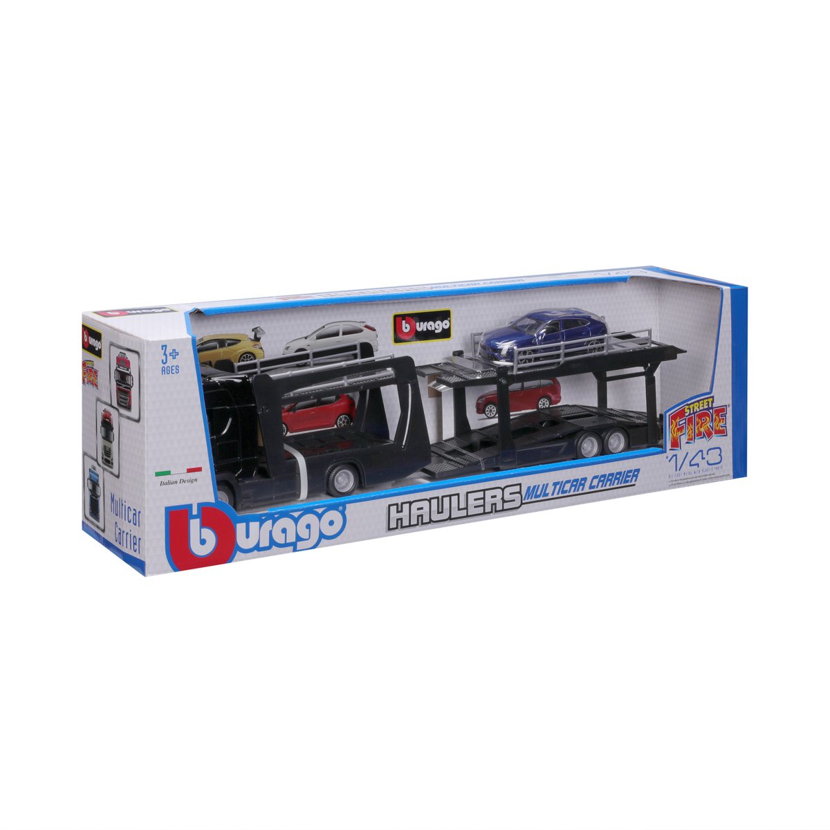 Modely kamionů v měřítku1:43 Multicar Carrier s návěsem pro přepravu aut z kolekce Street Fire jsou sbírkou modelů s vysokým důrazem na přesnost detailů. Modely jsou vyrobeny z litého kovu s plastovými detaily. Každý z kamionů je doplněn jedním modelem osobního automobilu. V přepravním návěsu mohou malí řidiči převážet až pět autíček z kolekce Street Fire. Baleno v krabičce. Nevhodné pro děti do 3 let. Rozměry balení: 15,5 x 52,1 x 11,8 cm. Věk: 3+