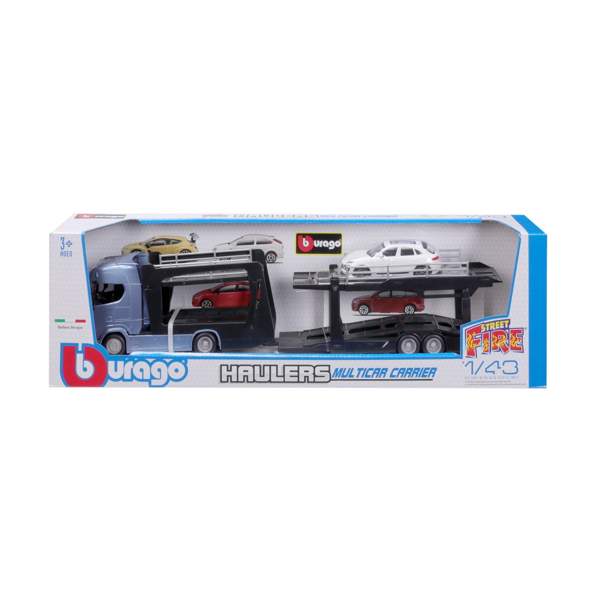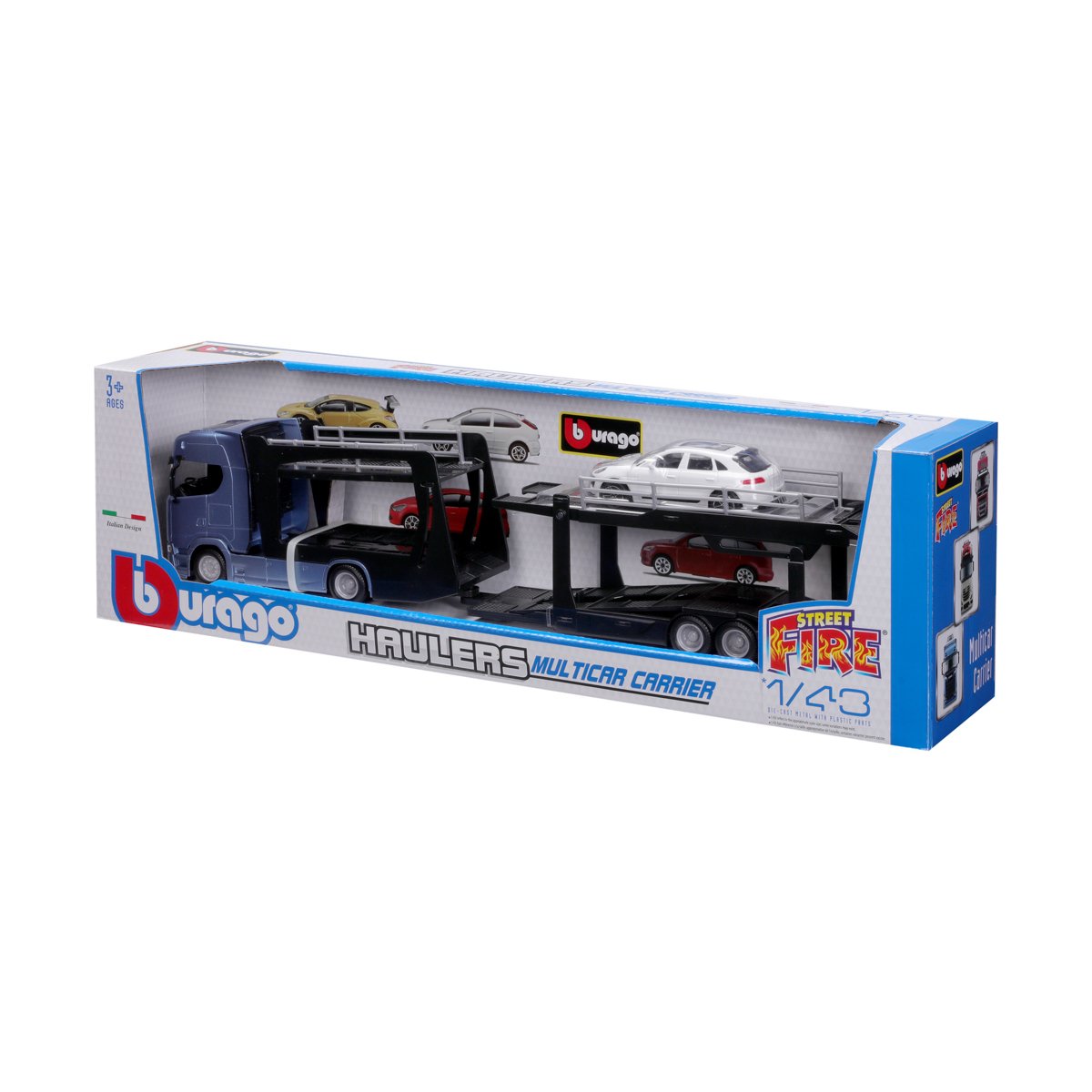 Modely kamionů v měřítku1:43 Multicar Carrier s návěsem pro přepravu aut z kolekce Street Fire jsou sbírkou modelů s vysokým důrazem na přesnost detailů. Modely jsou vyrobeny z litého kovu s plastovými detaily. Každý z kamionů je doplněn jedním modelem osobního automobilu. V přepravním návěsu mohou malí řidiči převážet až pět autíček z kolekce Street Fire. Baleno v krabičce. Nevhodné pro děti do 3 let. Rozměry balení: 15,5 x 52,1 x 11,8 cm. Věk: 3+
