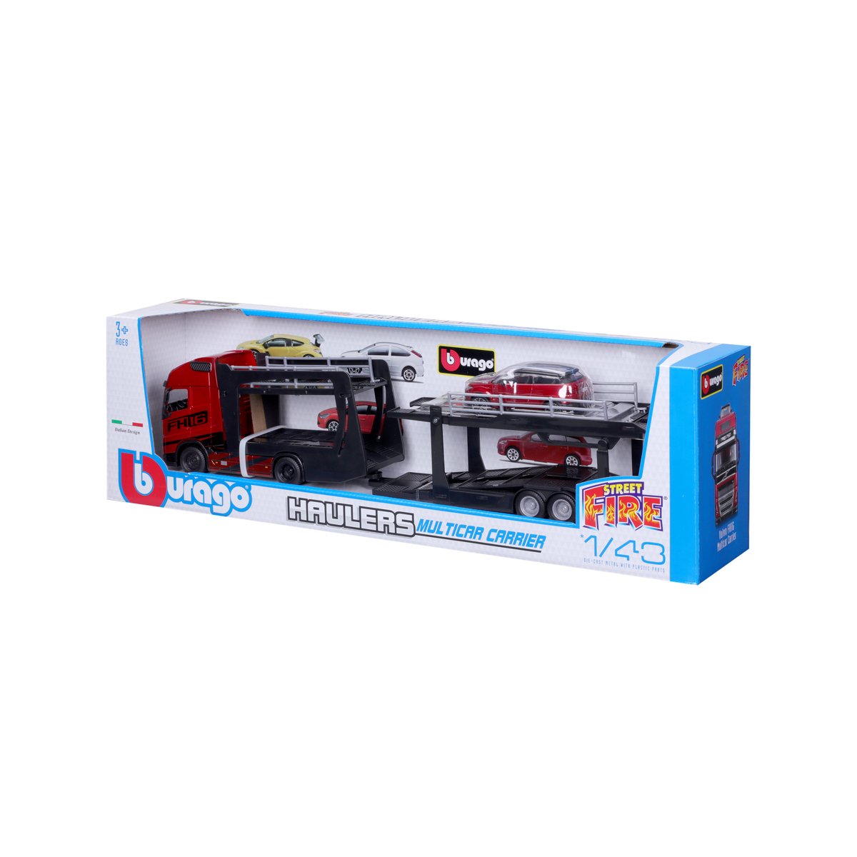 Modely kamionů v měřítku1:43 Multicar Carrier s návěsem pro přepravu aut z kolekce Street Fire jsou sbírkou modelů s vysokým důrazem na přesnost detailů. Modely jsou vyrobeny z litého kovu s plastovými detaily. Každý z kamionů je doplněn jedním modelem osobního automobilu. V přepravním návěsu mohou malí řidiči převážet až pět autíček z kolekce Street Fire. Baleno v krabičce. Nevhodné pro děti do 3 let. Rozměry balení: 15,5 x 52,1 x 11,8 cm. Věk: 3+