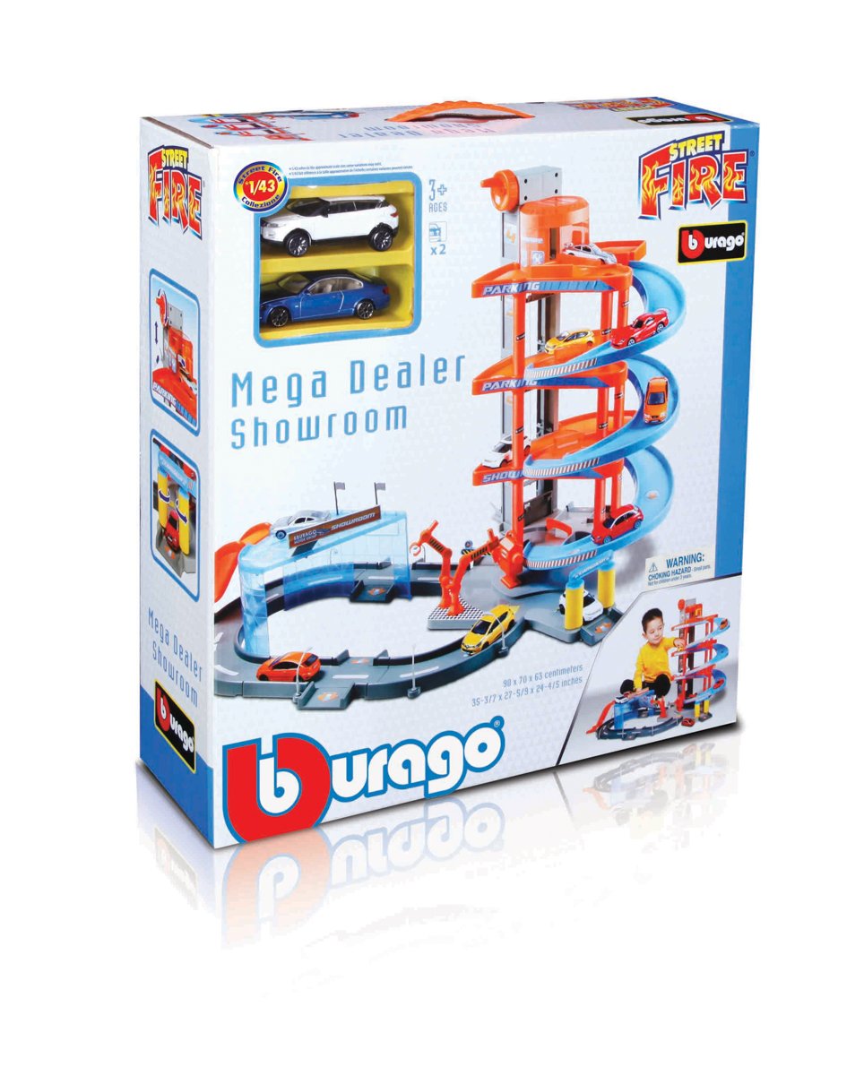 Bburago - STREET FIRE, Velká parkovací herní sada – garáž a showroom se dvěma autíčky, 1:43