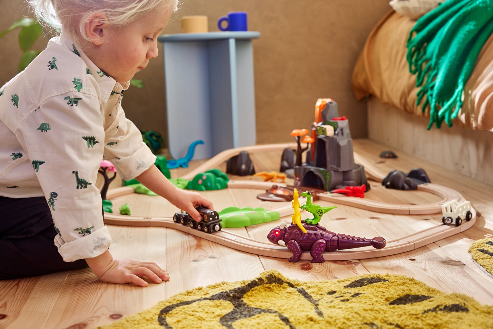 Se sadou Dinosauří útok prorazíte každou překážku. Mohutný dinosaurus, jenž dokonale zapadá do dřevěných vláčkodrah BRIO, ožívá díky červeným svítícím očím a řevu aktivovanému pohybem. Ankylosaurus má pružinový ocas připravený k švihu a dítě jím může povalit dvě barevné figurky velociraptorů, které jsou součástí sady. Magnet ukrytý v ocasu umožňuje tahat vagónky, podobně jako vláčky BRIO. Hračka je součástí řady BRIO World – Svět dinosaurů, kterou musí mít všechny děti milující dinosaury a vláčky. Sada Dinosauří útok obsahuje: 1x figurka ankylosaura, 2x figurka velociraptora, 1x vagon. Baterie: 1x AAA (baterie není součástí balení). Rozměry balení: 15 x 25 x 7,5 cm. Věk: 3+