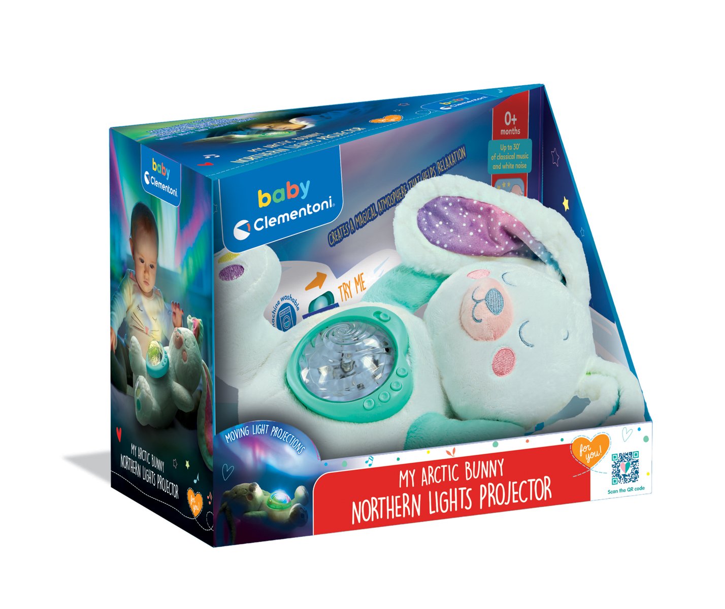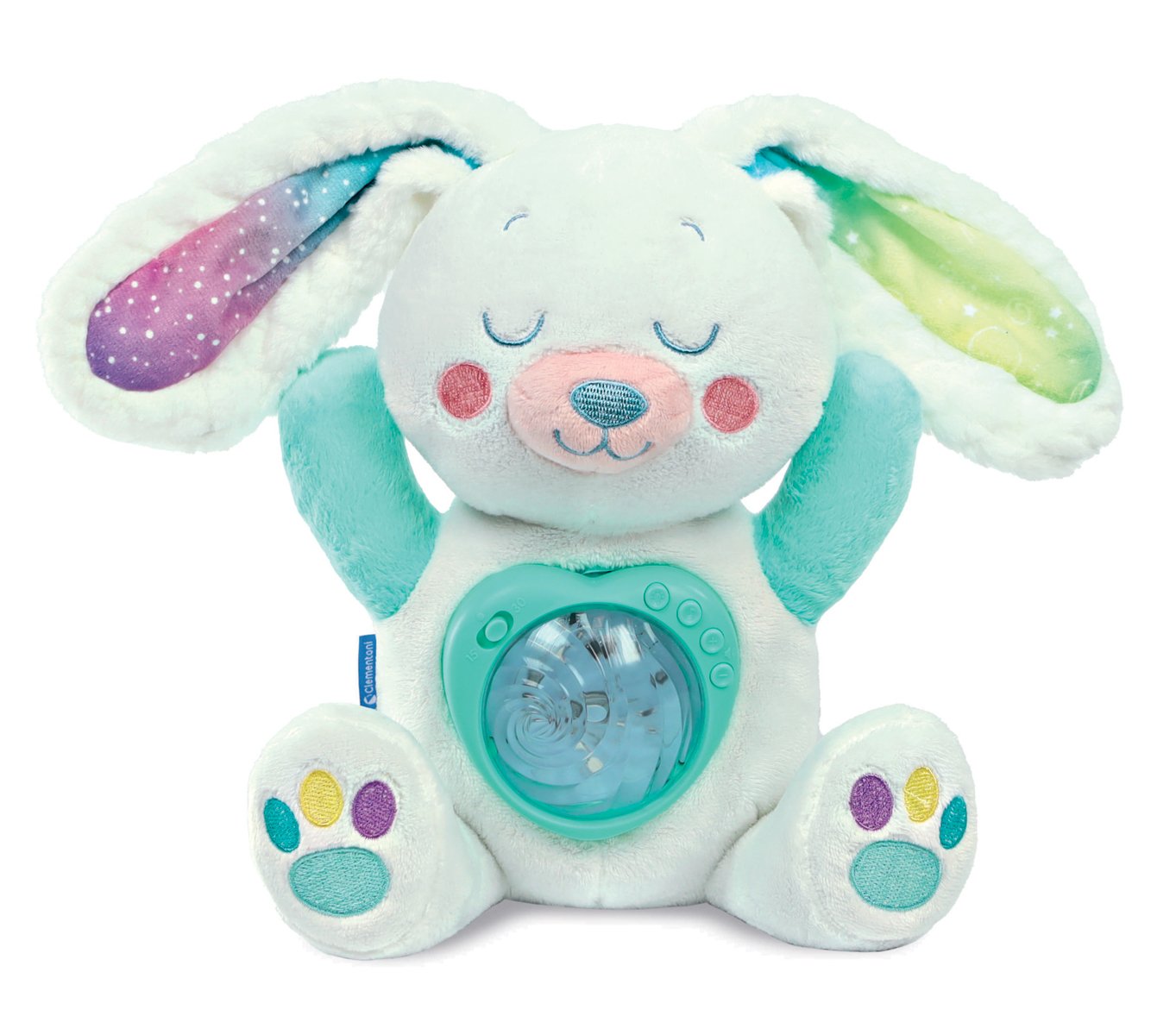 Plyšový arktický králíček od Clementoni Baby vytváří uklidňující atmosféru před spaním tím, že promítá na strop krásnou polární záři. Vestavěný elektronický modul nabízí až 10 různých barev světla, které lze podle potřeby nastavit. Kromě toho roztomilý králíček hraje klasickou hudbu, ukolébavky, přírodní zvuky a bílý šum po dobu až 20 minut. Hlasitost a časovač lze snadno nastavit. Měkoučký plyšový králíček je bezpečným a útulným společníkem pro miminka již od narození. Plyš lze po vyjmutí elektronického modulu vyprat. Baterie: 3 x AAA, jsou součástí. Rozměry balení: 25 x 33 x 17 cm. Věk: 0+