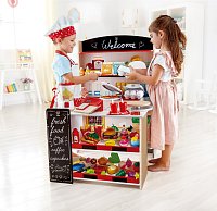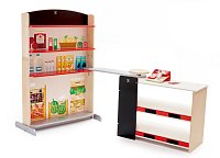 Nádherný dětský obchod s pokladnou a pultem je vyrobený ze dřeva a má všechny důležité doplňky pro hru na prodavače(prodavačku). Svou velikostí je ideálně uzpůsobený výšce dětí. Hračka rozvíjí kreativitu u dětí. V obchodě naleznete velký regál na prodávané zboží, prodejní pult s poličkami na zboží, tabulí, kde křídou můžete zapsat akční ceny a nabídky, pokladnu se skenerem, platebním terminálem a platební kartou. Pokladna vydává zvuk a skener se při snímání kódu rozsvítí. Vyrobeno z kvalitního a
