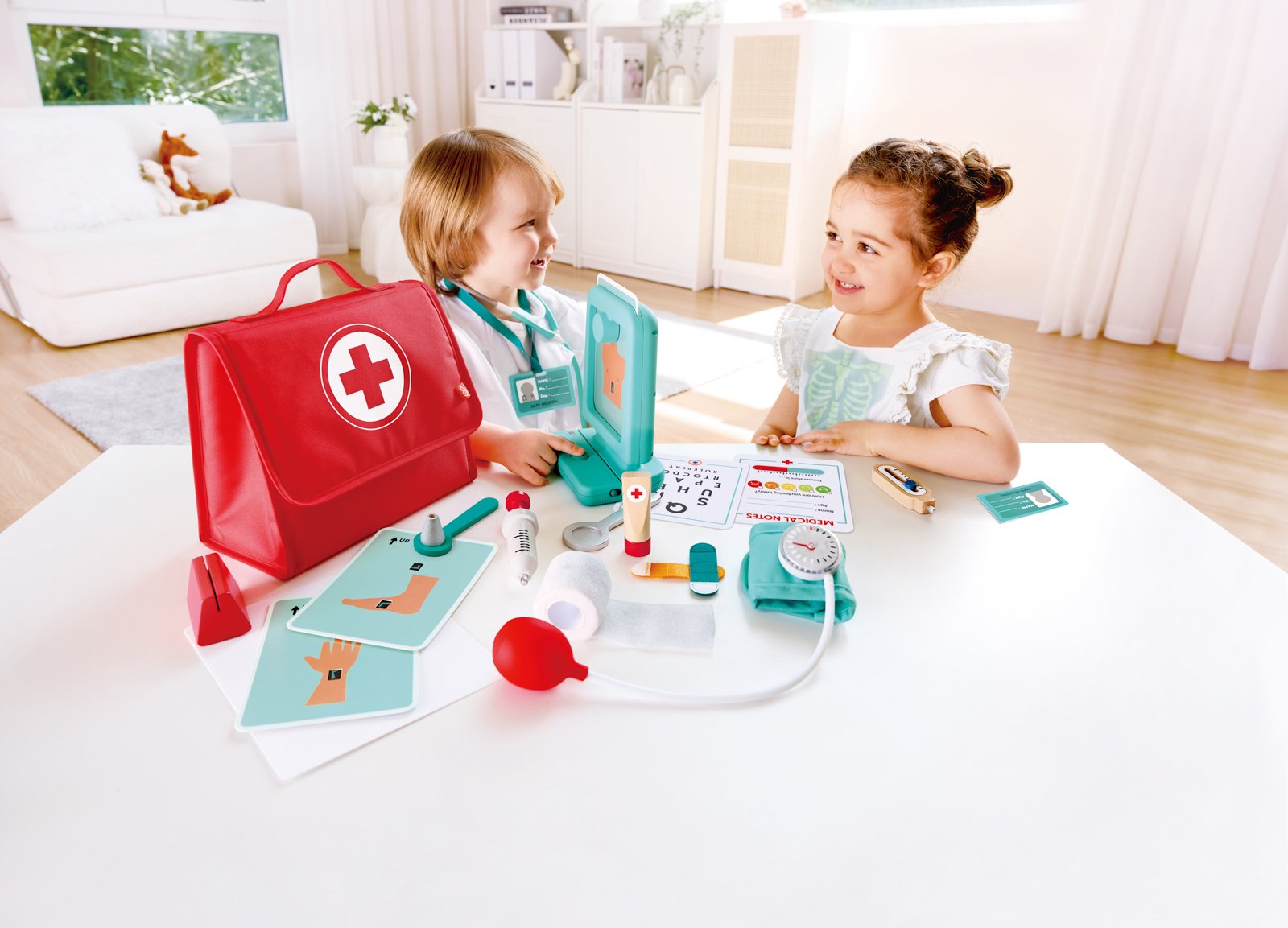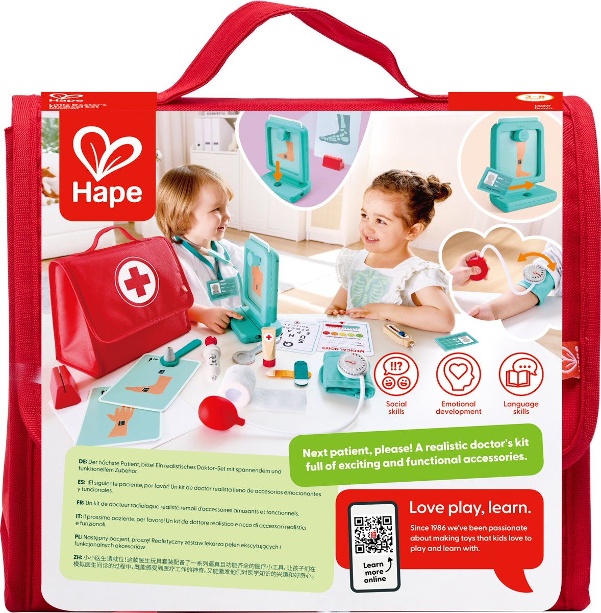 Vzdělávací hrací sada Malý lékař je plná funkčních doplňků a přináší dětem zábavnou hru na profese. Obsahuje realistické nástroje, jako je rentgen, stetoskop a teploměr, které podněcují nápaditou hru na profese a zároveň učí důležitým životním dovednostem. Hravou formou učí děti poznávat roli lékaře, rozvíjí empatii, zodpovědnost a důležité životní dovednosti, a zároveň pomáhá odbourávat případné obavy z návštěvy u doktora. Jasné barvy a praktické činnosti stimulují dětské smysly i motoriku a přispívají k rozvoji kognitivních schopností. Hraním rolí si děti procvičí jazykové a komunikační dovednosti během rozhovorů se „svými pacienty“. Sada obsahuje 22 dílů včetně lékařské brašny. Baterie: 2 x AAA, nejsou součástí. Rozměry balení: 21 x 26 x 7 cm. Věk: 3+