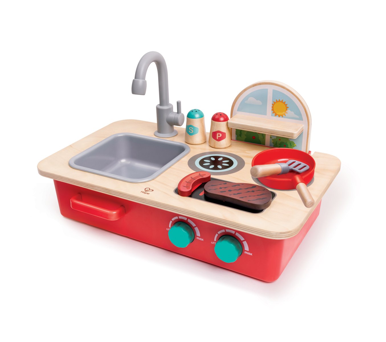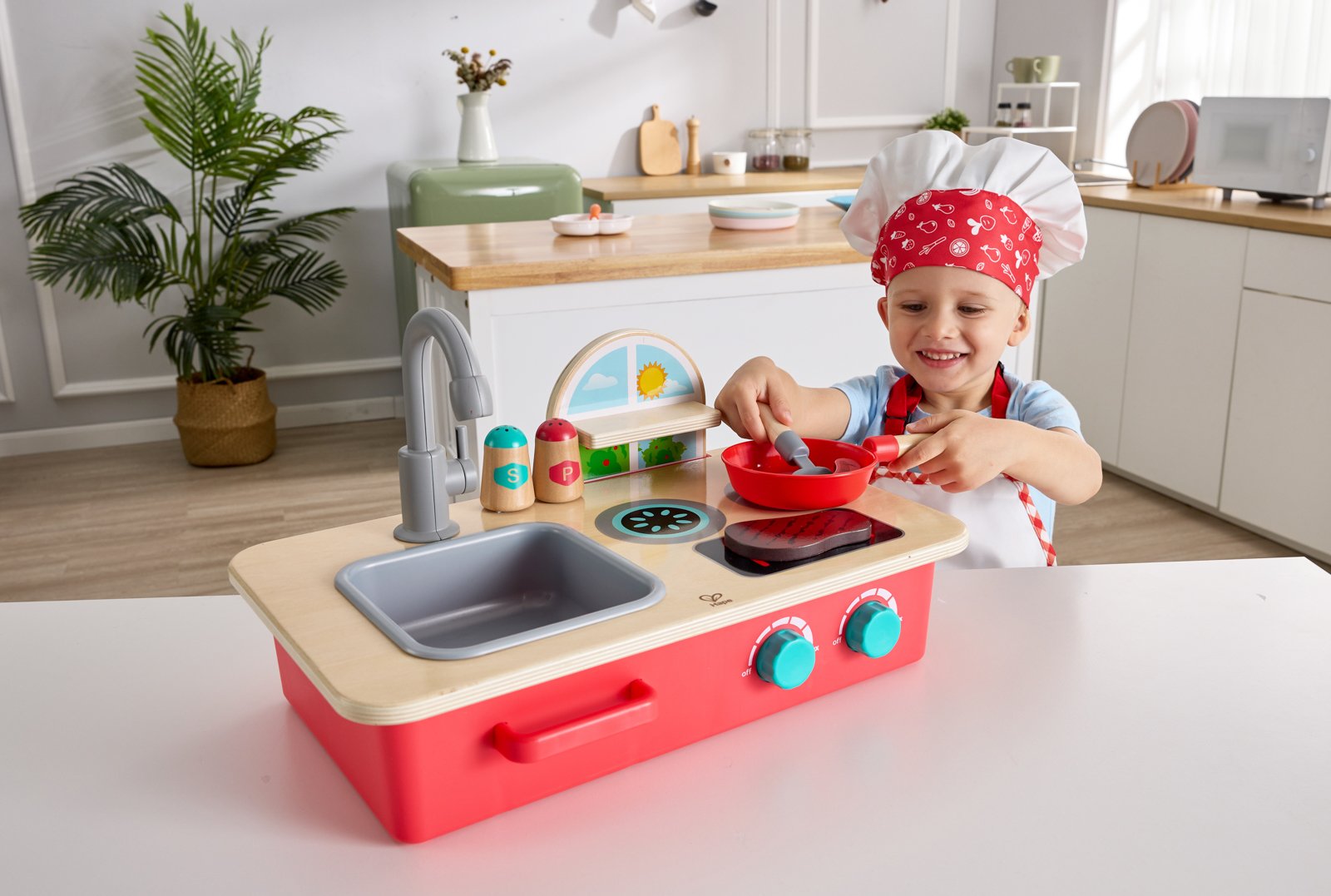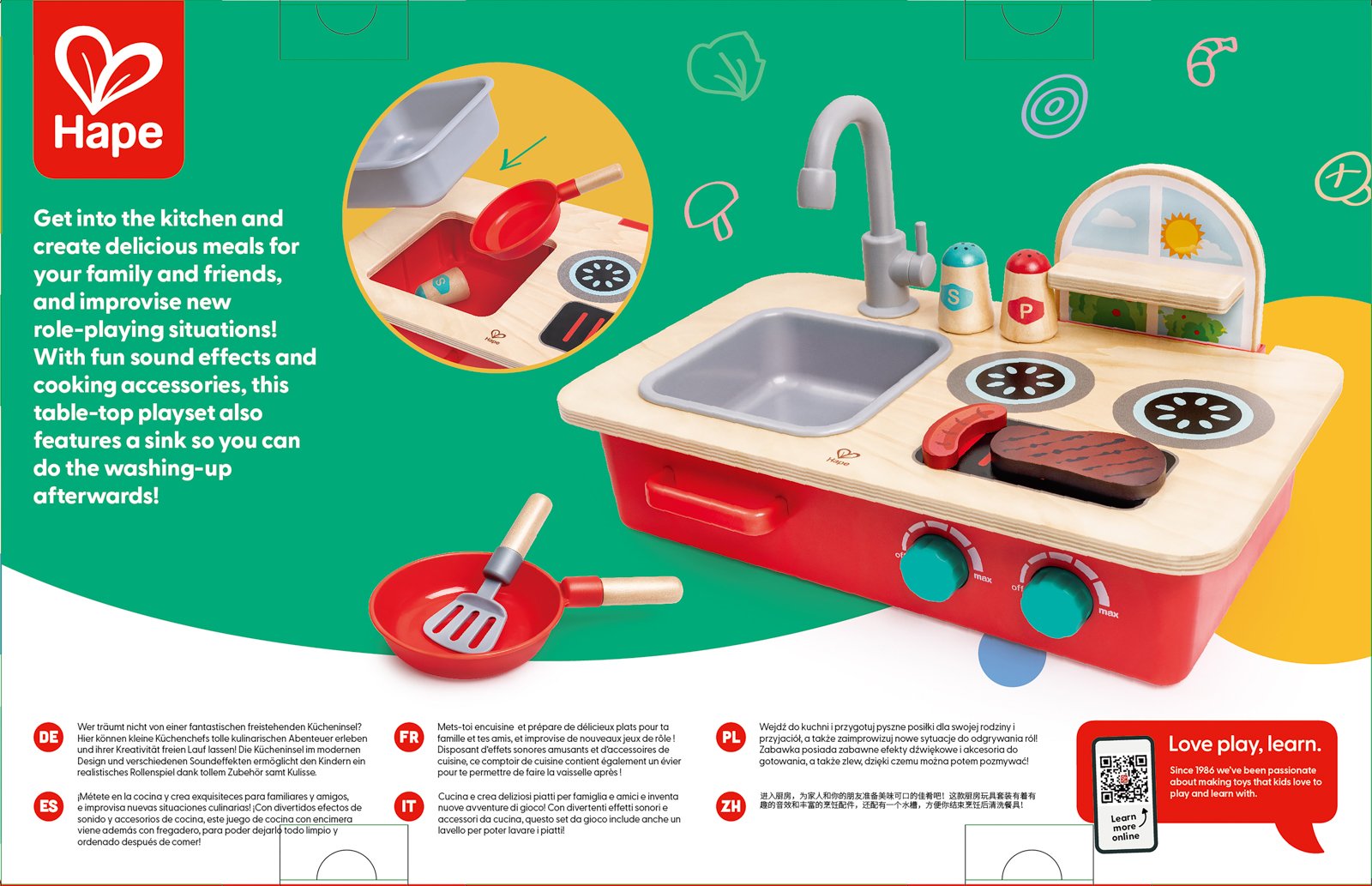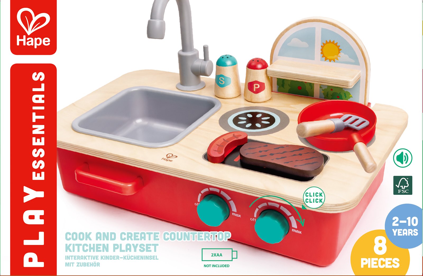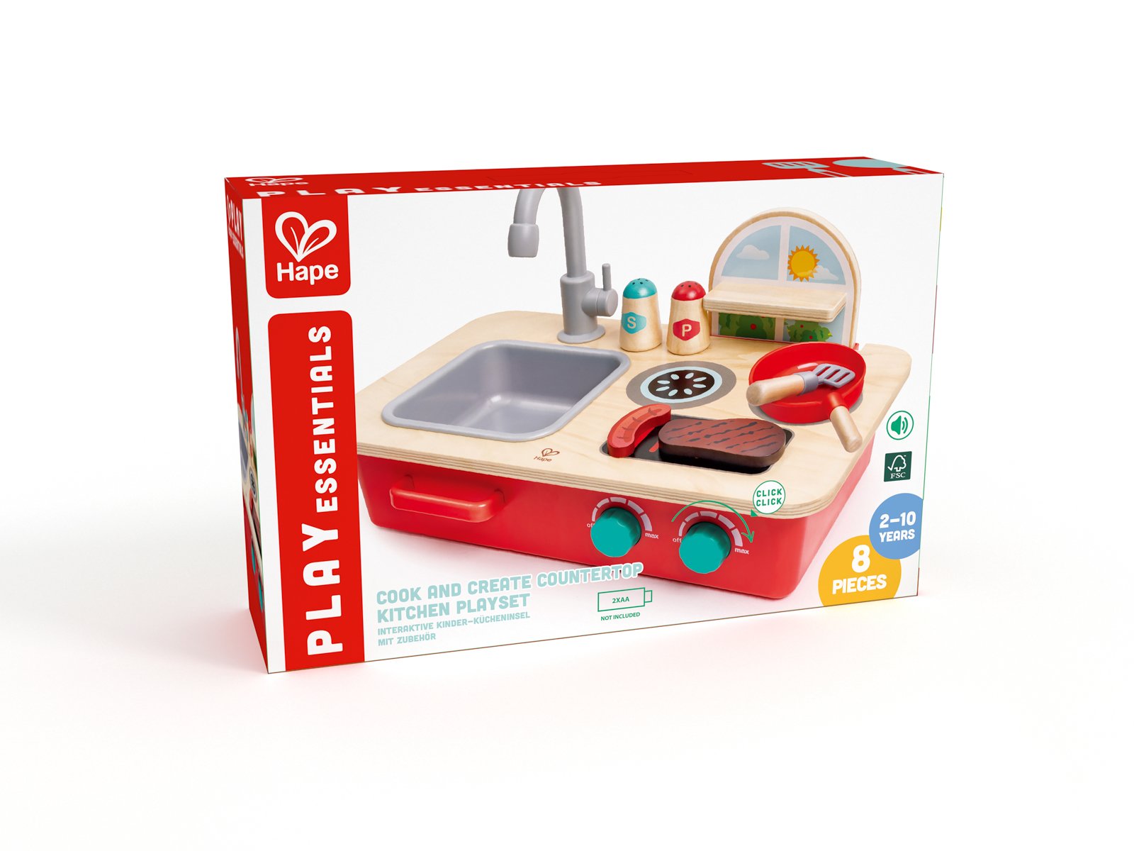 Kuchyňka Cook & Create – stolní sada na vaření. Dřevěná kuchyňská hračka se zvuky, nastavitelným dřezem, tabulí na kreslení a bohatým příslušenstvím k vaření včetně potravin. Ideální pro malé kuchaře a kuchařky, kteří milují hru na vaření a objevování nových chutí. Sada obsahuje kuchyňku se dvěma vařiči, dvě kořenky, dřez s kohoutkem, pánev, obracečku, párek, rybu, plátek masa, talíř, utěrku a poličku na kořenky. Kuchyňku lze jednoduše postavit na podlahu nebo stůl. Při zapnutí kuchyňky se spustí startovací melodie. Položte pánev na plotýnku a otočte knoflíkem – ozve se bublání a prskání. V dřezu s odnímatelným a otočným kohoutkem si děti mohou vyzkoušet mytí nádobí. Hračka skvěle podporuje rozvoj jemné motoriky, jazykových a organizačních dovedností, a hlavně rozvíjí fantazii a hru na role. Kuchyňka je vyrobena z pevného dřeva s kvalitní povrchovou úpravou bezpečnou pro děti. Baterie: 2 x AA, nejsou součástí. Rozměry balení: 30,3 x 46,2 x 11,7 cm. Věk: 2+