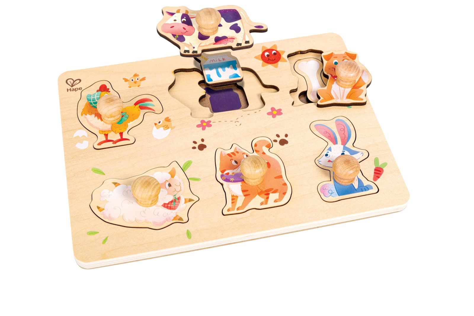 S tímto dřevěným puzzle farma od Hape mohou děti hravou formou objevovat život na farmě. Barevné puzzle má dvě vrstvy a pevné dílky s velkými dřevěnými úchyty, takže ho malé ručičky snadno uchopí. Procvičování jemné motoriky a koordinace ruka-oko se stane veselým dobrodružstvím. Každý dílek skládačky skrývá pod sebou překvapivý obrázek, což dodává zábavě ještě větší vzrušení. Děti se při hraní učí rozpoznávat hospodářská zvířata, napodobovat jejich zvuky a rozšiřovat si slovní zásobu. Vyrobeno z odolného dřeva s barvou vhodnou pro děti. Obsahuje 12 dílků. Rozměry balení: 28 x 29,5 x 3,5 cm. Věk: 2+
