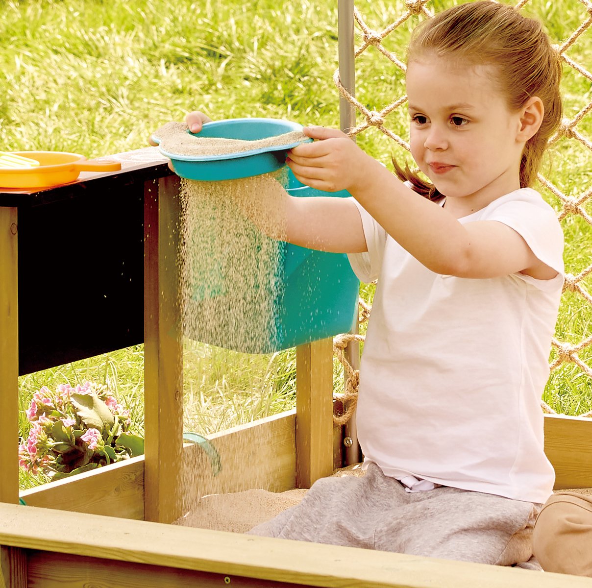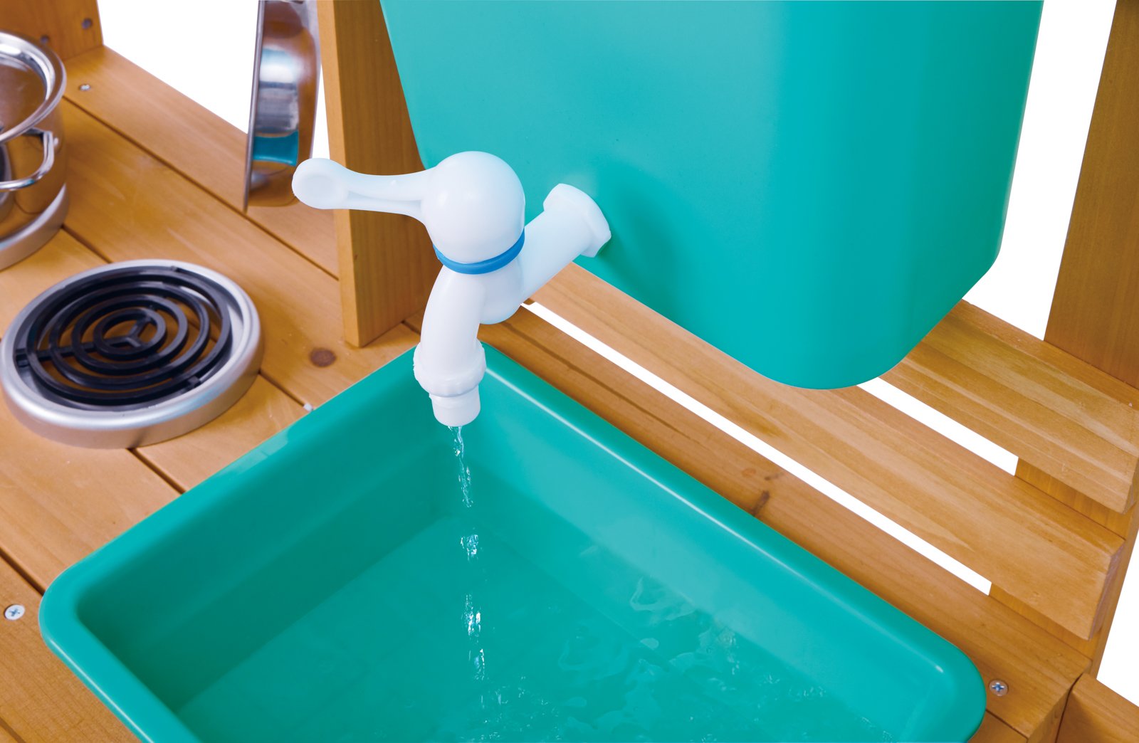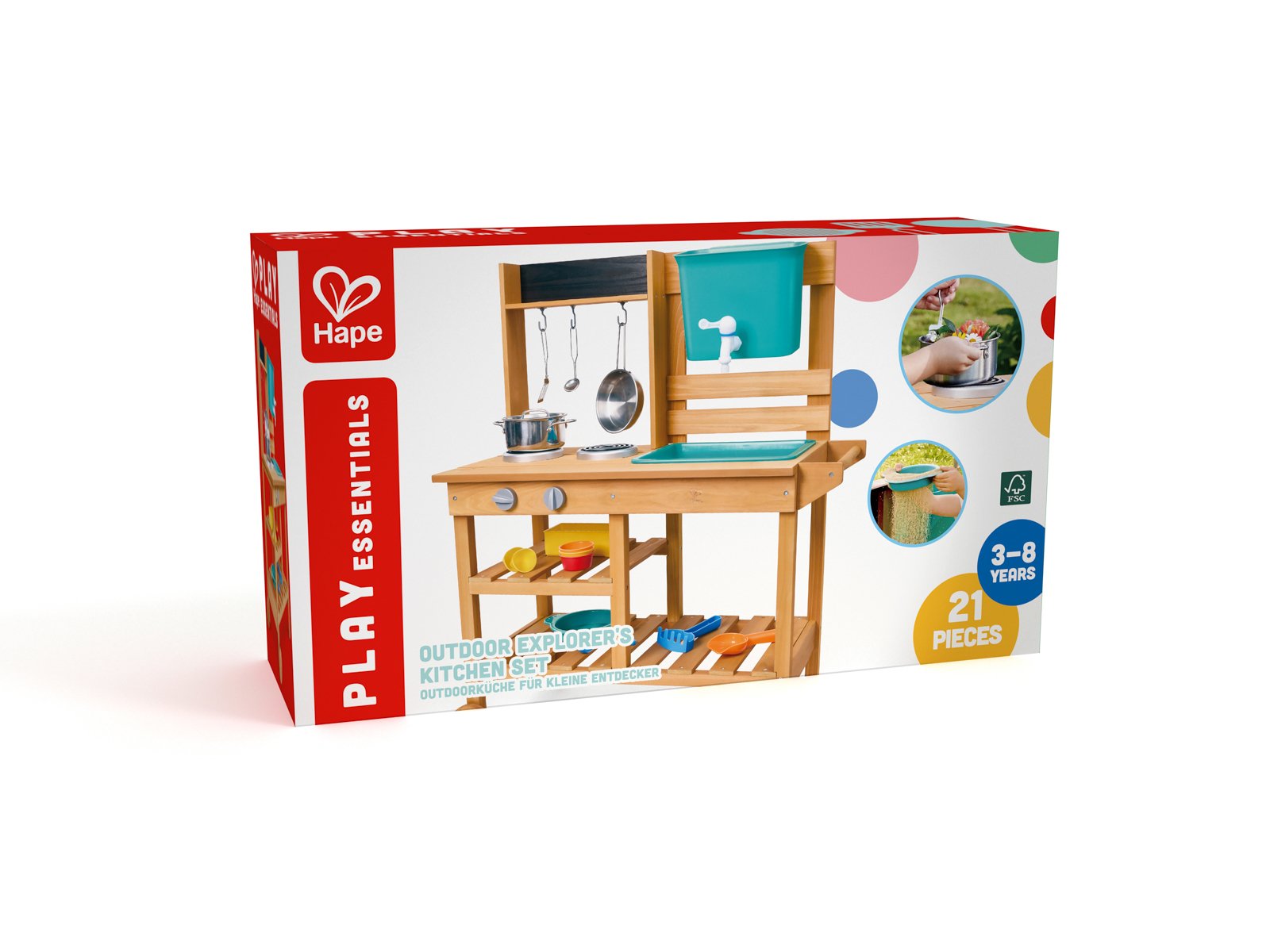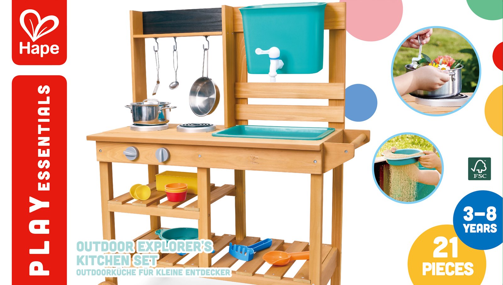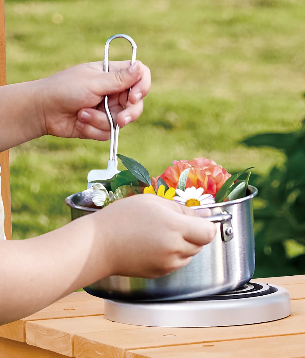 Objevte kouzlo vaření pod širým nebem! Tato dřevěná venkovní kuchyňka je dokonalou kombinací hry, objevování a tvořivosti. Děti mohou míchat, přelévat, sít i vařit „speciality“ z písku, vody a přírodnin – ideální hračka pro malé objevitele. Přitom si procvičují jemnou motoriku, fantazii i spolupráci s ostatními. Sada obsahuje 21 dílů: robustní dřevěná kuchyňka na kolečkách, odnímatelný dřez s kohoutkem, pracovní miska, hrnec s pokličkou, pánev, cedník, naběračka, vařečka, špachtle, 4 barevné kelímky, 2 lopatičky, hrabičky a formička na písek. Díky pevnému FSC dřevu a bezpečným materiálům je připravena na každodenní dobrodružství na zahradě. Rozměry balení: 42,5 x 74 x 21,5 cm. Doporučený věk: od 3 do 8 let.