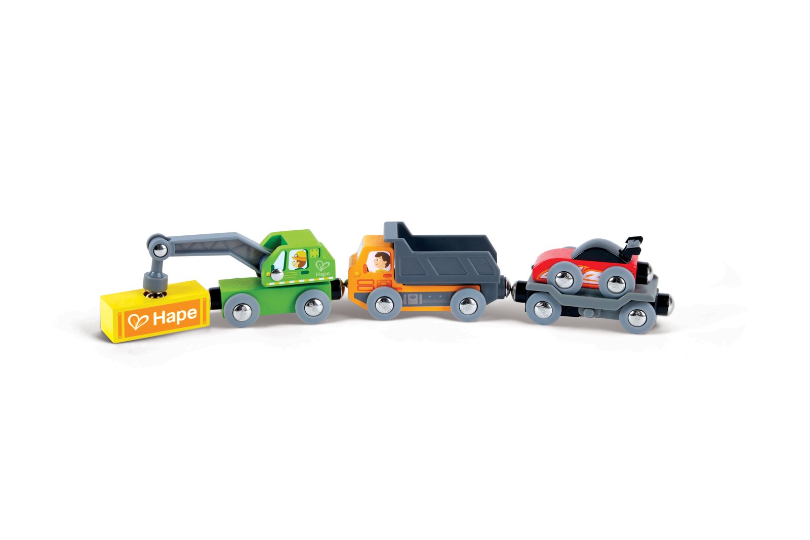 Sada technických vozidel 3 v 1. Prozkoumejte barvy a typy vozidel. V sadě najdete zelený jeřáb společně s nákladem, oranžové nákladní vozidlo a odtahový přívěs s červeným sportovním autem. Vozidla jsou kompatibilní se všemi vláčkovými sadami Hape a díky magnetům je můžete zapojit do jakékoliv vlakové soupravy. Vyrobeno z kvalitního FSC dřeva a plastu. Rozměry balení: 12 x 36 x 3,8 cm. Věk: 18 m+