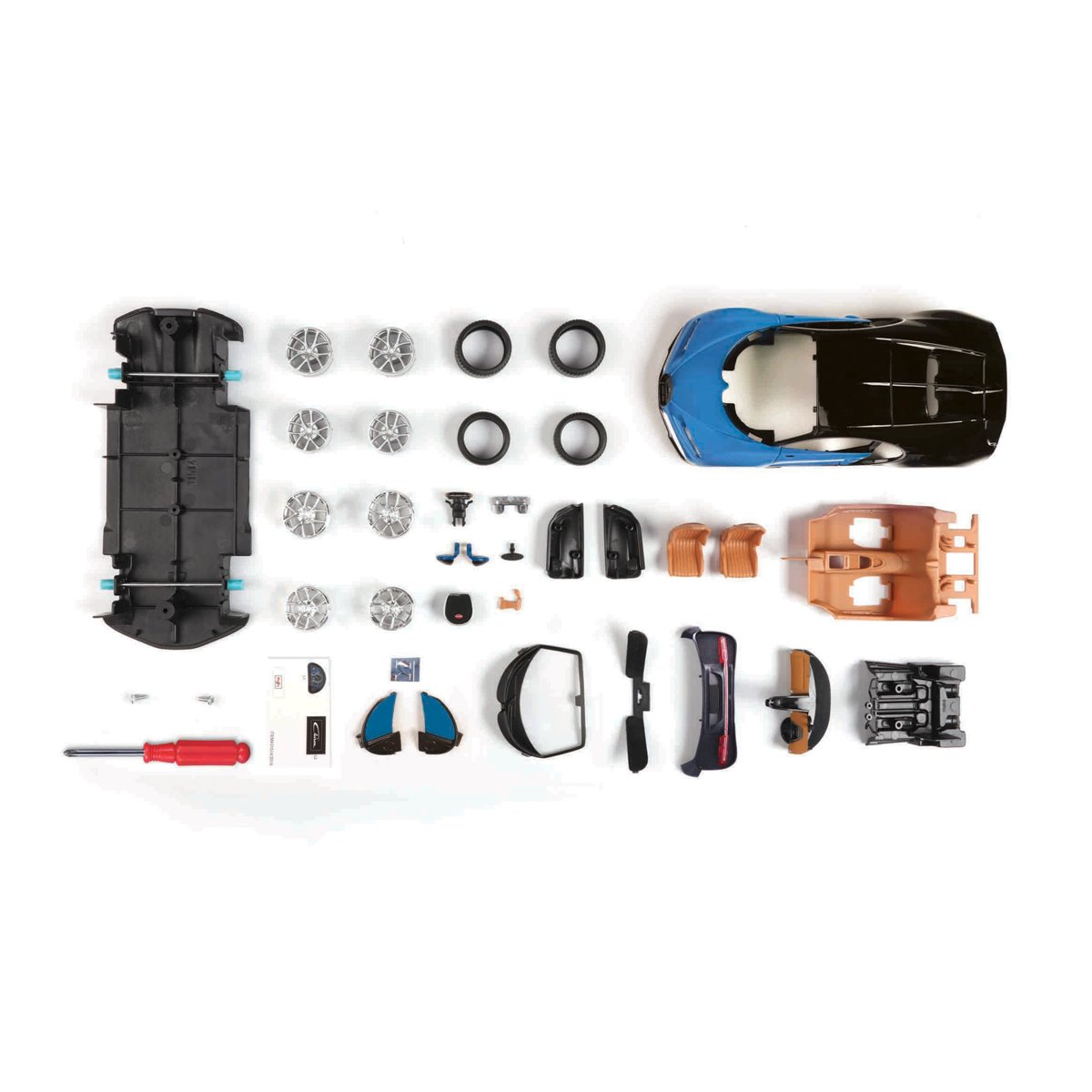 Bugatti Chiron v kitové verzi se skládá z 38 dílů. Jako bonus lze vybírat ze dvou sad disků kol, model se skládá bez lepení a barven a je z kovového vstřikovacího odlitku s plastovými díly. Rozměry balení: 22,9 x 16,8 x 10,2 cm. Věk: 8+