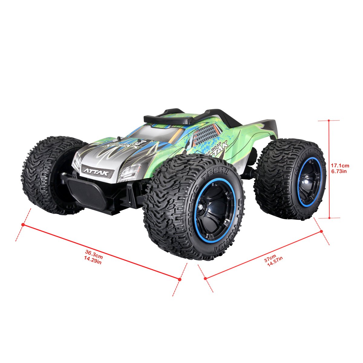 Off-Road Attak DINO. Dálkově ovládaný špičkový RC model + mohutné terénní pneumatiky. Vozidlo: akumulátor 6V NiMH (900 mAh) + nabíjení pomocí USB. Ovladač s proporcionálním ovládáním rychlosti: 2 ks baterie AA 1,5V, které jsou součástí balení. Dosah vysílače: 35 metrů, rychlost: 17,3 km/h, doba jízdy: 12 minut. Frekvence 2,4 GHz umožňuje souběžnou jízdu až se 4 RC modely. Délka modelu cca 37 cm, šířka modelu cca 36 cm. Rozměry balení: 24,6 x 50,5 x 40,3 cm. Nevhodné pro děti do 3 let. Věk: 8+