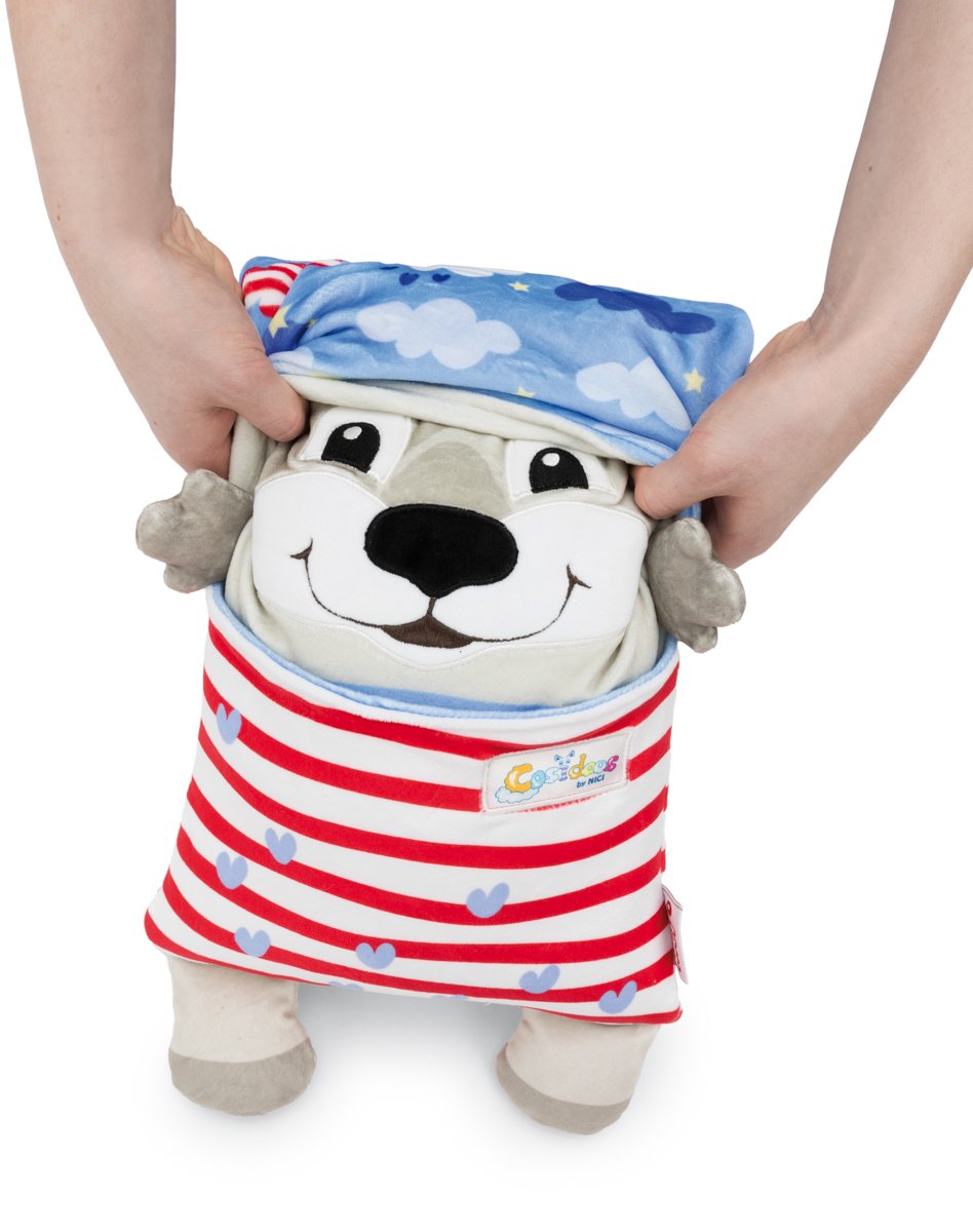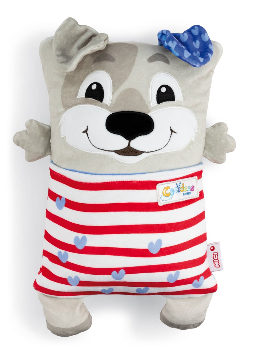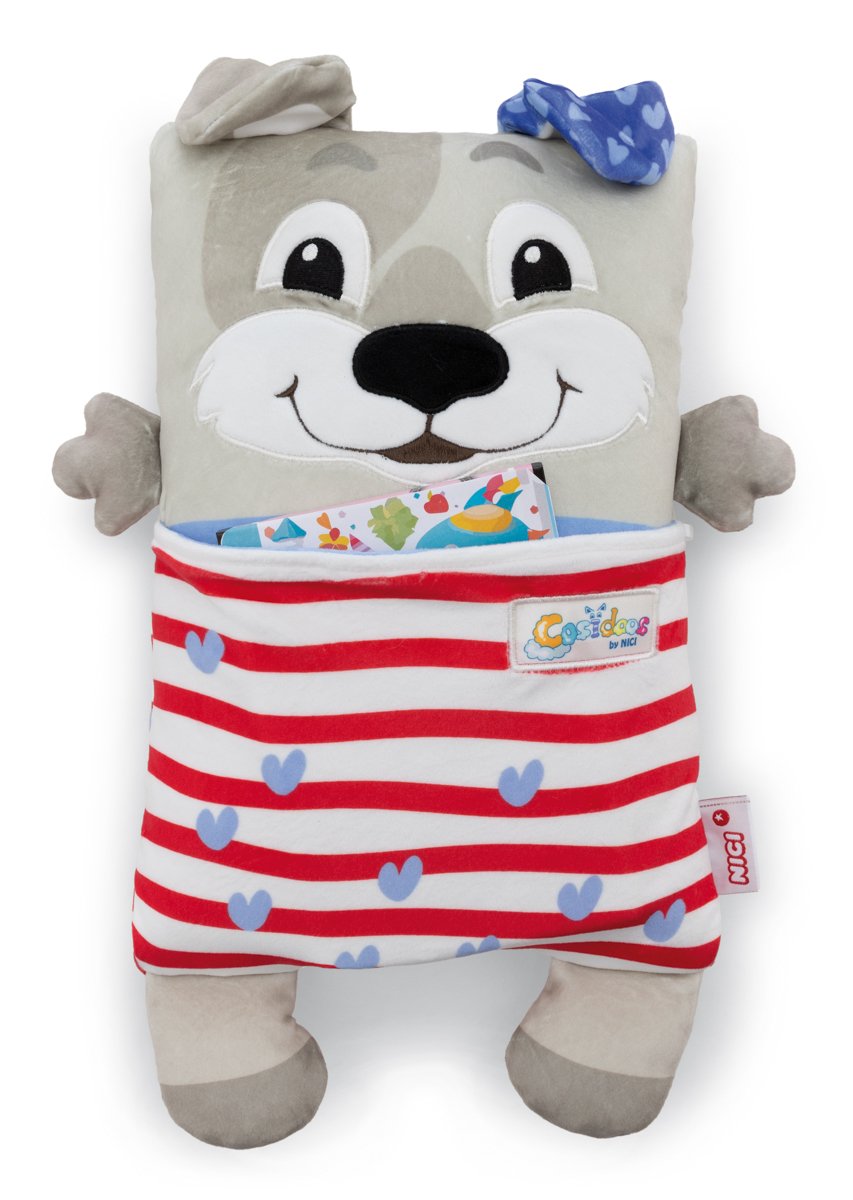 Pejsek Cosidoos je nadýchaná plyšová hračka, kterou lze snadno proměnit z veselého denního společníka v uklidňující zvířátko a polštářek na spaní. Šedý pejsek s modrým uchem kombinuje zábavu při hraní s pocitem pohody a zároveň podporuje pochopení rytmu dne a noci. Díky tomu se stává přechod k večernímu usínání opravdovým zážitkem. Pejska lze jediným jednoduchým pohybem ruky snadno převrátit a změnit tak barvy i design podle denní doby. Během dne pejsek Cosidoos podporuje kreativní hru a stimuluje fantazii, zatímco v noci se stává něžným společníkem pro klidný noční spánek. Měkké kapsy jsou ideální pro uložení malých pokladů nebo důležitých předmětů. Oboustranný zázrak vyrobený z vysoce kvalitního, super měkkého plyše NICI je víc než jen hračka – je to věrný přítel, který plynule přechází mezi hrou a odpočinkem. Rozměry hračky: 30 x 20 x 11 cm. Věk 12 m+