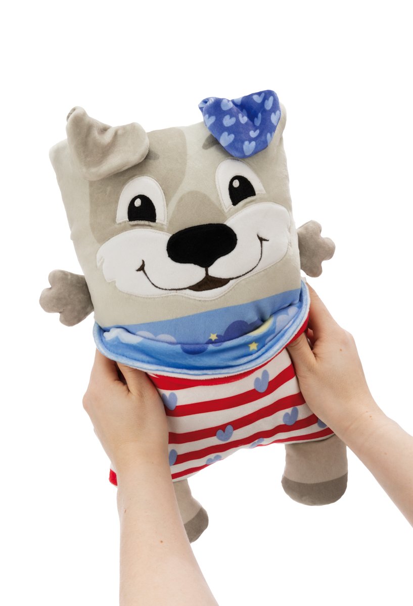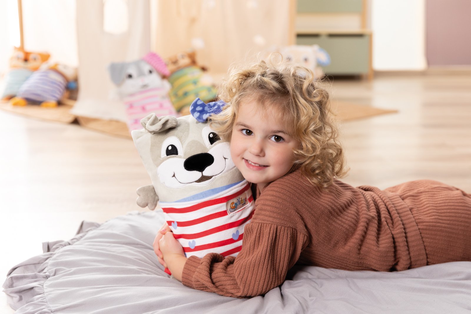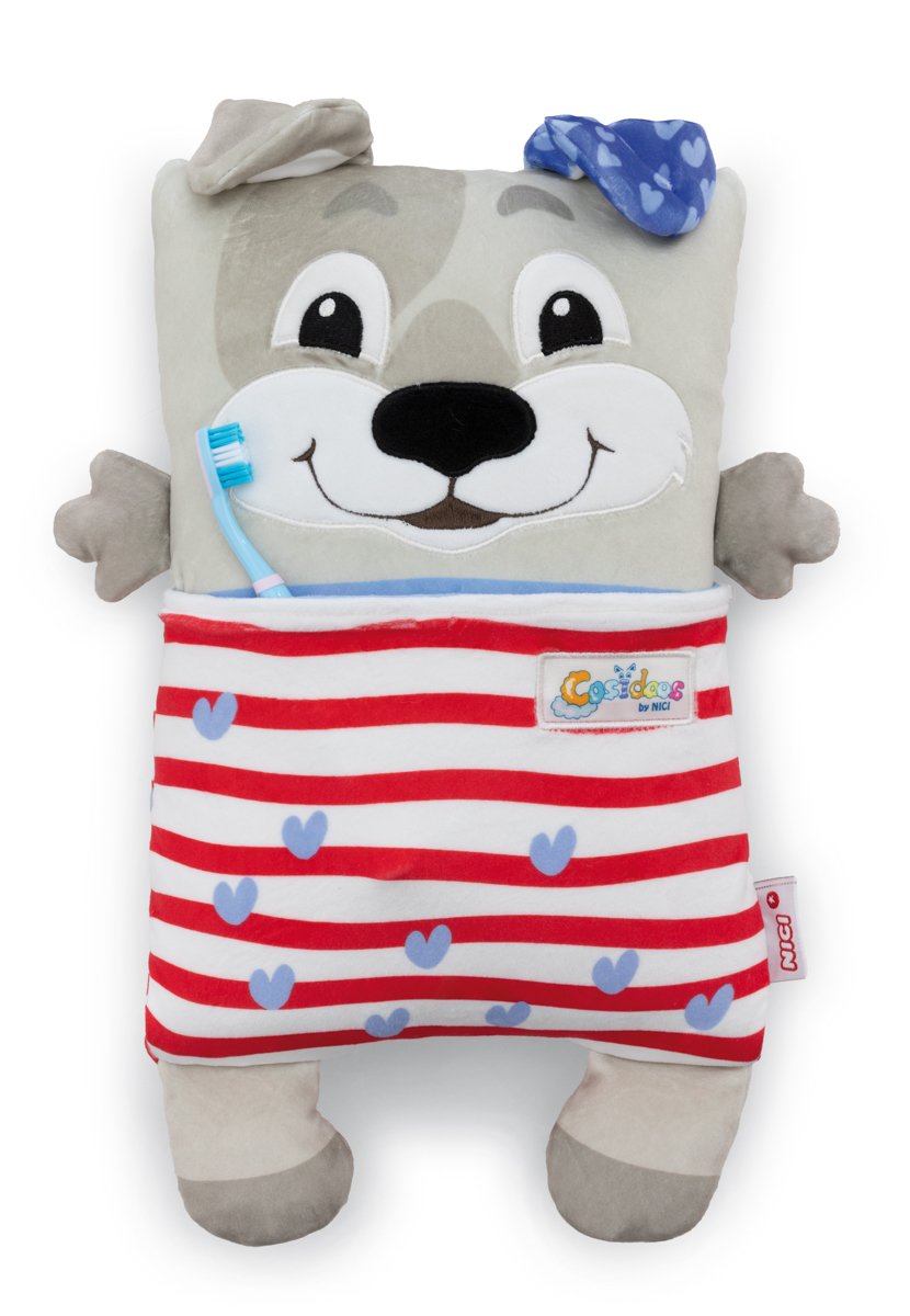 Pejsek Cosidoos je nadýchaná plyšová hračka, kterou lze snadno proměnit z veselého denního společníka v uklidňující zvířátko a polštářek na spaní. Šedý pejsek s modrým uchem kombinuje zábavu při hraní s pocitem pohody a zároveň podporuje pochopení rytmu dne a noci. Díky tomu se stává přechod k večernímu usínání opravdovým zážitkem. Pejska lze jediným jednoduchým pohybem ruky snadno převrátit a změnit tak barvy i design podle denní doby. Během dne pejsek Cosidoos podporuje kreativní hru a stimuluje fantazii, zatímco v noci se stává něžným společníkem pro klidný noční spánek. Měkké kapsy jsou ideální pro uložení malých pokladů nebo důležitých předmětů. Oboustranný zázrak vyrobený z vysoce kvalitního, super měkkého plyše NICI je víc než jen hračka – je to věrný přítel, který plynule přechází mezi hrou a odpočinkem. Rozměry hračky: 30 x 20 x 11 cm. Věk 12 m+