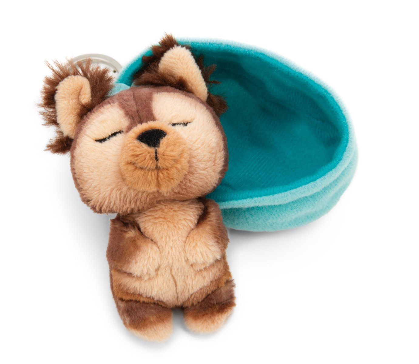 NICI klíčenka spící Pejsek Yorkshire 12 cm, světle modrý košík, GREEN