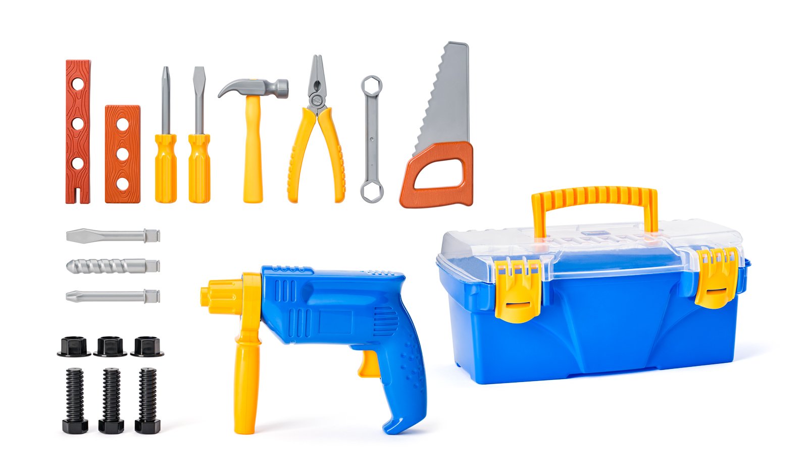 Skvělá sada pro malé kutily. Praktický přenosný kufřík obsahuje 18 kusů nářadí a doplňků v realistickém provedení. Díky madlu si děti mohou své nářadí snadno přenášet a mít ho vždy po ruce. Součástí sady je mimo jiné mechanická vrtačka, která funguje bez baterií – stačí stisknout a otáčí se díky vnitřnímu mechanismu. Dále pilka, kladívko, šroubováky, kleště, klíč, šrouby, matice a další příslušenství pro malé opraváře. Hra podporuje rozvoj fantazie, technického myšlení i jemné motoriky. Rozměry: . Nevhodné pro děti do 3 let. Věk: 3+