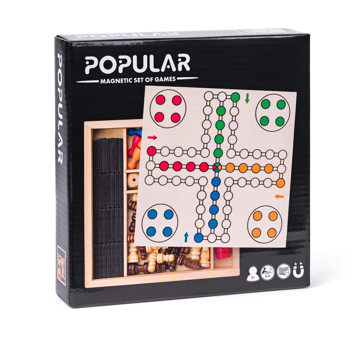 Soubor stolních her v dřevěném boxu, jehož víko tvoří oboustranná hrací deska pro jednotlivé společenské hry – šachy, dáma, nebo člověče, nezlob se. Ke každé společenské hře najdete v sadě příslušné figurky. Součástí setu jsou hrací kameny pro hru domina a sada hracích kostek. Magnetické provedení tohoto setu rozšiřuje jeho využitelnost i pro dlouhé cesty autem, vlakem či letadlem. Domino není vybaveno magnety. Rozměry produktu: 18,5 x 18,5 x 4 cm. Věk: 3+