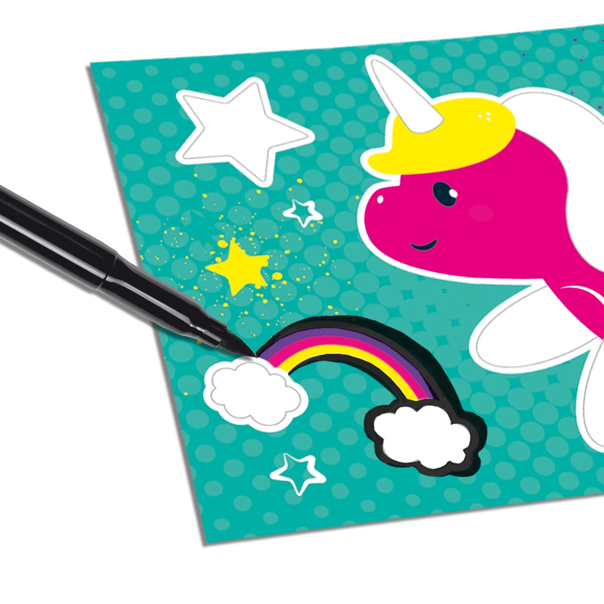 Vytvářejte úžasná graffiti díla s barevnými efekty. S barevnými foukacími fixy, šablonami a černým fixem vytvoříte ty nejúžasnější umělecká díla. Ideální pro děti, které mají rády odvážné a kreativní projekty. Obsah balení: 6 barevných foukacích fixů, 1 černý štětcový fix, 8 barevných kartiček s předlohou, 5 prázdných listů papíru, 2 šablony. Barvy foukacích fixů: modrá, zelená, žlutá, oranžová, růžová a fialová. Snadno se smývají z kůže a většiny druhů textilií. Baleno v krabičce. Rozměry balení: 20 x 30 x 4 cm. Věk: 5+