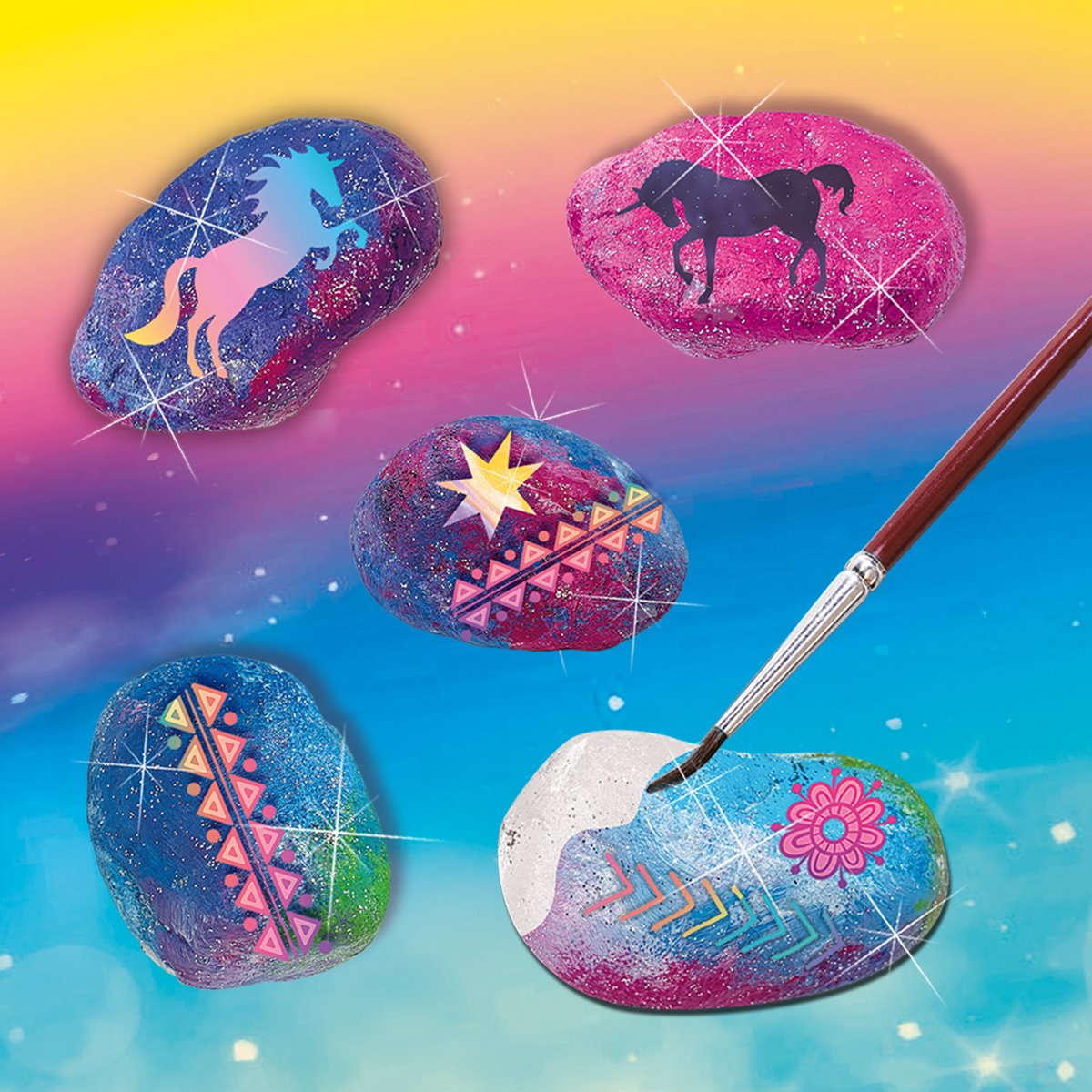 Namalujte si vlastní fantastickou galaxii na kamínky. S touto kreativní sadou od proměníte obyčejné kameny v kouzelná umělecká díla inspirovaná vesmírem. Malujte hvězdy, planety a barevné mlhoviny, přidejte třpytky a sledujte, jak se vaše kameny mění v malá mistrovská díla. Ideální pro výzdobu pokoje nebo jako dárek pro někoho výjimečného. Ideální pro malé umělce, kteří chtějí dát průchod své kreativitě. Obsah sady: 5 bílých kamenů, sada samolepek, 6 barviček, štětec, třpytivé lepidlo, houbička a návod. Baleno v krabičce. Rozměry balení: 20 x 15 x 4 cm. Nevhodné pro děti do 3 let. Věk: 5+