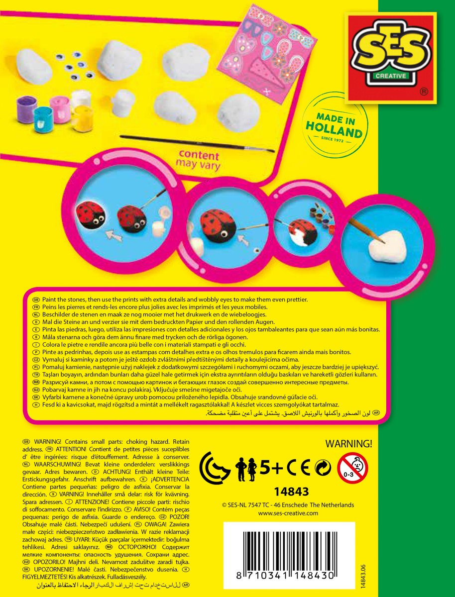Tato sada obsahuje trendy barvy a výběr krásně tvarovaných kamínků k malování. Vytvoříte si také tyto roztomilé postavičky? Součástí sady jsou pohyblivé oči a detailní obrázky k nalepení, které krásný výsledek ještě umocní. Obsah sady: 5 kamenů, 8 pohyblivých očí různých velikostí, 6 barviček v trendy odstínech, štětec, kalíšek s lepidlem, návod. Baleno v krabičce. Rozměry balení: 20 x 15 x 4 cm. Nevhodné pro děti do 3 let. Věk: 5+