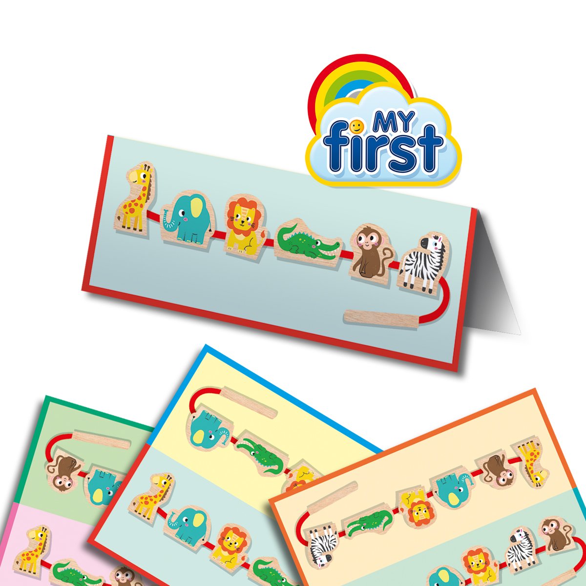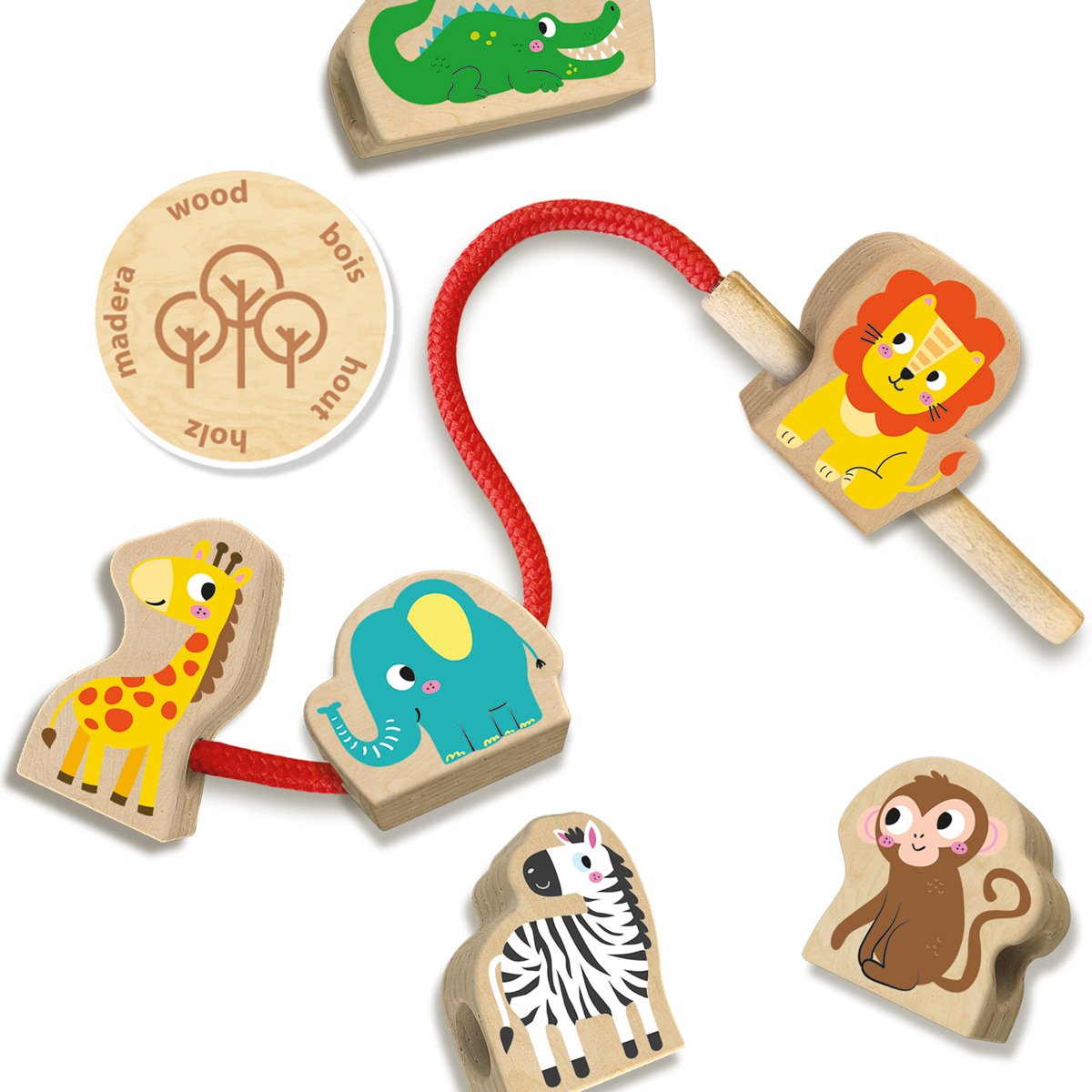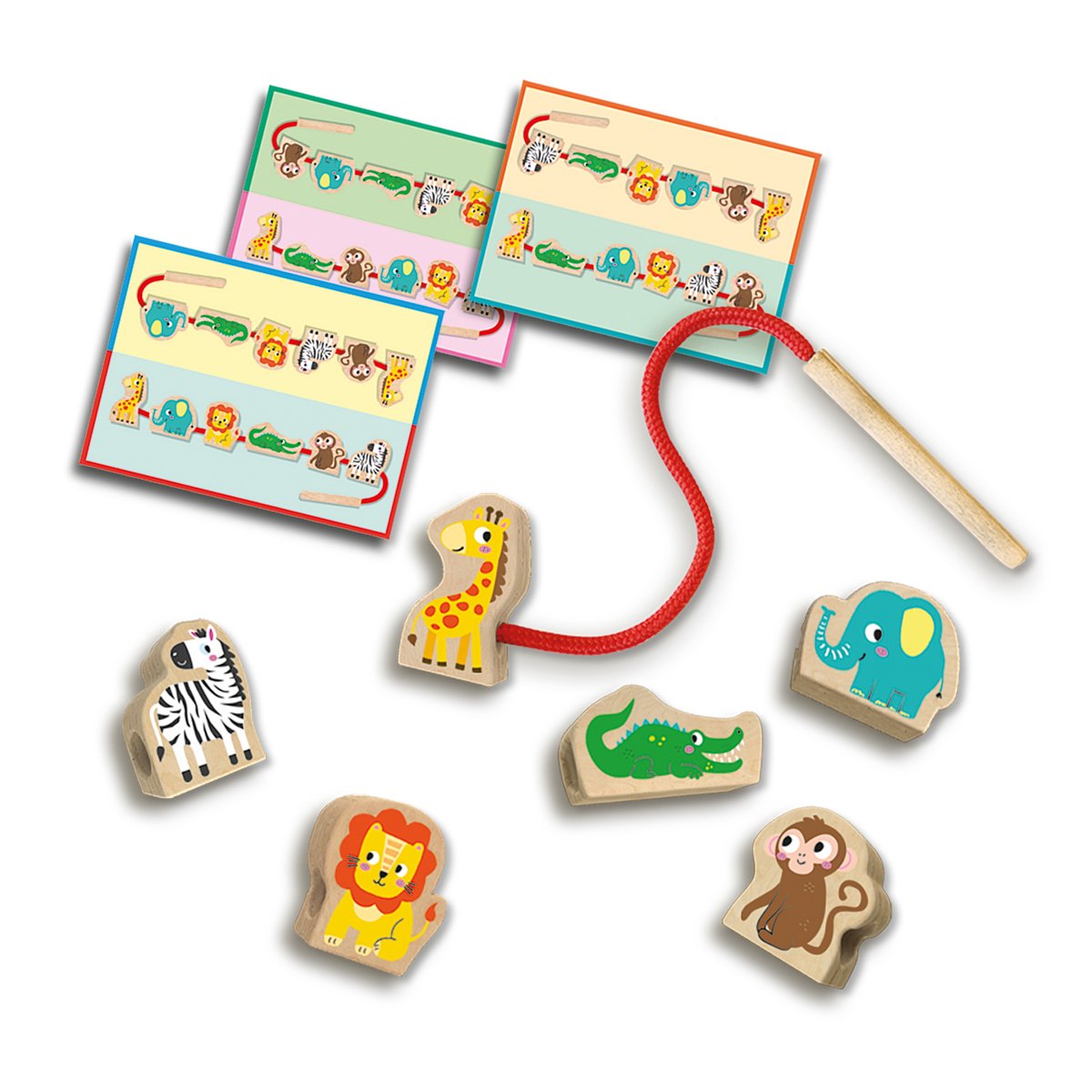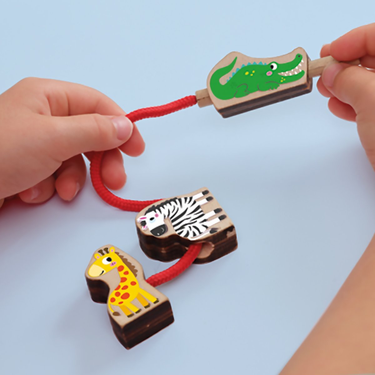 Dokážete navléknout roztomilá zvířátka ve správném pořadí na korálkový náhrdelník? Tvary jsou vyrobeny ze skutečného dřeva a lze je navlékat ve správném pořadí pomocí karet s pokyny. Dokážete vytvořit všech šest příkladů? Žirafa je připevněna na šňůrce, takže ostatní korálky nesklouzávají a s dřevěnou jehlou je navlékání mnohem jednodušší. Stimuluje kreativitu, napomáhá rozvoji jemné motoriky a manuální dovednosti navlékání. Obsauhuje: Navlékací šňůrku s nasazenou dřevěnou jehlou a pevným zvířecím korálkem, 5 korálků, vzorové karty. Rozměry balení: 20 x 15 x 4 cm. Věk: 1+