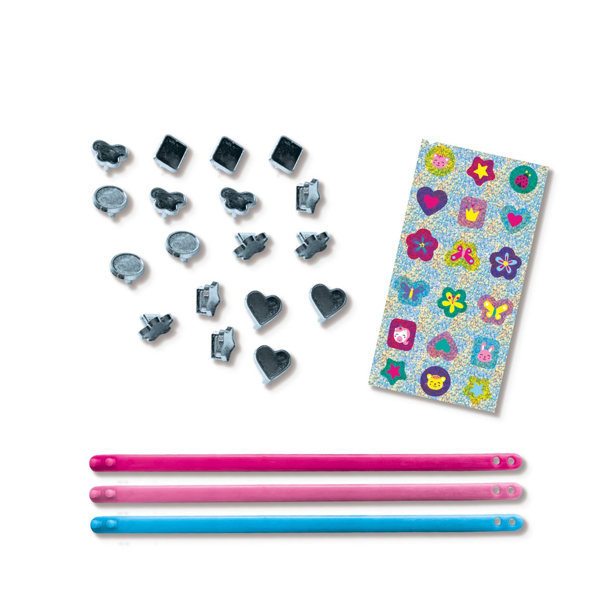 Se sadou SES Creative na výrobu náramků s přívěsky si děti mohou navrhnout vlastní barevné a jedinečné šperky. Vyrobit si vlastní šperky nemusí být složité. Stačí na ozdoby nalepit lesklé třpytivé nálepky a nasunout je na jeden z plastových náramků. Kombinujte a spojujte své vlastní výtvory, odstraňte je a vytvořte opět něco nového. Podporuje kreativitu a jemnou motoriku. Obsah sady: 3 barevné plastové náramky, 18 přívěsků, třpytivé samolepky. Baleno v krabičce. Rozměry balení: 20 x 15 x 4 cm. Věk: 3+