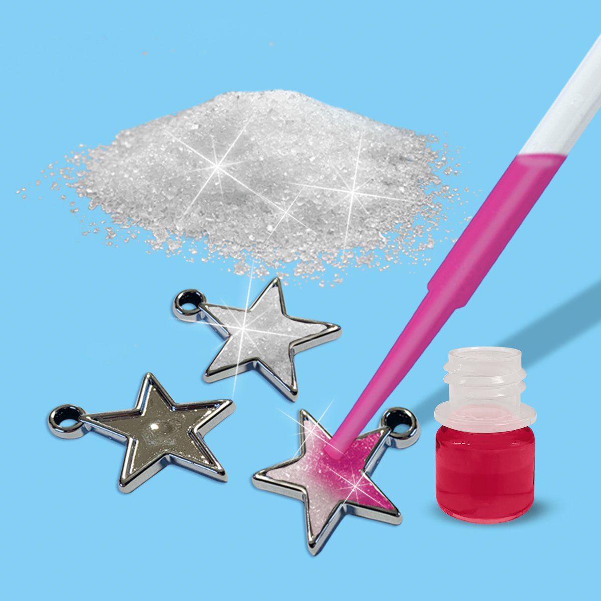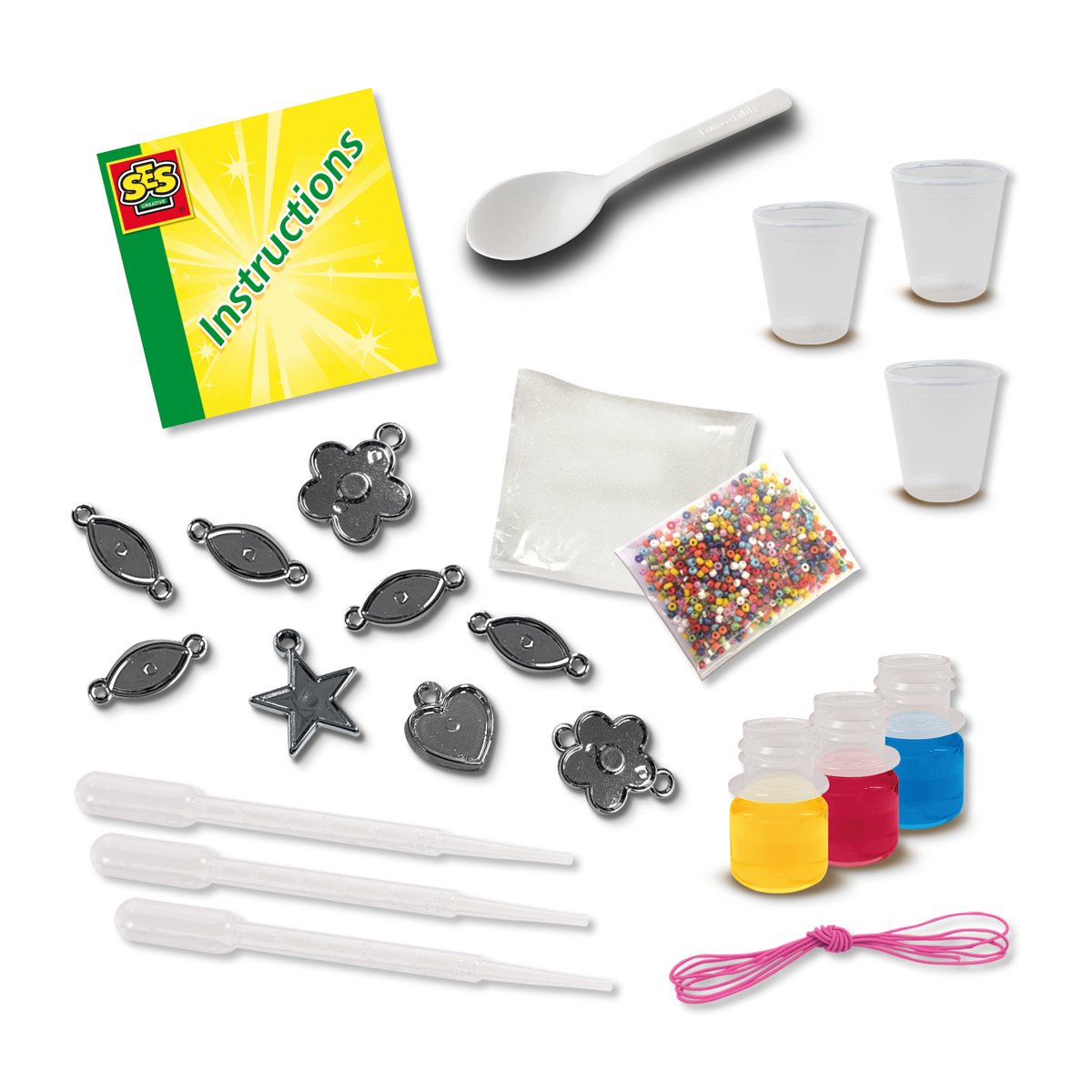 Se sadou Easy Diamonds od SES Creative si můžete navrhnout a vyrobit náramky plné nádherných přívěsků, které si sami ozdobíte. Díky speciálnímu prášku Easy diamond a barevným roztokům získá každý šperk třpytivý diamantový efekt. Naberte trošku diamantové prášku, vložte na stříbrný podklad diamantu a nakapejte na něj barvu, která se vám líbí. Díky barvě prášek ztvrdne a kouzlo je dokončeno. Sada podporuje kreativitu, smysl pro barvy a rozvoj jemné motoriky. Sada obsahuje: 9 přívěšků, diamantový prášek, 3 barevné roztoky, 3 odměrky, 3 pipety, elastická šňůrka, mix skleněných korálků, lžičku a návod. Rozměr balení: 20 x 15 x 4 cm. Věk: 6+