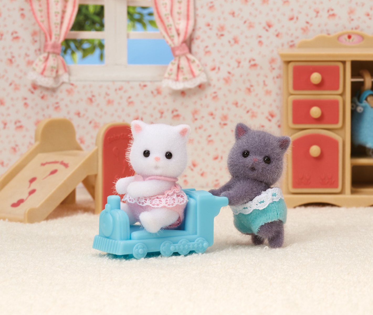Dvojčata z rodiny perských koček mají charakteristické roztomilé čumáčky. Sada obsahuje dvě malé figurky dvojčat Leah a Bellamy pokryté měkkým semišovým kožíškem a také vozítko ve tvaru mašinky. Dvojčata jsou oblečena do zábavných, barevných oblečků s krajkou. Vozítko lze kombinovat s vozítky z jiných sad s dvojčaty. Hračky Sylvanian Families rozvíjejí představivost a podporují děti k hraní rolí. Hraní s figurkami Sylvanian Families rozvíjí kreativitu a učí emoce prostřednictvím vytváření a vyprávění příběhů na základě každodenních zkušeností a pozorování světa. Vyznačují se nejvyšší kvalitou a výjimečným důrazem na detaily. Figurky Sylvanian Families mají pohyblivou hlavu. Oblečení je vyrobeno tak, aby se dalo opakovaně svlékat a oblékat. Baleno v krabičce. Rozměry balení: 12 x 7,5 x 3,5 cm. Věk: 3+
