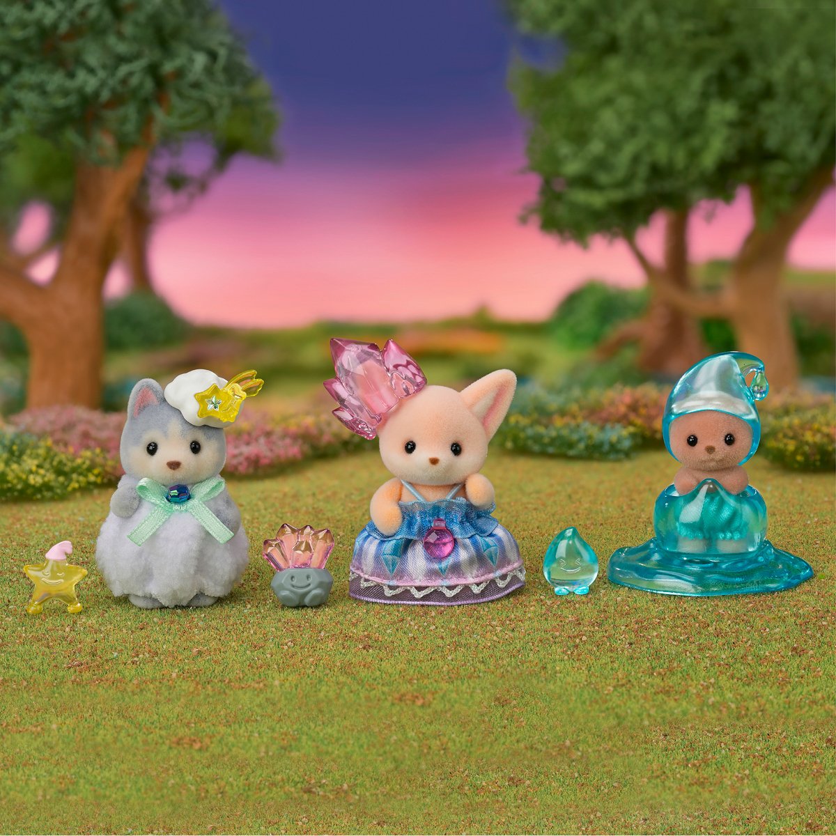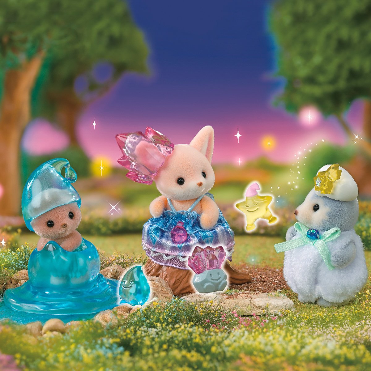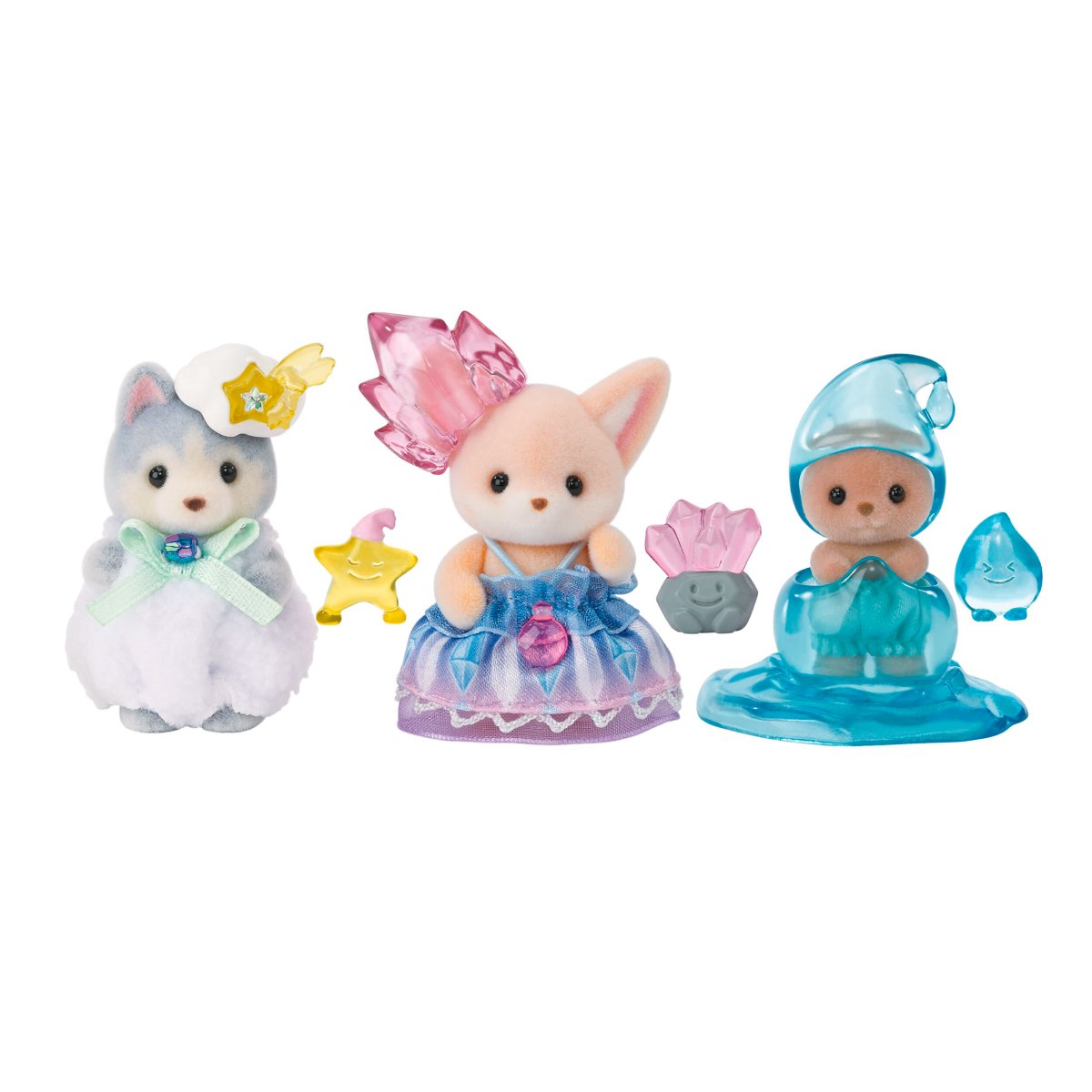 Kouzelná vílí miminka – kouzelná hra s rozkošnými vílími miminky. Sada obsahuje tři roztomilé, sametově hebké figurky zvířátek v ručně vyrobených fantasy kostýmech s doplňky. Okouzlující trio: Mládě huskyho v kostýmu hvězdy s hvězdným kamarádem, mládě fenka v křišťálovém kostýmu s drahokamovým kamarádem a mládě tuleně v kostýmu ranní rosy s kamarádem kapičkou. Velikost figurky cca 3–5 cm. Hračky Sylvanian Families rozvíjejí představivost a povzbuzují děti k hraní rolí. Hra s figurkami rozvíjí kreativitu a učí emocím vytvářením a vyprávěním příběhů založených na každodenních zážitcích a pozorování světa. Vyznačují se nejvyšší kvalitou a výjimečným důrazem na detaily. Figurky Sylvanian Families mají pohyblivé končetiny a hlavu. Oblečení lze z figurek sundat a vyměnit za jiný outfit. Baleno v krabičce. Rozměry balení: 13x 12,5 x 4,5 cm. Věk: 3+