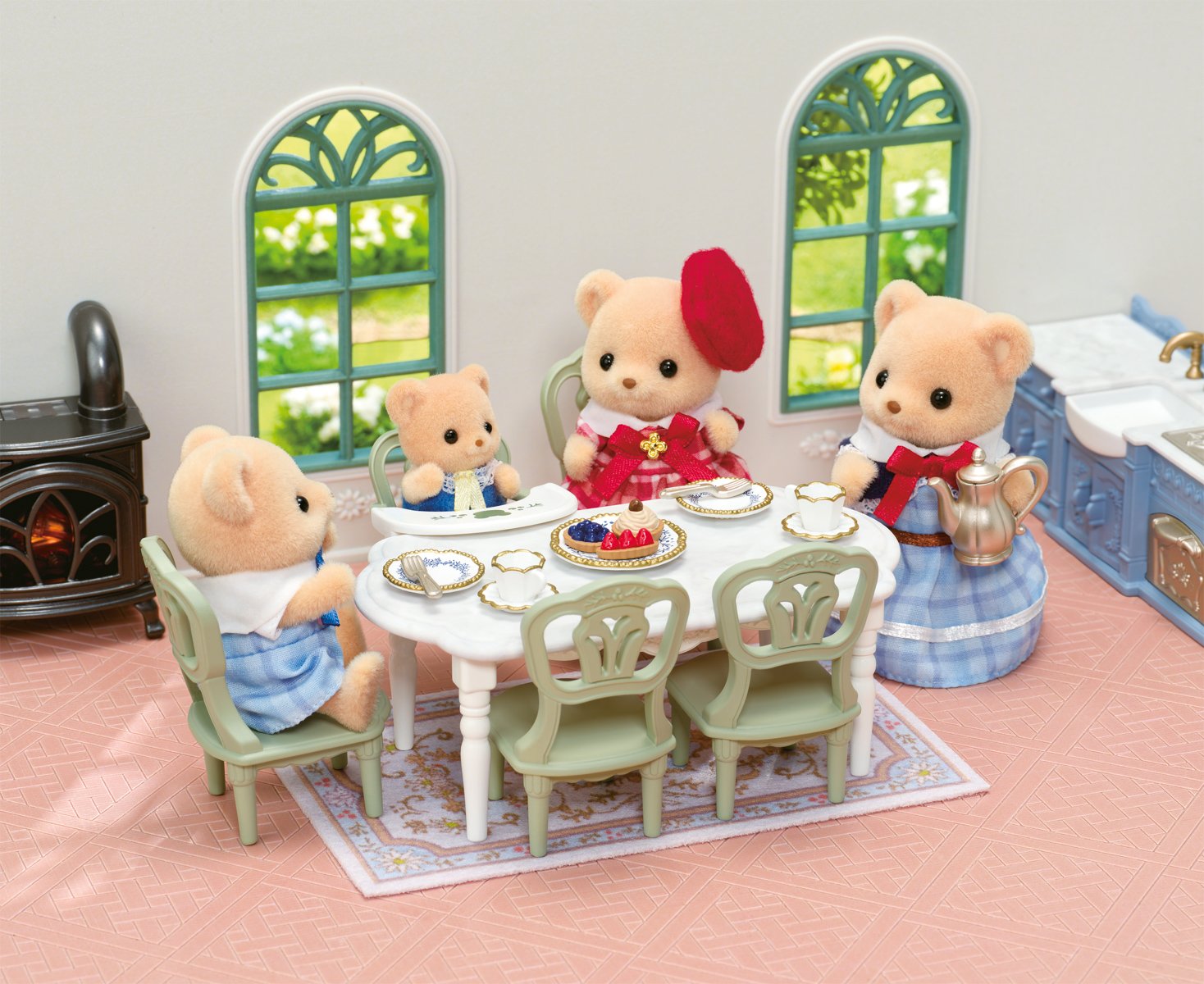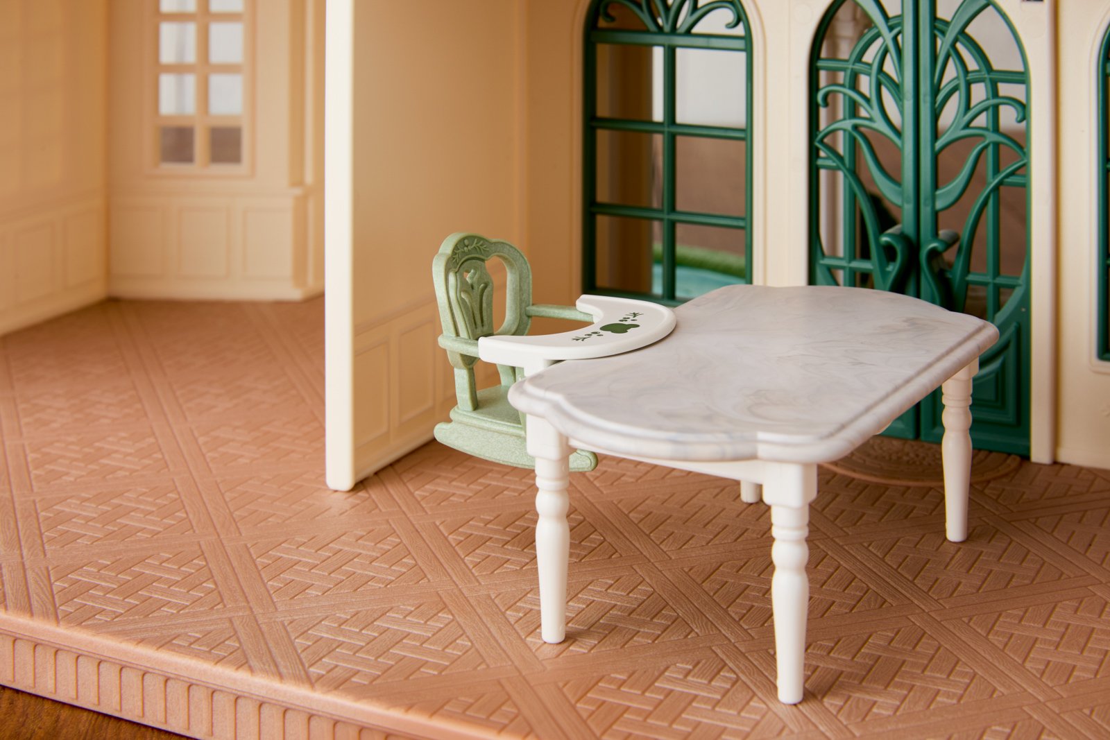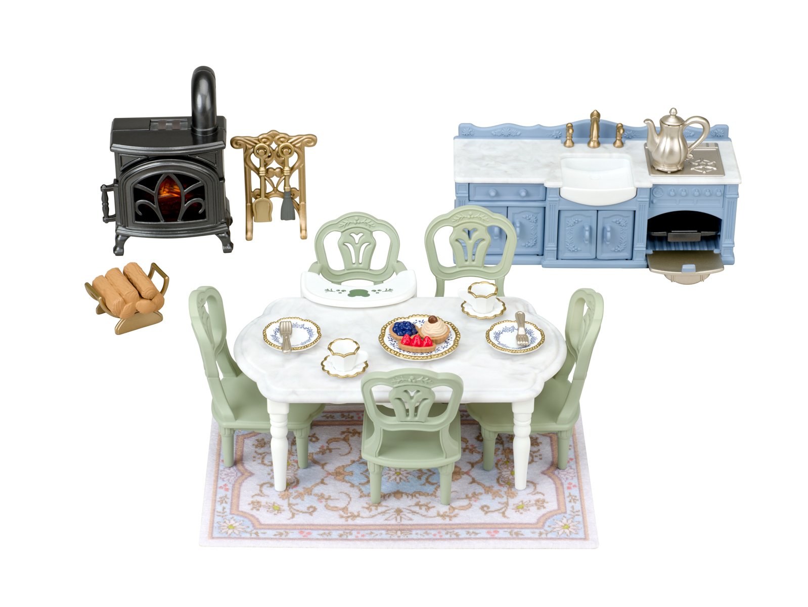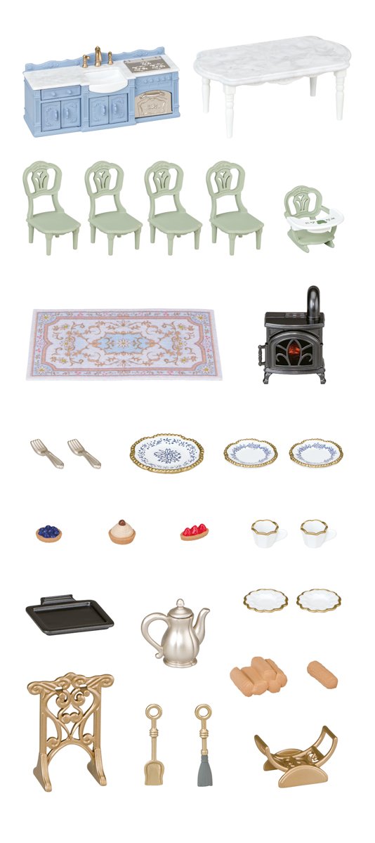 Elegantní jídelna, praktická sada nábytkových doplňků pro vybavení vily u řeky a dalších domů Sylvanian Families. Elegantní sada obsahuje: stůl, pět židlí, kamna na dřevo, kuchyňskou linku s dřezem a sporákem, koberec, nádobí, džbán a další okouzlující doplňky. Kamna mají speciální funkci, díky které oheň vypadá, jako by žhnul – nejsou potřeba žádné baterie. Součástí jsou i polínka, která se vejdou do kamen. Kuchyňská deska a deska stolu mají mramorový design. Dětskou jídelní židličku lze připevnit k jídelnímu stolu. Dětská židlička slouží zároveň jako houpací křeslo. Obsah sady: kuchyňská linka s dřezem, sporák s troubou, jídelní stůl, 4 jídelní židličky, dětská židlička, krb, lopata, koště, stojan na krbové nářadí, polínko, polínka, stojan na polínka, plech na pečení, borůvkový koláč, jahodový koláč, dort Mont Blanc, velký talíř, 2 malé talíře, konvice, 2 šálky, 2 podšálky, 2 vidličky a koberec. Sada je ideální doplněk k domečku – Vila s červenou střechou u řeky (5865). Baleno v krabičce. Rozměry balení: 18,5 x 29 x 7,5 cm. Věk: 3+