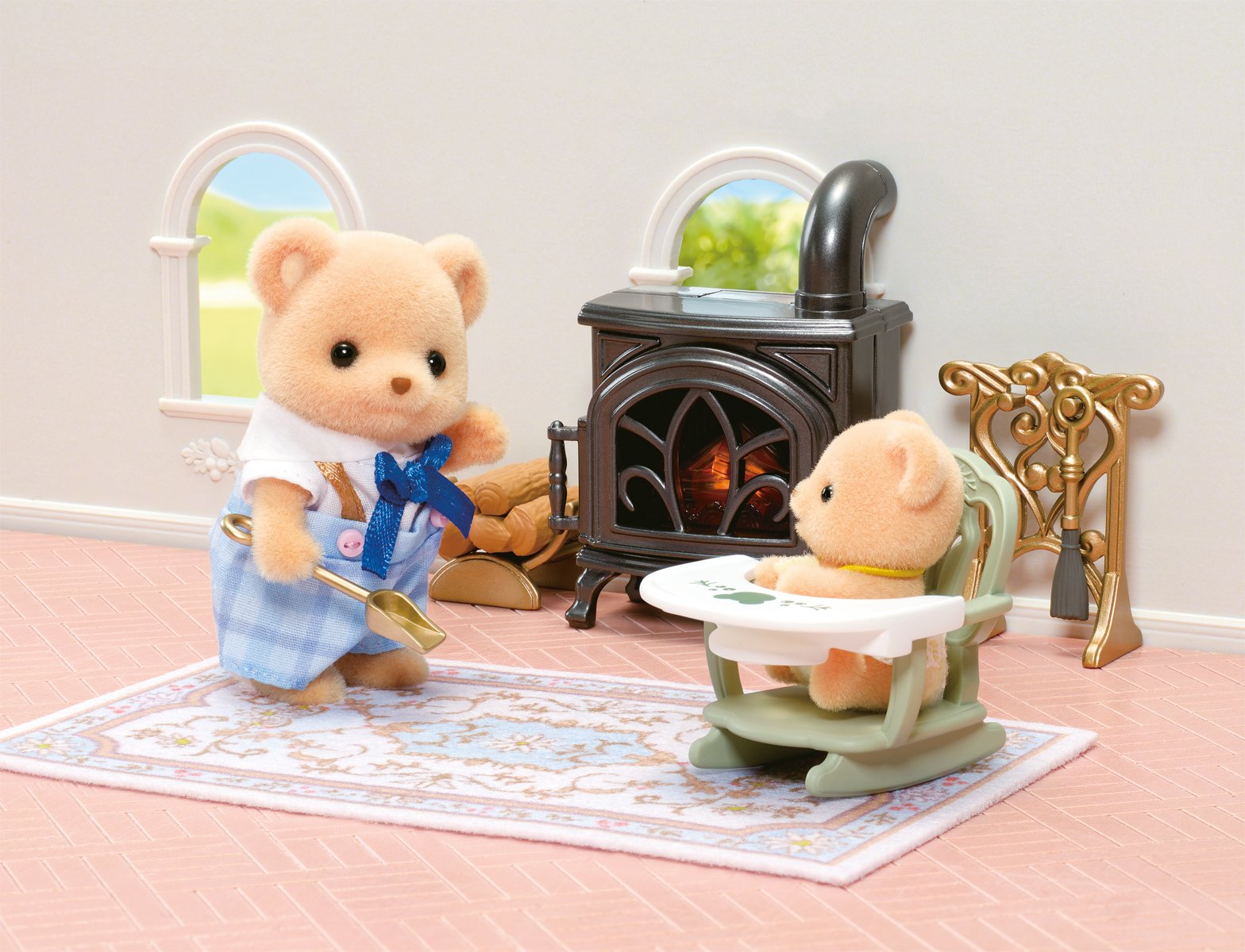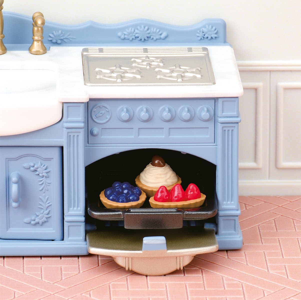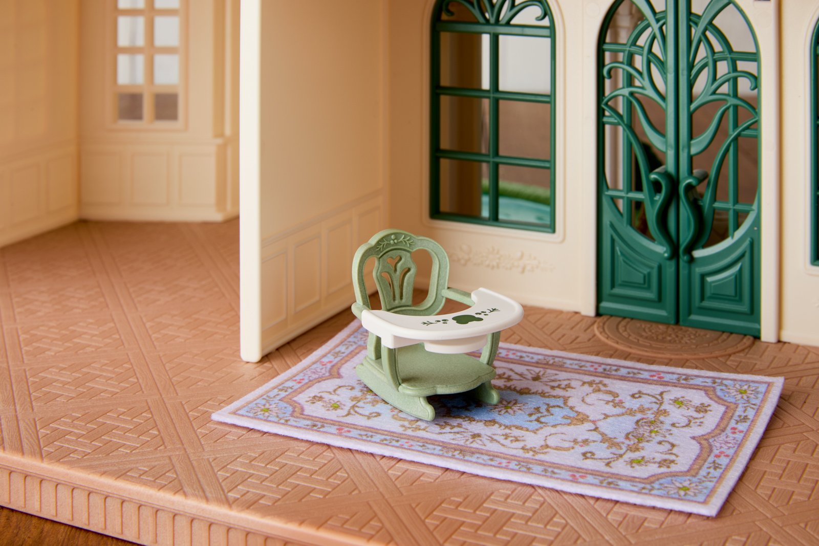 Elegantní jídelna, praktická sada nábytkových doplňků pro vybavení vily u řeky a dalších domů Sylvanian Families. Elegantní sada obsahuje: stůl, pět židlí, kamna na dřevo, kuchyňskou linku s dřezem a sporákem, koberec, nádobí, džbán a další okouzlující doplňky. Kamna mají speciální funkci, díky které oheň vypadá, jako by žhnul – nejsou potřeba žádné baterie. Součástí jsou i polínka, která se vejdou do kamen. Kuchyňská deska a deska stolu mají mramorový design. Dětskou jídelní židličku lze připevnit k jídelnímu stolu. Dětská židlička slouží zároveň jako houpací křeslo. Obsah sady: kuchyňská linka s dřezem, sporák s troubou, jídelní stůl, 4 jídelní židličky, dětská židlička, krb, lopata, koště, stojan na krbové nářadí, polínko, polínka, stojan na polínka, plech na pečení, borůvkový koláč, jahodový koláč, dort Mont Blanc, velký talíř, 2 malé talíře, konvice, 2 šálky, 2 podšálky, 2 vidličky a koberec. Sada je ideální doplněk k domečku – Vila s červenou střechou u řeky (5865). Baleno v krabičce. Rozměry balení: 18,5 x 29 x 7,5 cm. Věk: 3+