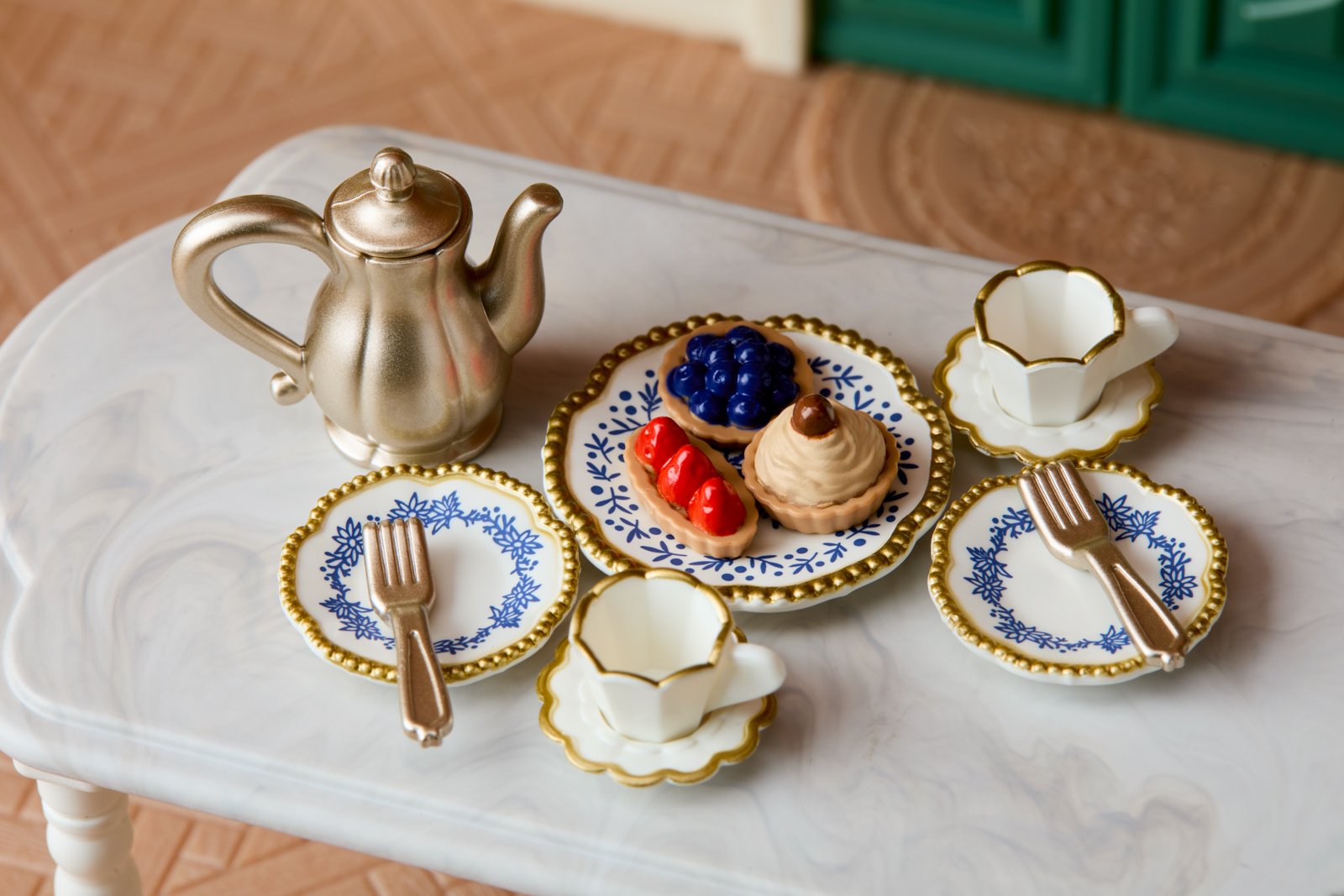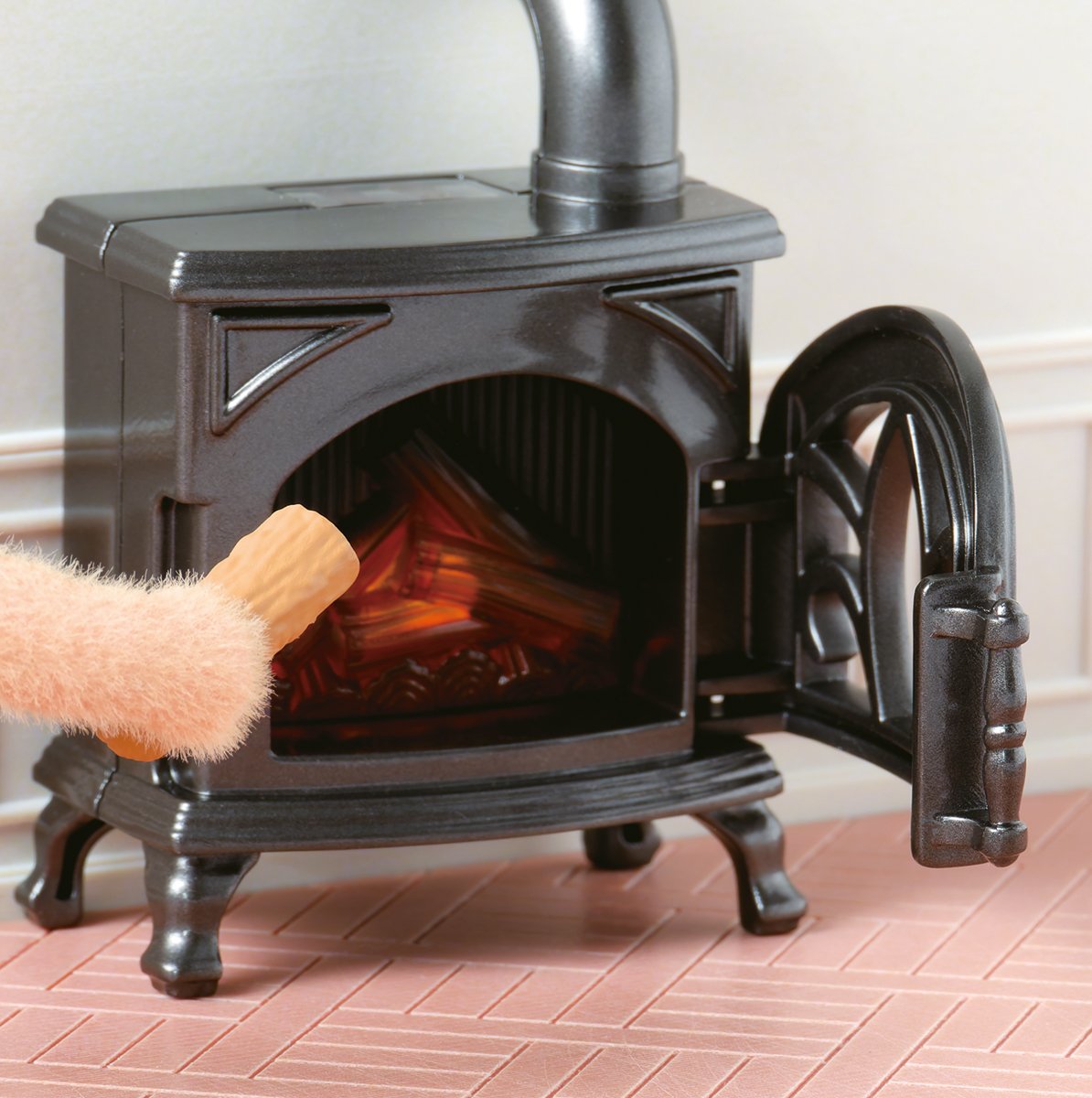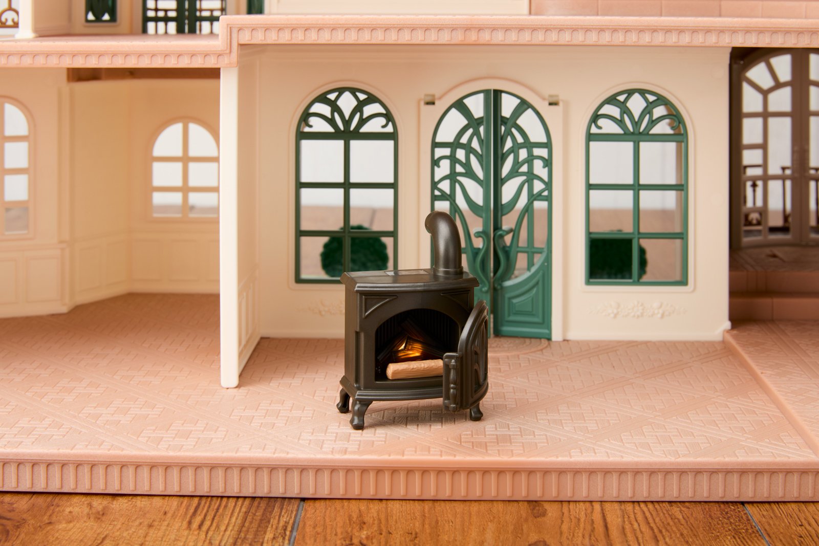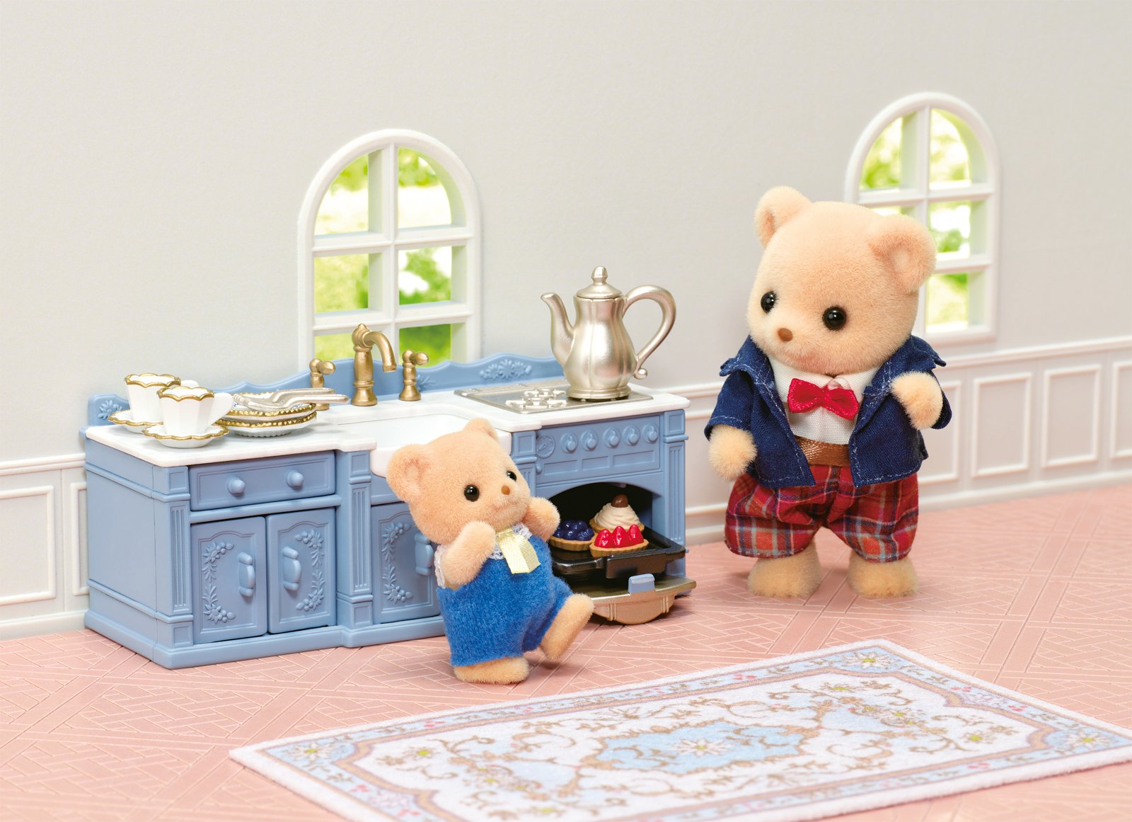 Elegantní jídelna, praktická sada nábytkových doplňků pro vybavení vily u řeky a dalších domů Sylvanian Families. Elegantní sada obsahuje: stůl, pět židlí, kamna na dřevo, kuchyňskou linku s dřezem a sporákem, koberec, nádobí, džbán a další okouzlující doplňky. Kamna mají speciální funkci, díky které oheň vypadá, jako by žhnul – nejsou potřeba žádné baterie. Součástí jsou i polínka, která se vejdou do kamen. Kuchyňská deska a deska stolu mají mramorový design. Dětskou jídelní židličku lze připevnit k jídelnímu stolu. Dětská židlička slouží zároveň jako houpací křeslo. Obsah sady: kuchyňská linka s dřezem, sporák s troubou, jídelní stůl, 4 jídelní židličky, dětská židlička, krb, lopata, koště, stojan na krbové nářadí, polínko, polínka, stojan na polínka, plech na pečení, borůvkový koláč, jahodový koláč, dort Mont Blanc, velký talíř, 2 malé talíře, konvice, 2 šálky, 2 podšálky, 2 vidličky a koberec. Sada je ideální doplněk k domečku – Vila s červenou střechou u řeky (5865). Baleno v krabičce. Rozměry balení: 18,5 x 29 x 7,5 cm. Věk: 3+