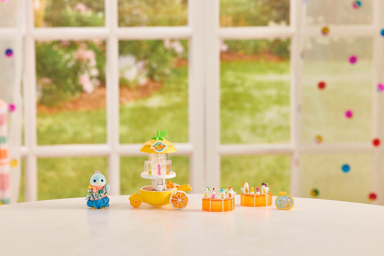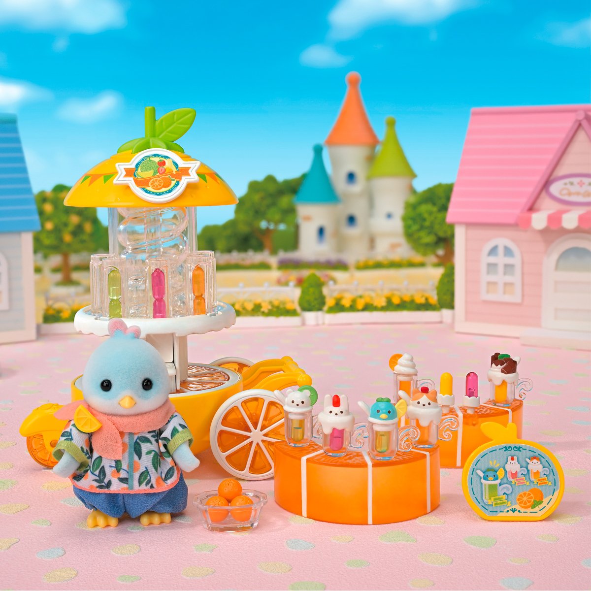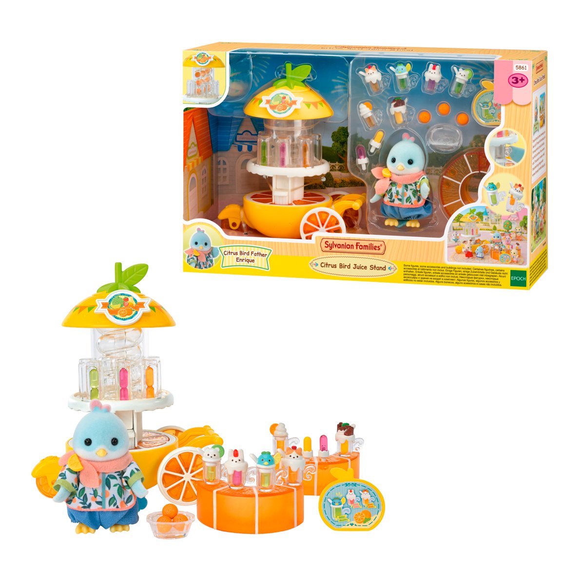 Tato sada představuje tatínka citrusových ptáčků se stánkem na výrobu citrusových nápojů a všemi potřebnými doplňky k výrobě džusů. Ptáček Enrique může připravovat a prodávat lahodné džusy z čerstvého ovoce, které mu přinese maminka Laura ze sady 5860. Enrique Citrus je veselý a optimistický tatínek. Neustále si pobrukuje písničku při přípravě lahodných nápojů. Stánek je v designu citrusového plodu, na vrchním štítu jsou zobrazeny různé druhy ovoce, ze kterého se připravují džusy. Po otevření víka lze vložit pomeranče do spirály, která je vytlačí. Ovoce lze uvolnit pomocí spouště na zadní straně stánku. Každý slot na džus pojme až 2 kusy. Otočením horní části se sloty otáčejí. K naplnění sklenice džusem stačí umístit sklenici na vyhrazené místo a zatlačit dopředu – džus sklouzne přímo do sklenice a lze jej ozdobit různými toppingy. Džusy lze umístit na tyčinky a vytvořit tak lahodné nanuky. Jeden ze stolků má 2 sloty pro umístění nanuků. Stánek společně s příslušenstvím lze poskládat dohromady a pohodlně ho tak přepravovat. Hračky Sylvanian Families rozvíjejí představivost a povzbuzují děti k hraní rolí. Hra s figurkami rozvíjí kreativitu a učí emocím vytvářením a vyprávěním příběhů založených na každodenních zážitcích a pozorování světa. Obsah sady: Stánek s výrobníkem nápojů, 2 stolky, 3 pomeranče s miskou, 6 sklenic, 2 tyčinky pro výrobu nanuků, 6 druhů toppingů, menu kartu, 14 ovocných džusů a figurku tatínka citrusových ptáčků. Baleno v krabičce. Rozměry balení: 17 x 27 x 9 cm. Rozměry stánku: 13 x 12 x 7,5 cm. Věk: 3+