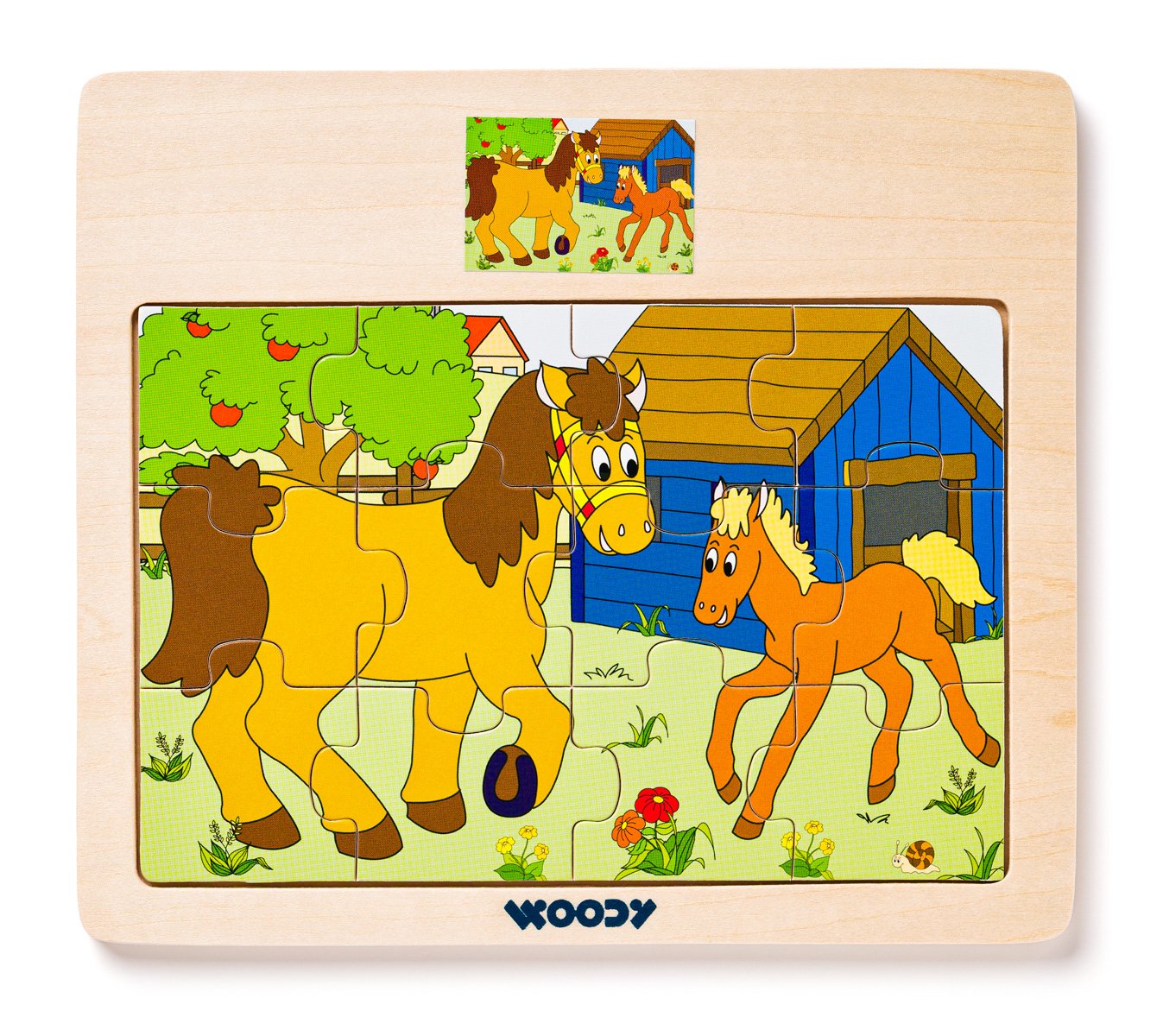 Klasické zámkové puzzle umístěné ve dřevěném rámu. Puzzle je navrženo tak, aby se snadno skládalo i malým dětem. Nenaleznete zde např.stejné dílky s plochou trávy či nebe, které jsou pro malé děti špatně identifikovatelné. Na každém dílku je zobrazena část celku nebo alespoň lísteček či šneček tak, aby se dítě snadno orientovalo. Do poznámky prosím uveďte, o jaký druh máte zájem.