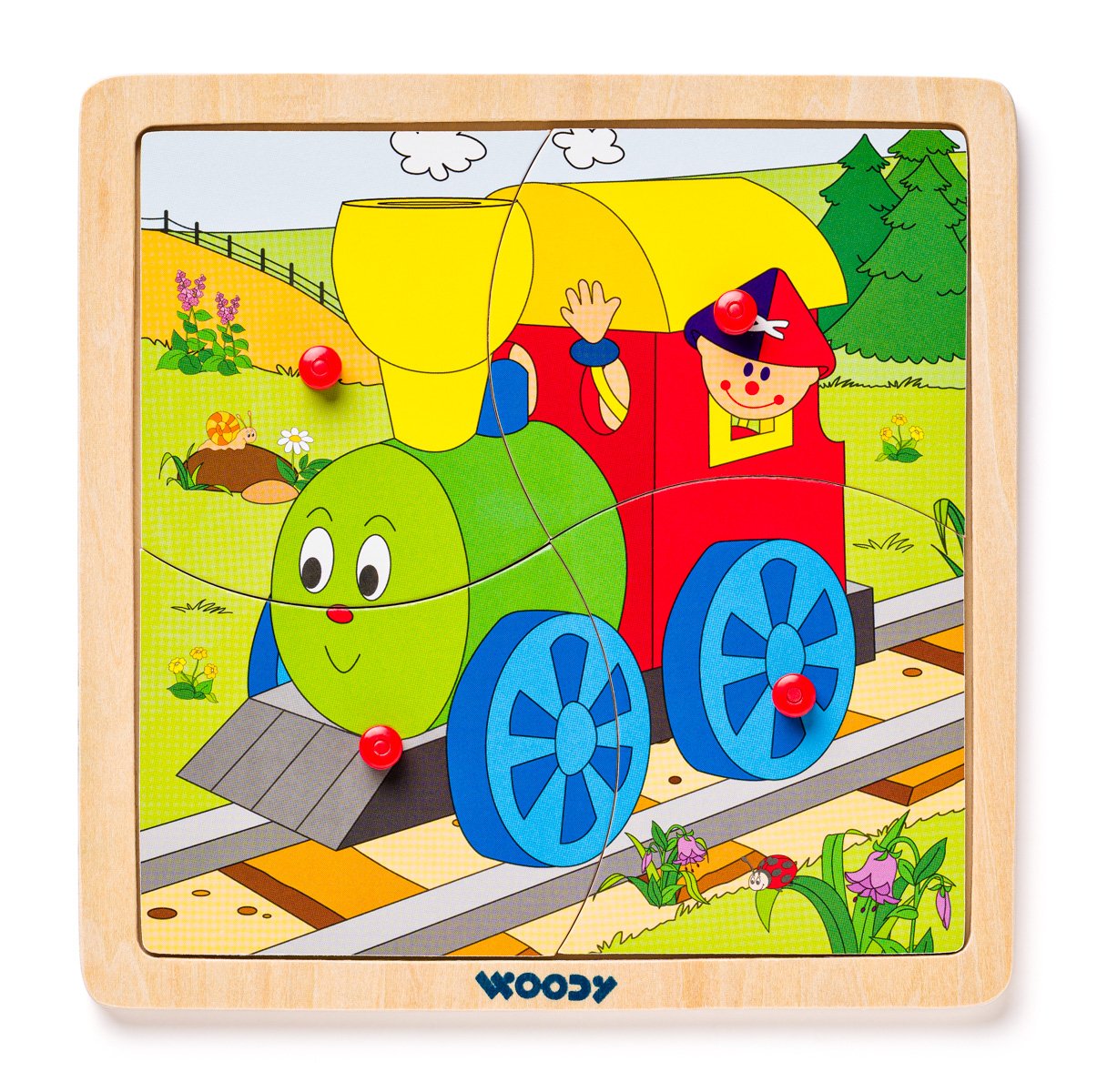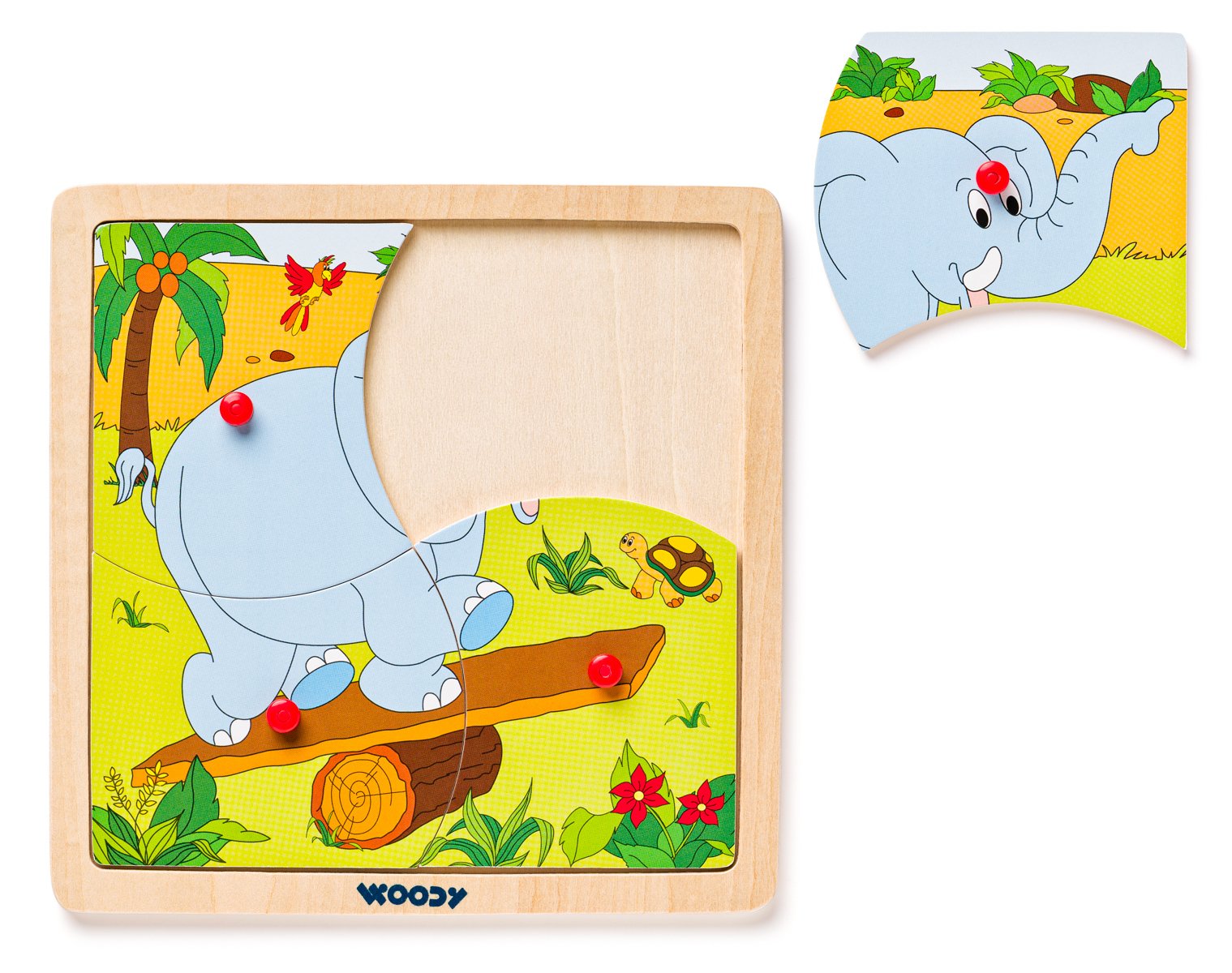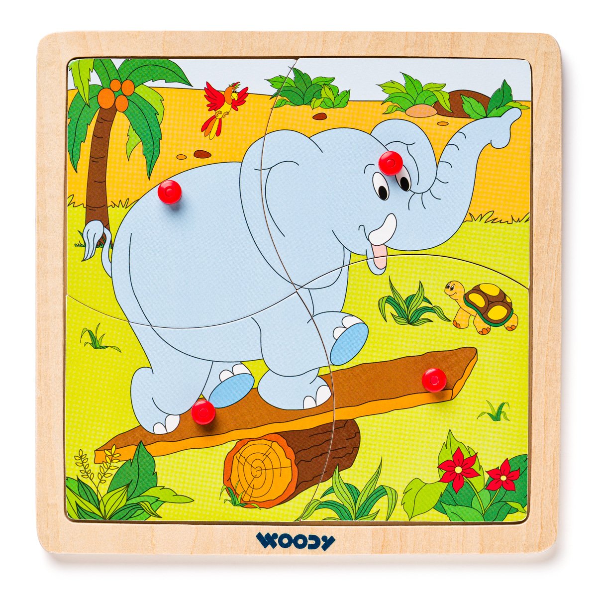 Nejjednodušší forma puzzle-skládaček pro nejmenší. Puzzle je vloženo do dřevné podložky s předseknutými 4 dílky. Každý dílek obsahuje praktickou úchytku pro snadné vytažení z destičky. V nabídce 4 motivy - kočička, pejsek, slon a mašinka. Určeno pro děti starší 3 let. Rozměr puzzle skládačky: 19,5 x 19,5 cm