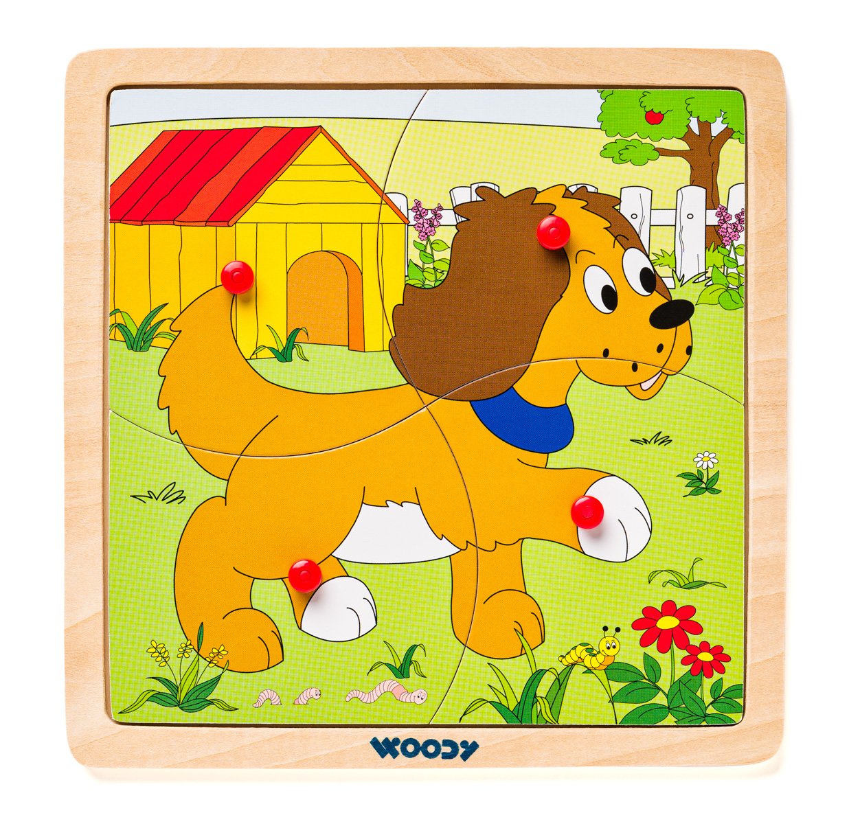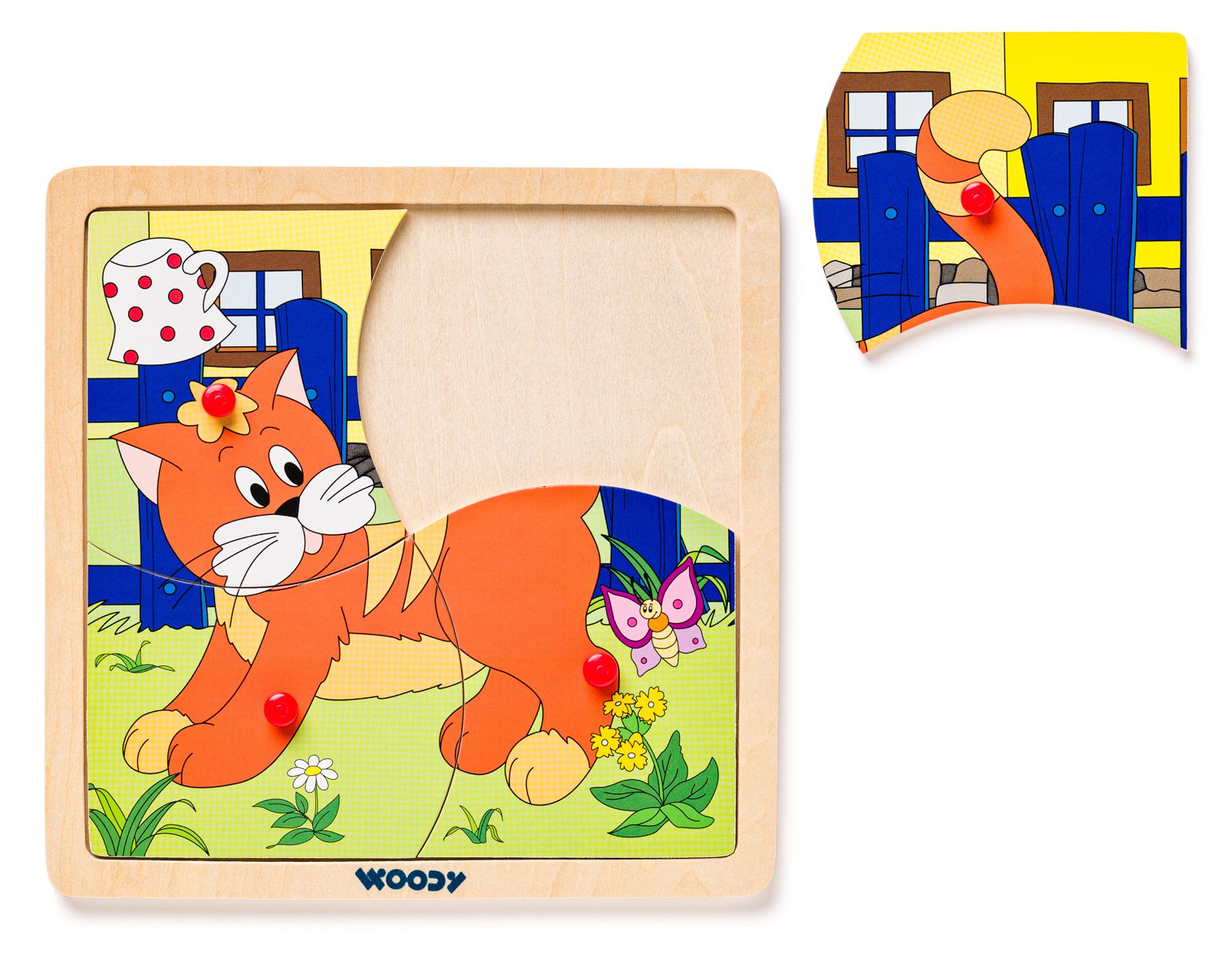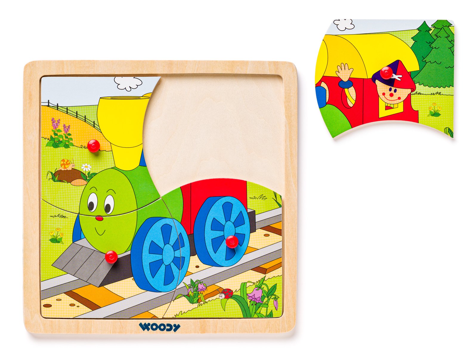 Nejjednodušší forma puzzle-skládaček pro nejmenší. Puzzle je vloženo do dřevné podložky s předseknutými 4 dílky. Každý dílek obsahuje praktickou úchytku pro snadné vytažení z destičky. V nabídce 4 motivy - kočička, pejsek, slon a mašinka. Určeno pro děti starší 3 let. Rozměr puzzle skládačky: 19,5 x 19,5 cm