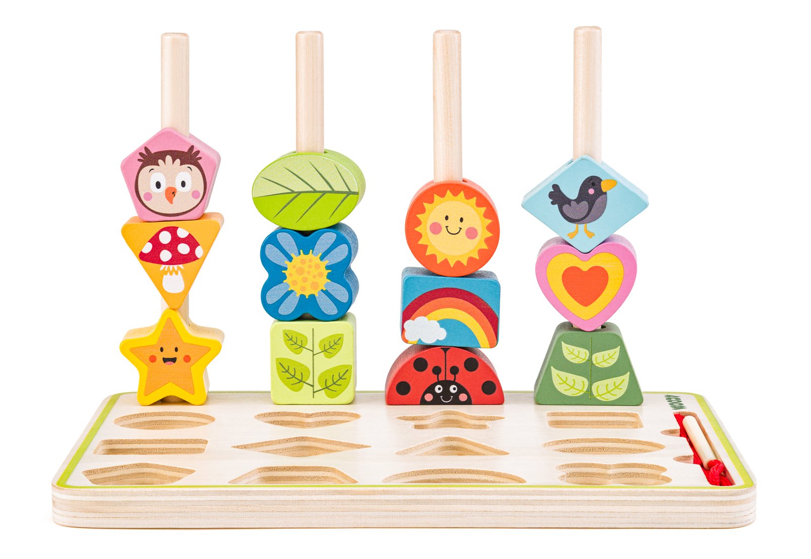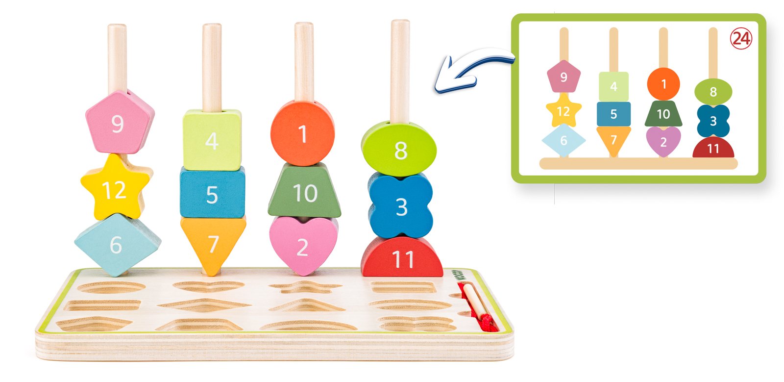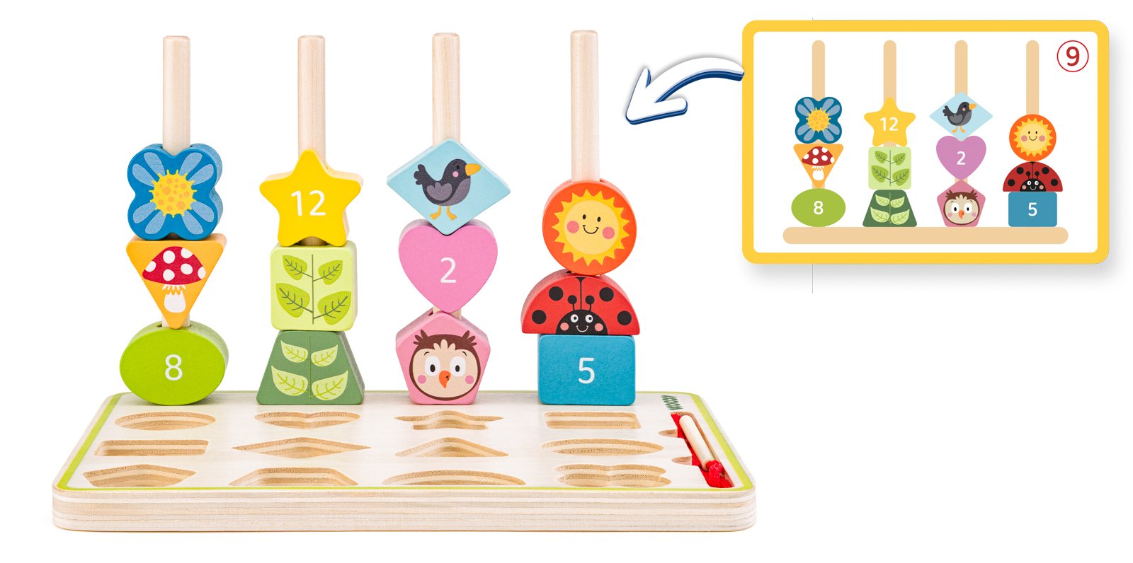 Logic destička s lesními zvířátky v českém designu je dřevěná didaktická hračka. Je vhodná pro děti od 2 let a nabízí více způsobů hry podle věku a dovedností dítěte. Součástí hračky je 12 karet s úkoly, které nabízejí 24 různých způsobů, jak poskládat dřevěné korálky na kolíky. 12 dřevěných korálků různých tvarů s přírodními motivy z jedné strany a s číslicemi z druhé strany. Děti se učí vnímat pořadí, porovnávat tvary a hledat správné řešení podle předlohy. Další aktivitou je navlékání korálků pomocí dřevěné jehly s provázkem, která rozvíjí jemnou motoriku, koordinaci ruka–oko a soustředění. Základna obsahuje tvarové výřezy, kam se ukládají korálky a dětem pomáhají s orientací při skládání. Jemné ilustrace inspirované českou přírodou a harmonické barvy dělají z hračky nejen vzdělávací pomůcku, ale i krásný doplněk do dětského pokojíčku. Hračka je vyrobena z kvalitního jalovcového dřeva a překližky, má stabilní základnu a hladké, zaoblené hrany pro bezpečné hraní. Obsahuje 14 dílů. Rozměry hračky: 23 x 42 x 22,6 cm. Rozměry balení: 23 x 22,6 x 42 cm. Věk: 2+