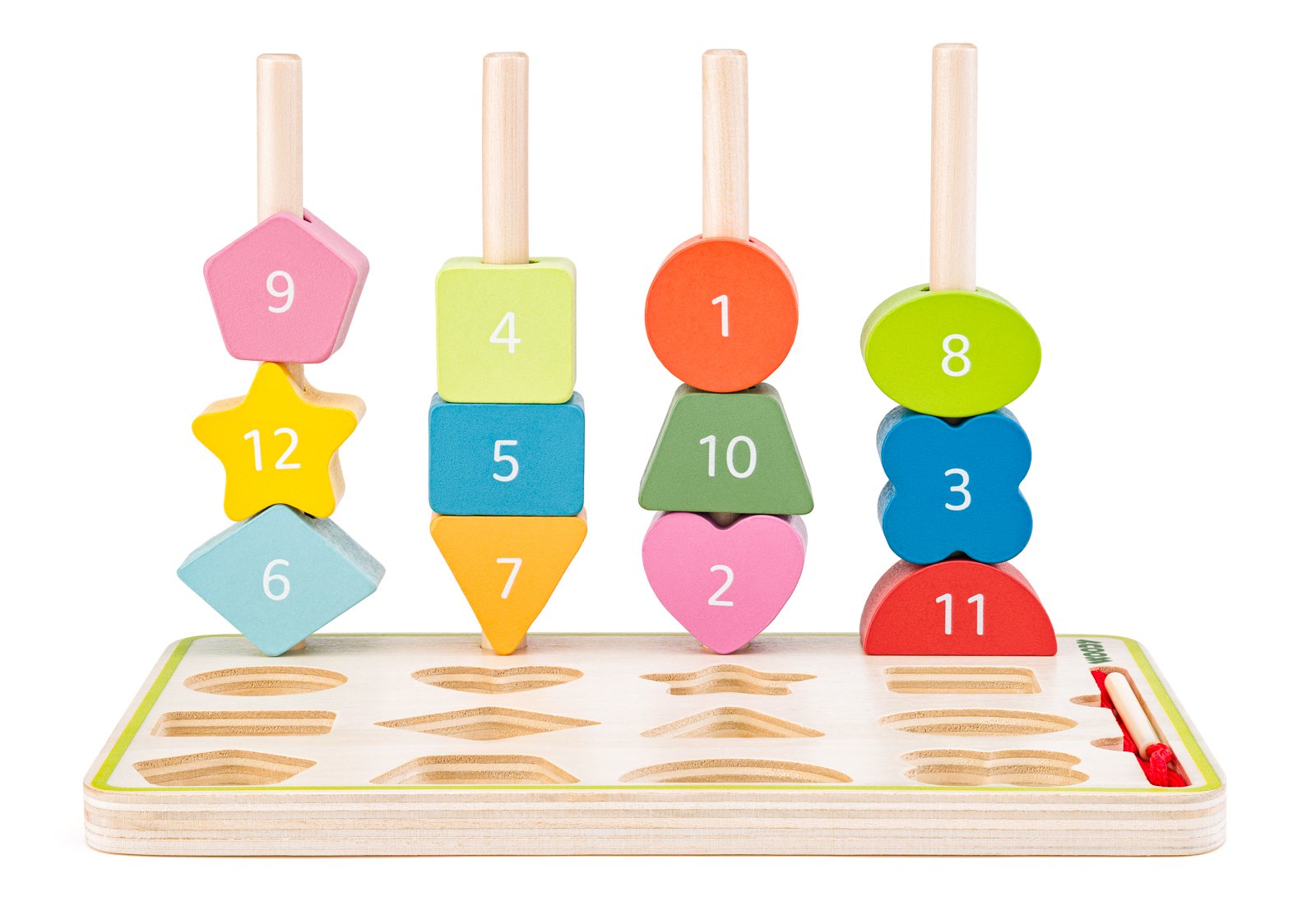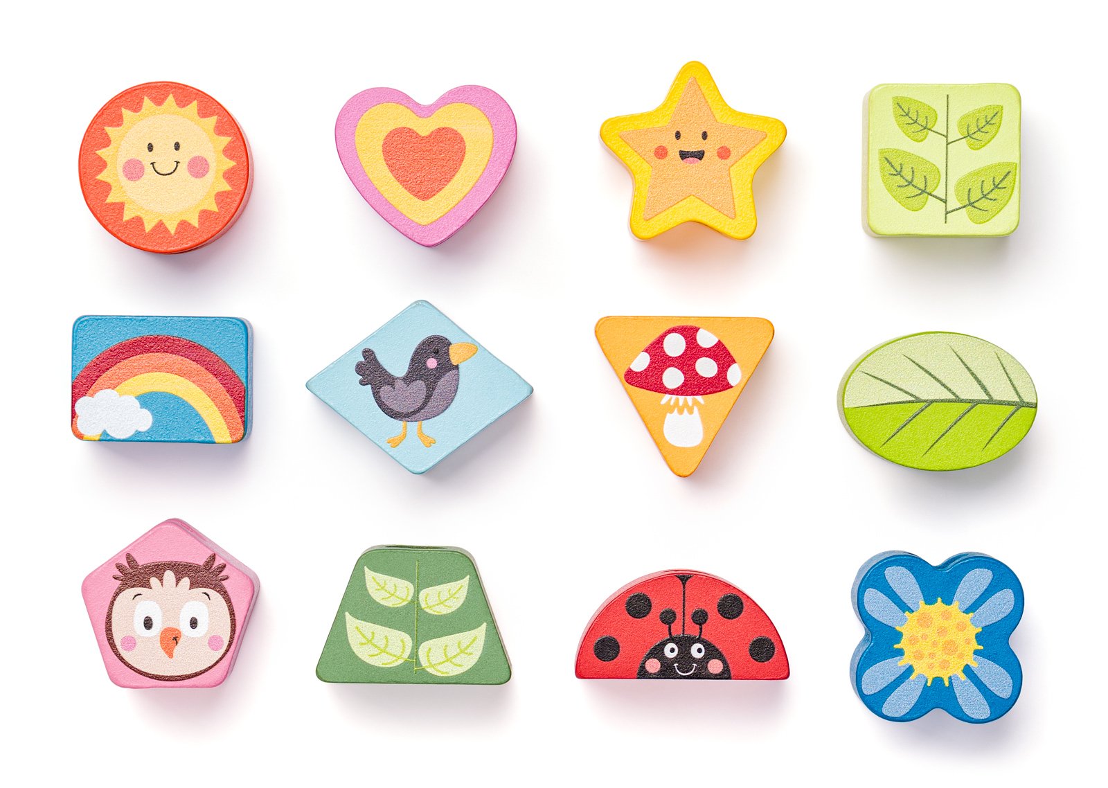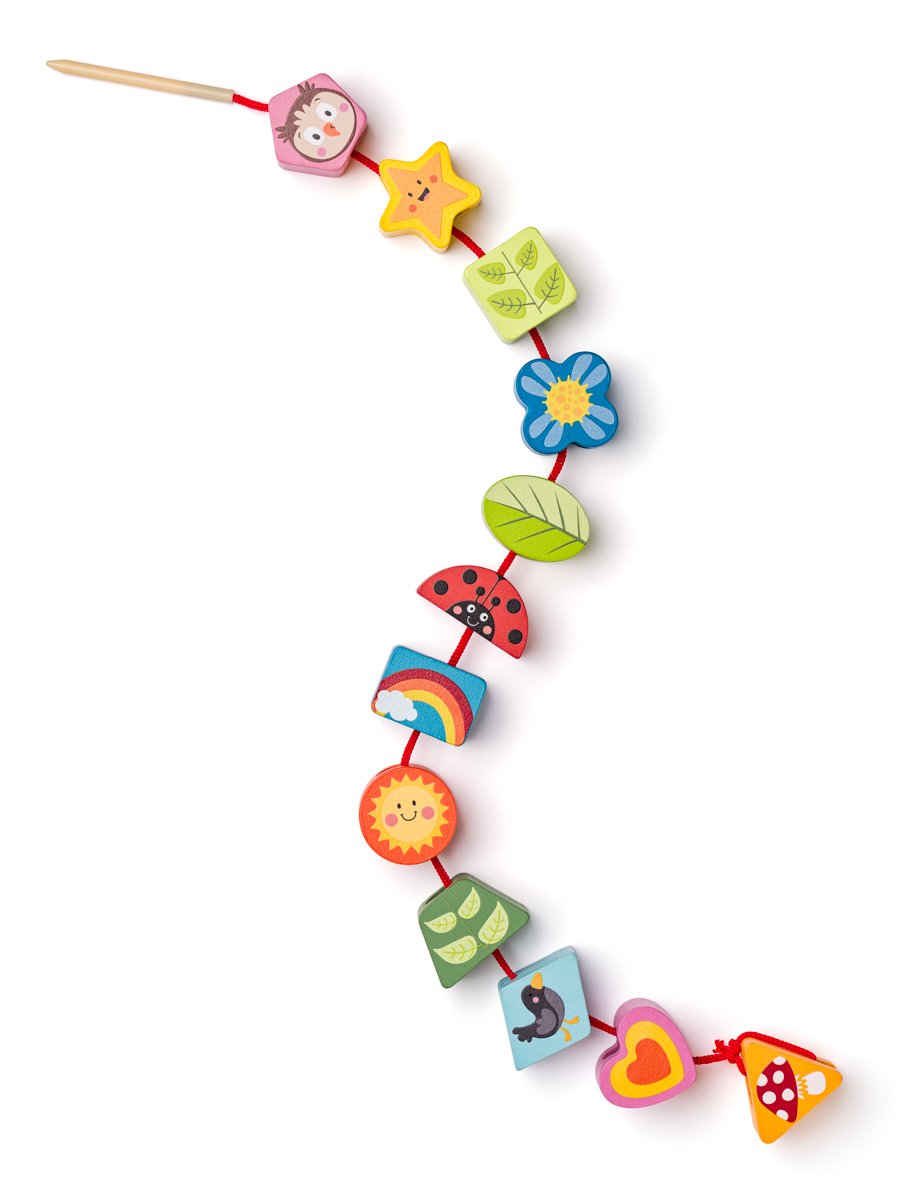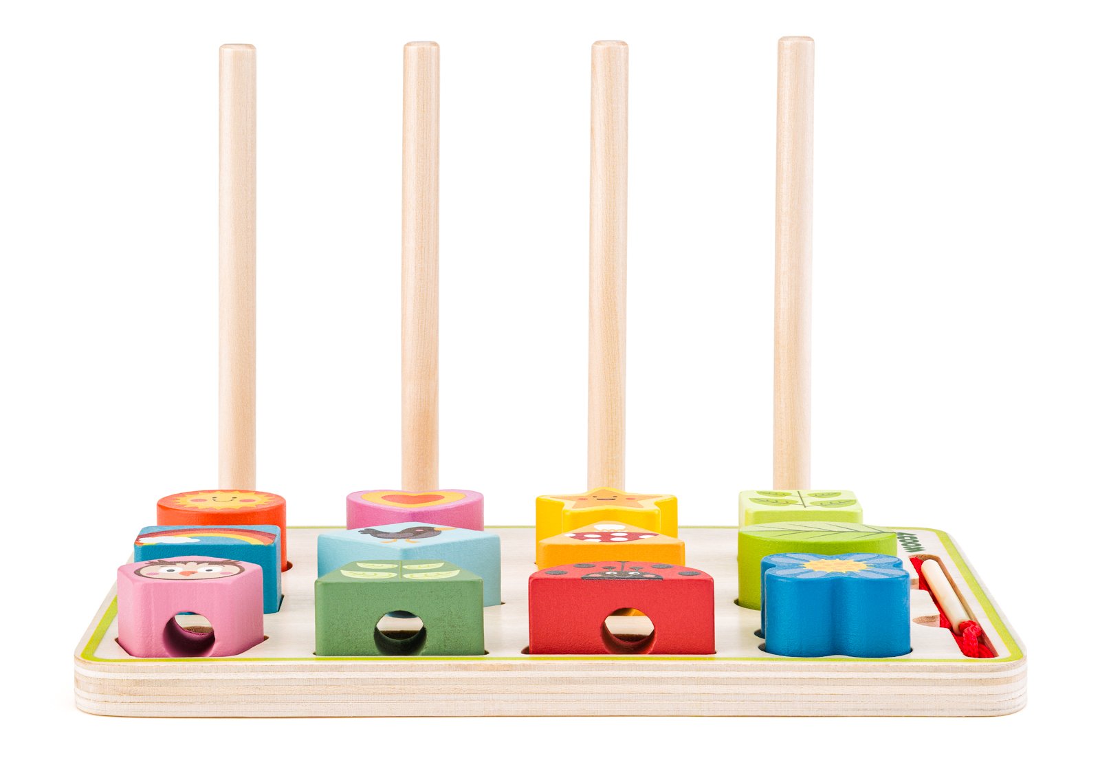 Logic destička s lesními zvířátky v českém designu je dřevěná didaktická hračka. Je vhodná pro děti od 2 let a nabízí více způsobů hry podle věku a dovedností dítěte. Součástí hračky je 12 karet s úkoly, které nabízejí 24 různých způsobů, jak poskládat dřevěné korálky na kolíky. 12 dřevěných korálků různých tvarů s přírodními motivy z jedné strany a s číslicemi z druhé strany. Děti se učí vnímat pořadí, porovnávat tvary a hledat správné řešení podle předlohy. Další aktivitou je navlékání korálků pomocí dřevěné jehly s provázkem, která rozvíjí jemnou motoriku, koordinaci ruka–oko a soustředění. Základna obsahuje tvarové výřezy, kam se ukládají korálky a dětem pomáhají s orientací při skládání. Jemné ilustrace inspirované českou přírodou a harmonické barvy dělají z hračky nejen vzdělávací pomůcku, ale i krásný doplněk do dětského pokojíčku. Hračka je vyrobena z kvalitního jalovcového dřeva a překližky, má stabilní základnu a hladké, zaoblené hrany pro bezpečné hraní. Obsahuje 14 dílů. Rozměry hračky: 23 x 42 x 22,6 cm. Rozměry balení: 23 x 22,6 x 42 cm. Věk: 2+