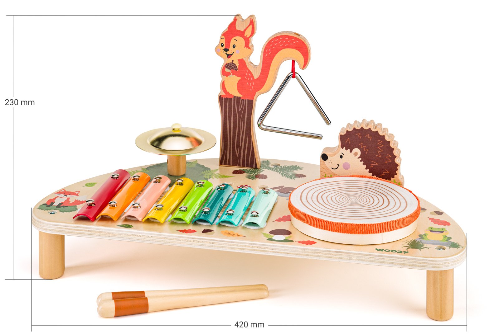 Muzikální centrum s hudebními nástroji od české designérky je dřevěná hudební hračka, která spojuje rytmus, objevování zvuků i rozvoj motoriky v jednom. Je vhodná pro děti od 2 let a podporuje přirozený vztah k hudbě hravou formou. Děti mohou objevovat různé zvuky a rytmy díky kombinaci pěti nástrojů: barevný xylofon, činel, triangl, bubínek a guiro – ježek. Součástí jsou dřevěné paličky, které slouží ke hře na hudební nástroje. Hudební centrum zdobí jemné ilustrace lesních zvířátek – veverka, ježek, liška a další motivy přírody. Hračka rozvíjí smysl pro rytmus a hudební sluch, jemnou motoriku a koordinaci. Muzikální centrum je vyrobeno z kvalitního jalovcového dřeva, překližky a kovu. Má stabilní konstrukci a zaoblené hrany pro bezpečné hraní. Rozměry hračky: 23 x 42 x 22,6 cm. Rozměry balení:23 x 22,6 x 42 cm. Věk: 2+