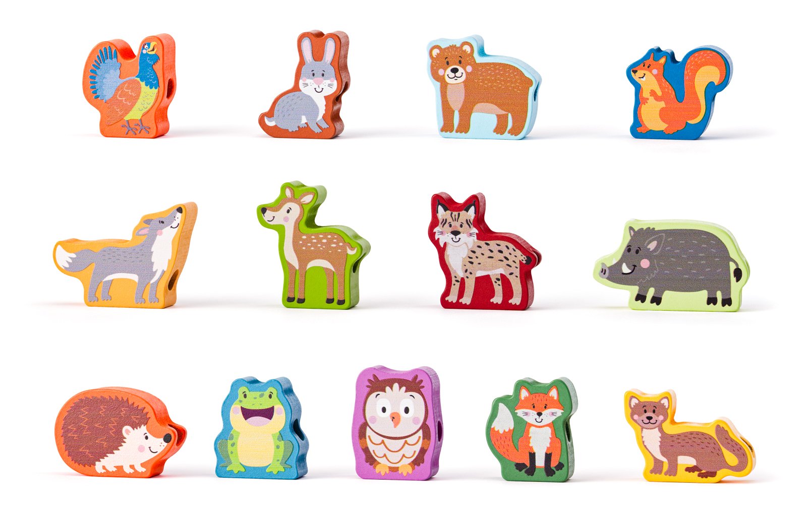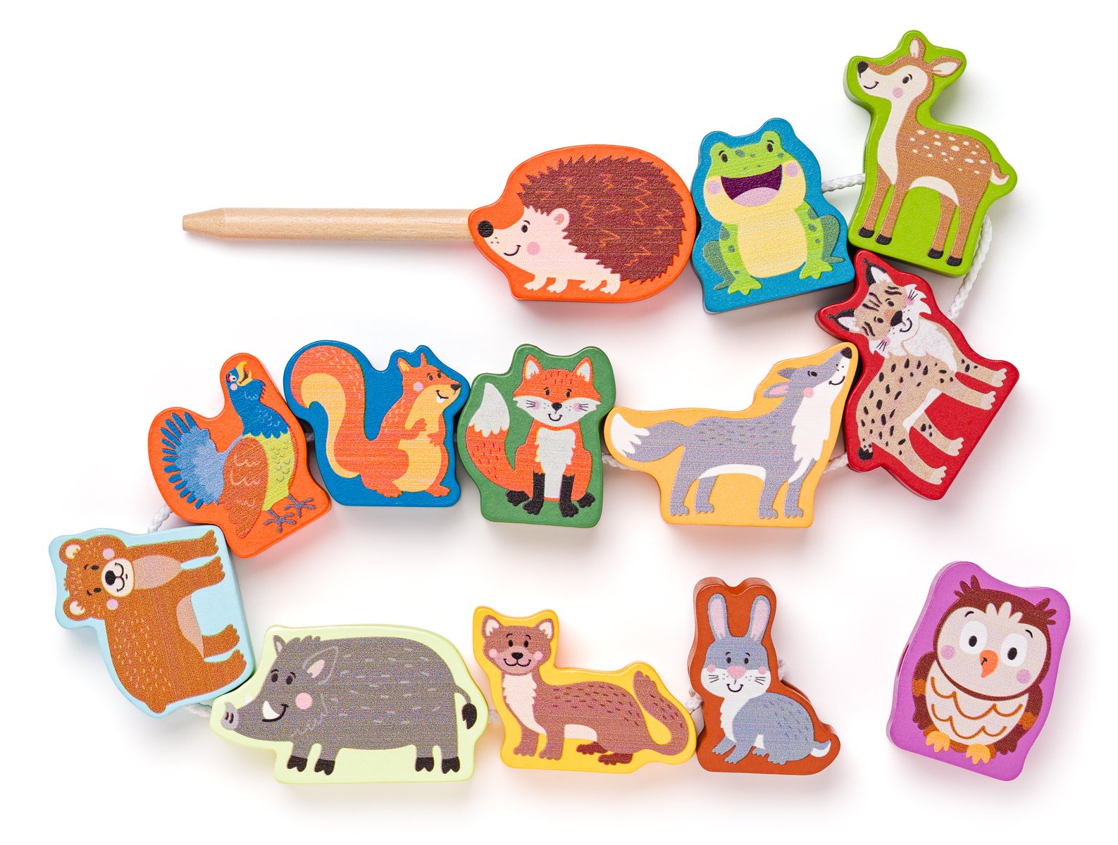 Objevte hravé navlékání s motivy českého lesa. Navlékací korále – Lesní zvířata jsou dřevěná didaktická hračka, která podporuje jemnou motoriku, soustředění i poznávání zvířat. Vhodné pro děti od 2 let. Sada obsahuje 13 oboustranných korálků se zvířátky: krocan, zajíc, medvěd, veverka, vlk, srna, rys, divoké prasátko, ježek, žabka, sova, liška a kuna. Děti poznávají lesní zvířata, rozšiřují slovní zásobu a vytvářejí vlastní příběhy při navlékání. Součástí je 1 dřevěná jehla se šňůrkou, která usnadňuje provlékání korálků. Vyrobeno z kvalitního jalovcového dřeva a překližky s hladkým opracováním. Navlékací korále – Lesní zvířata jsou ideální první navlékací hračkou pro malé objevitele, kteří milují zvířátka a tvoření. Podporuje rozvoj jemné motoriky, koordinace ruka-oko, soustředění a trpělivosti, představivost a vyprávění příběhů. Rozměry balení: 11,5 x 14,8 x 4 cm. Věk: 2+